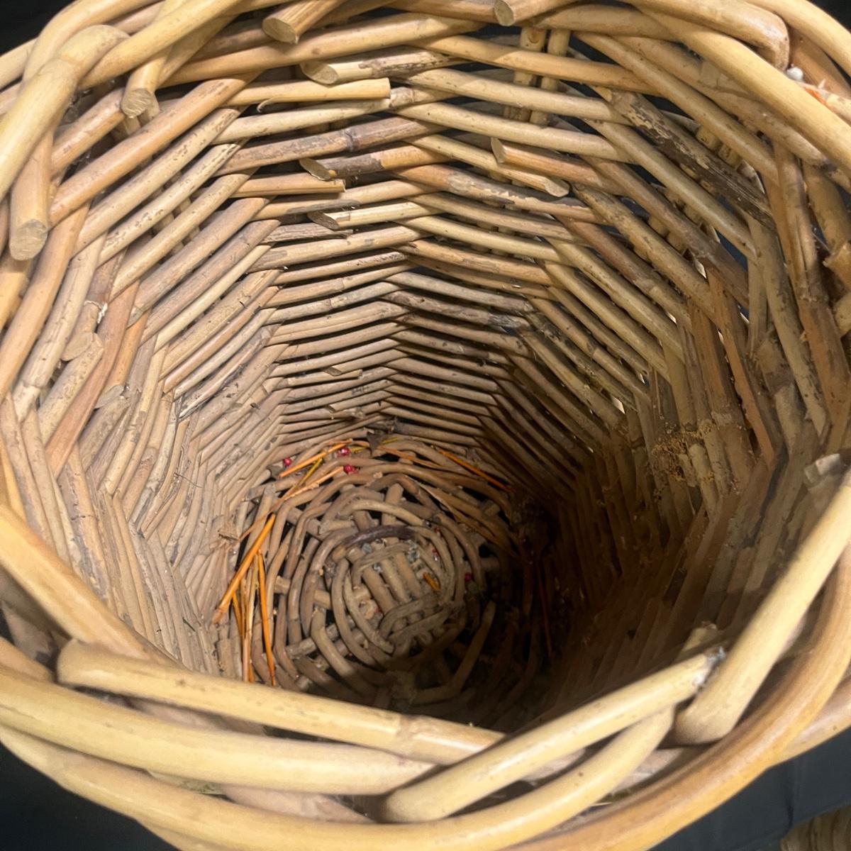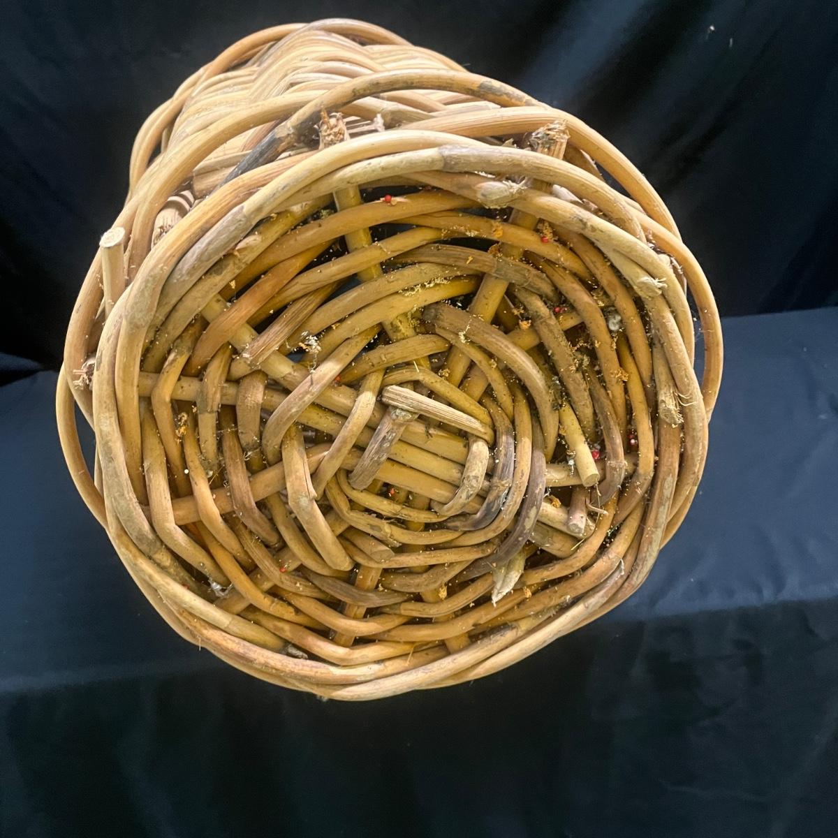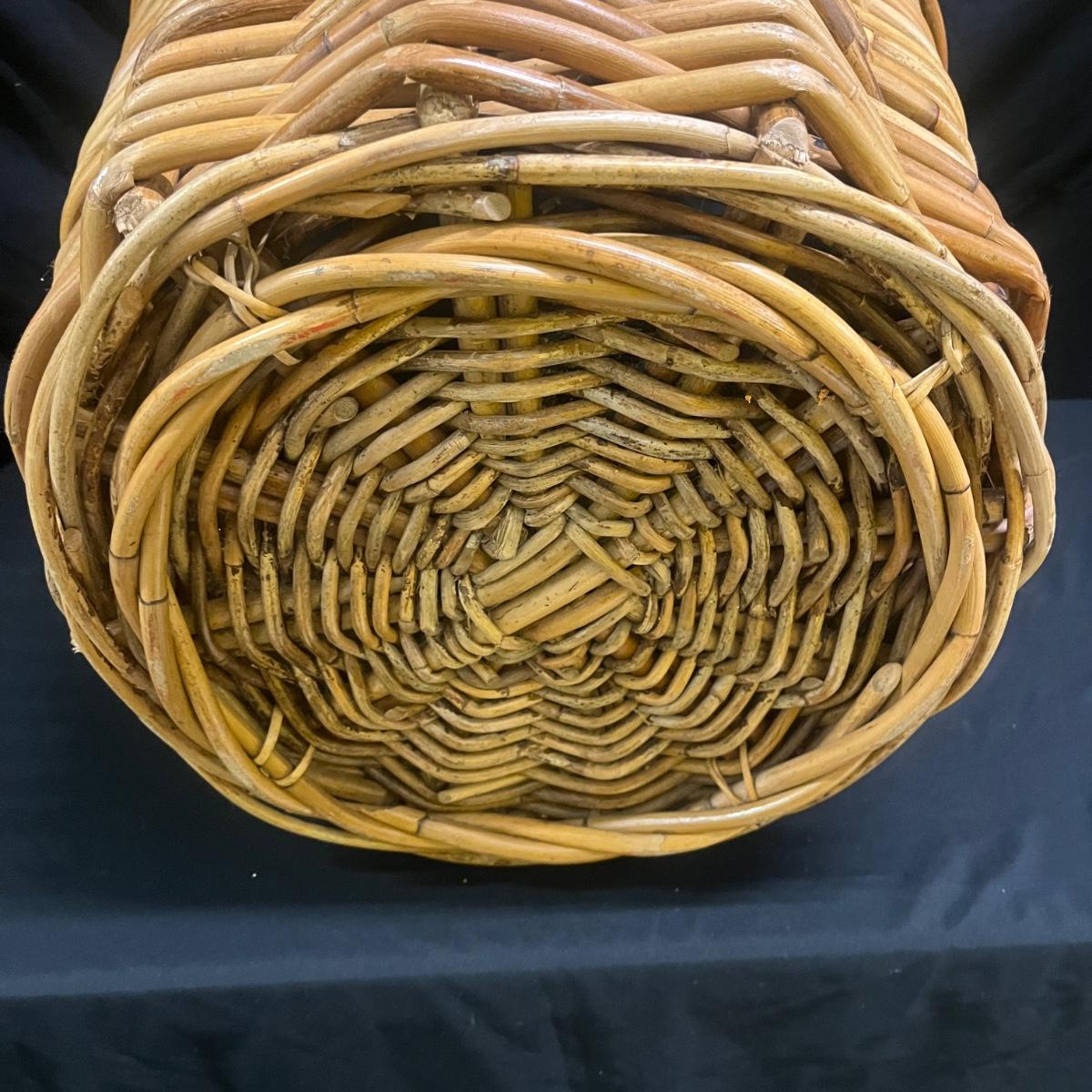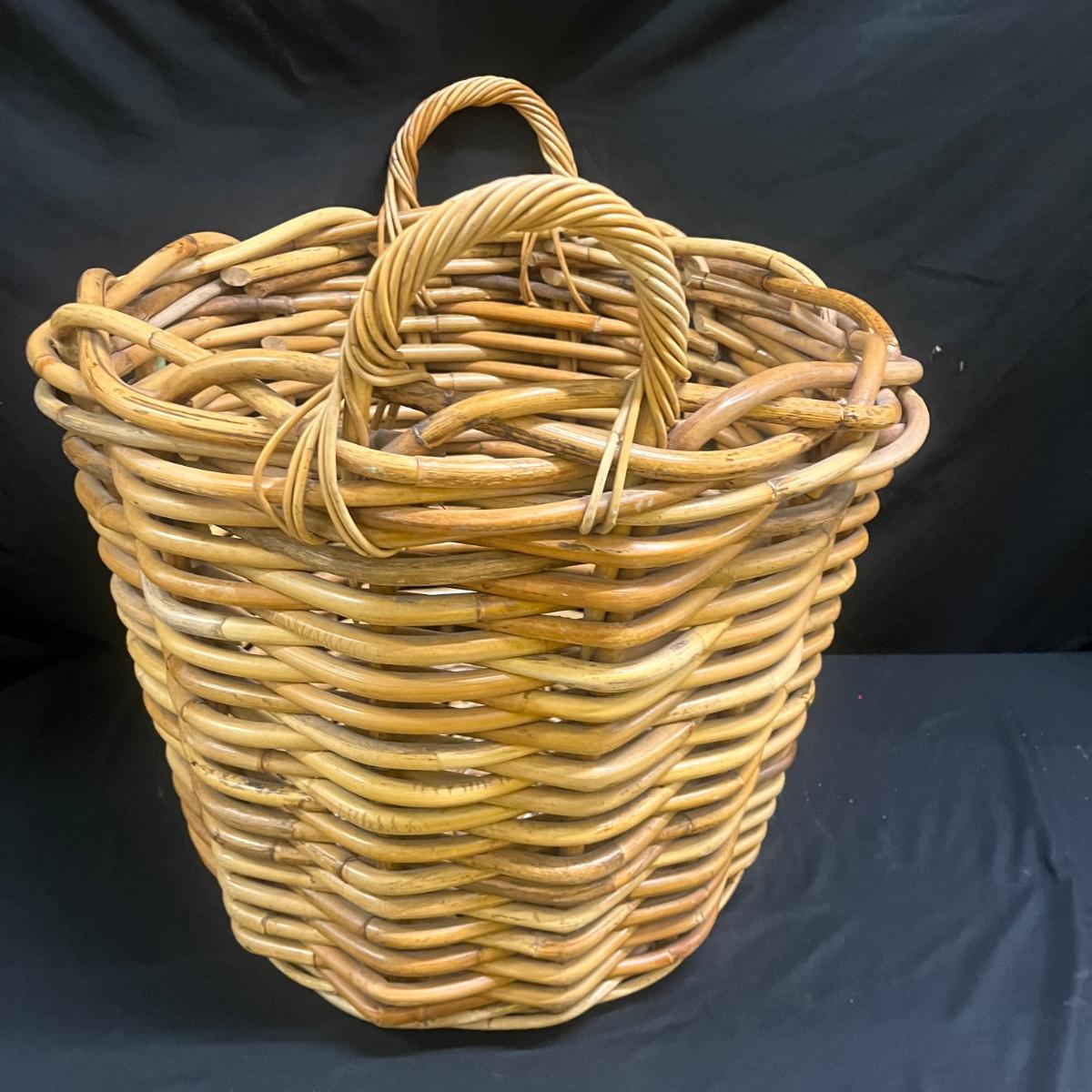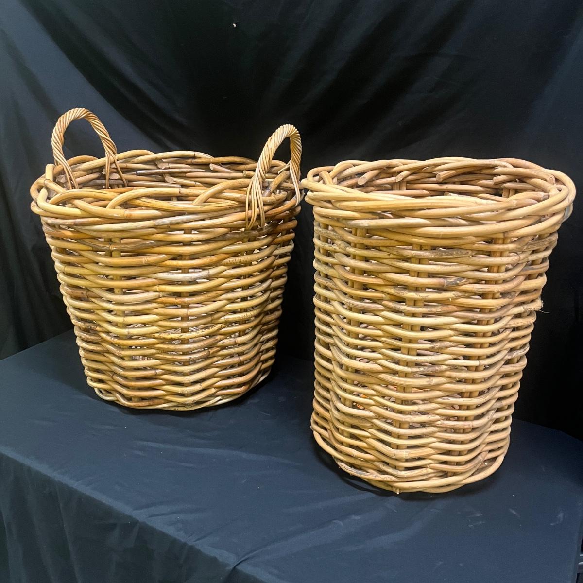 Lot includes two wicker baskets that appear to be woven from rattan. The widest basket with handles measures 21”D x 22”H. There is some surface debris in the bottoms of each basket. Please see photos for details.