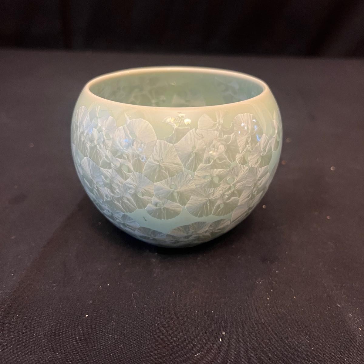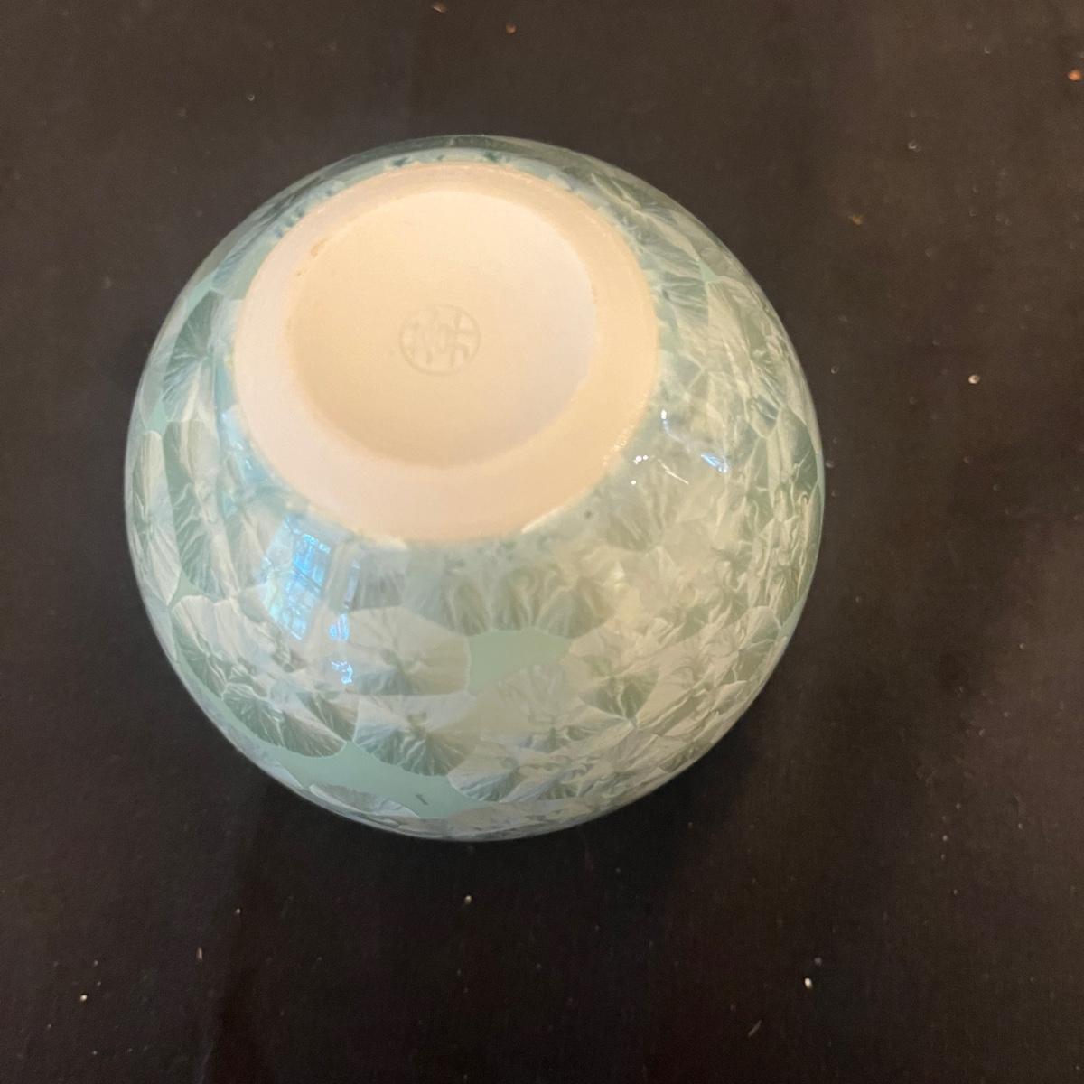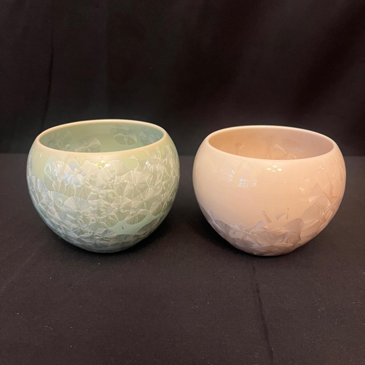 These two Yunomi Japanese tea cups have beautiful and unique crystal glazes. Both are pale colors, one a light green and the other a pale pink. Both cups are signed. Cups measure 3.5”D x 3”H.