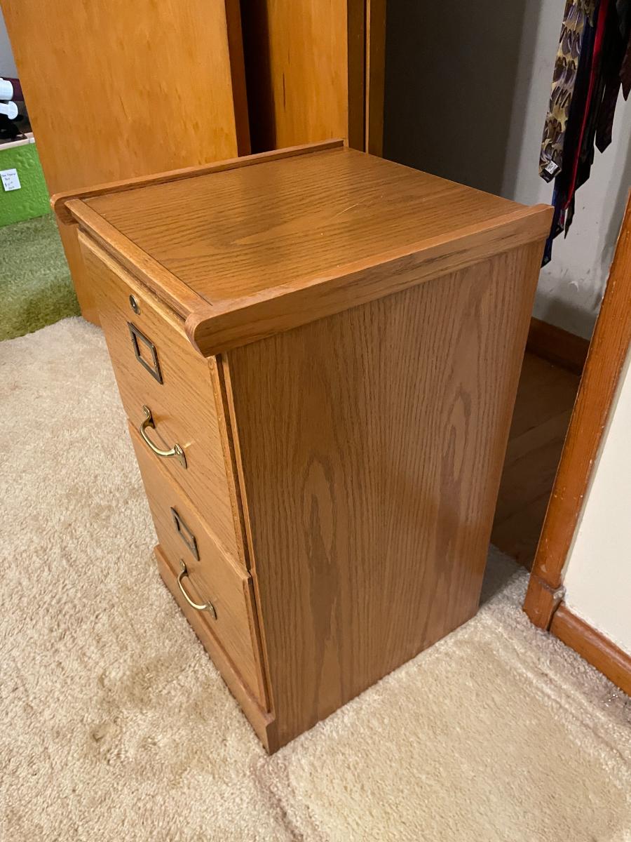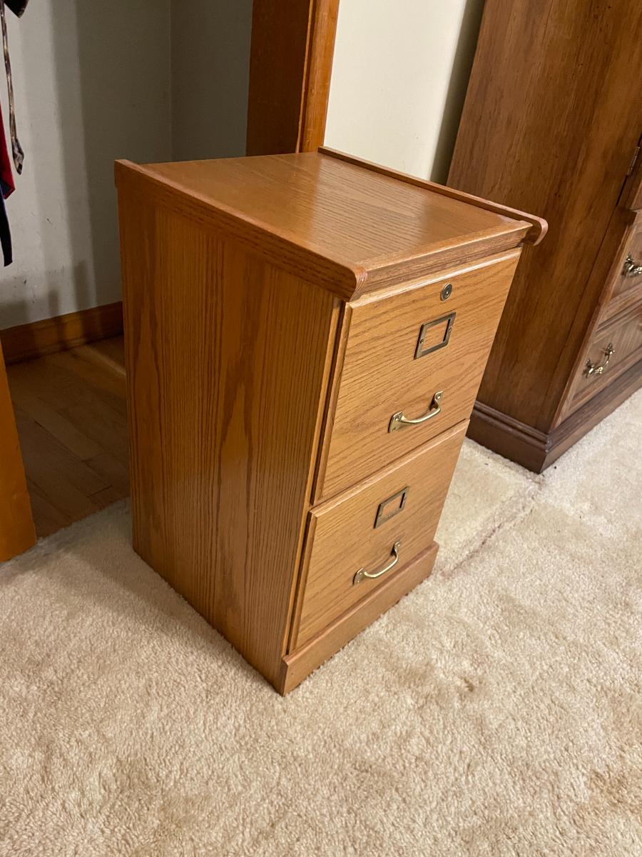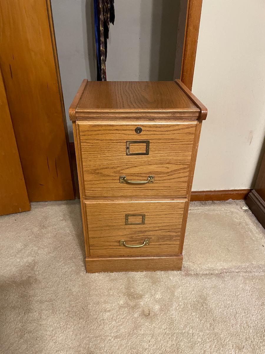 Two-drawer wooden file cabinet constructed of oak with a natural finish. Features brass handles and a built-in locking mechanism for secure storage. Dimensions are approximately 18.5 inches in width, 25.5 inches in height, and 22 inches in depth. Suitable for letter or legal-size file storage.