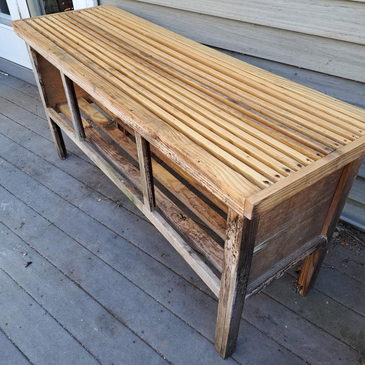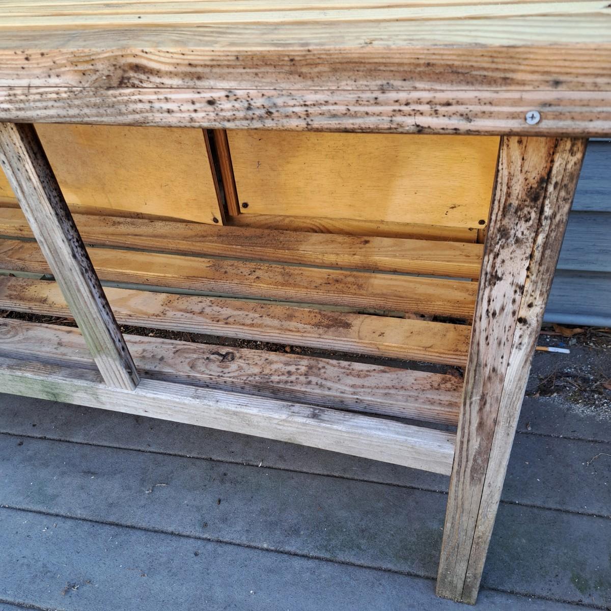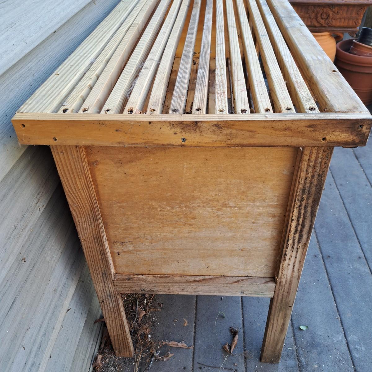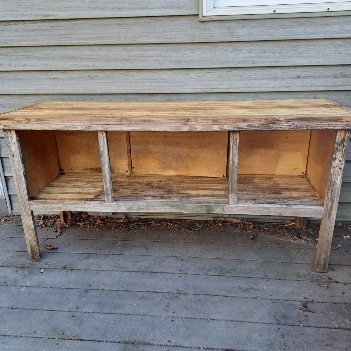A very nice two-tier wooden potting table measures 62" x 20" x 30"H. Wood slats on top and bottom. Closed sides. Very sturdy; has a bit of mold splotches from past potting projects - easily removed. Center panel on back of table needs to be re-nailed as shown. Local pickup only. Table is quite heavy so be sure to bring extra help to move.