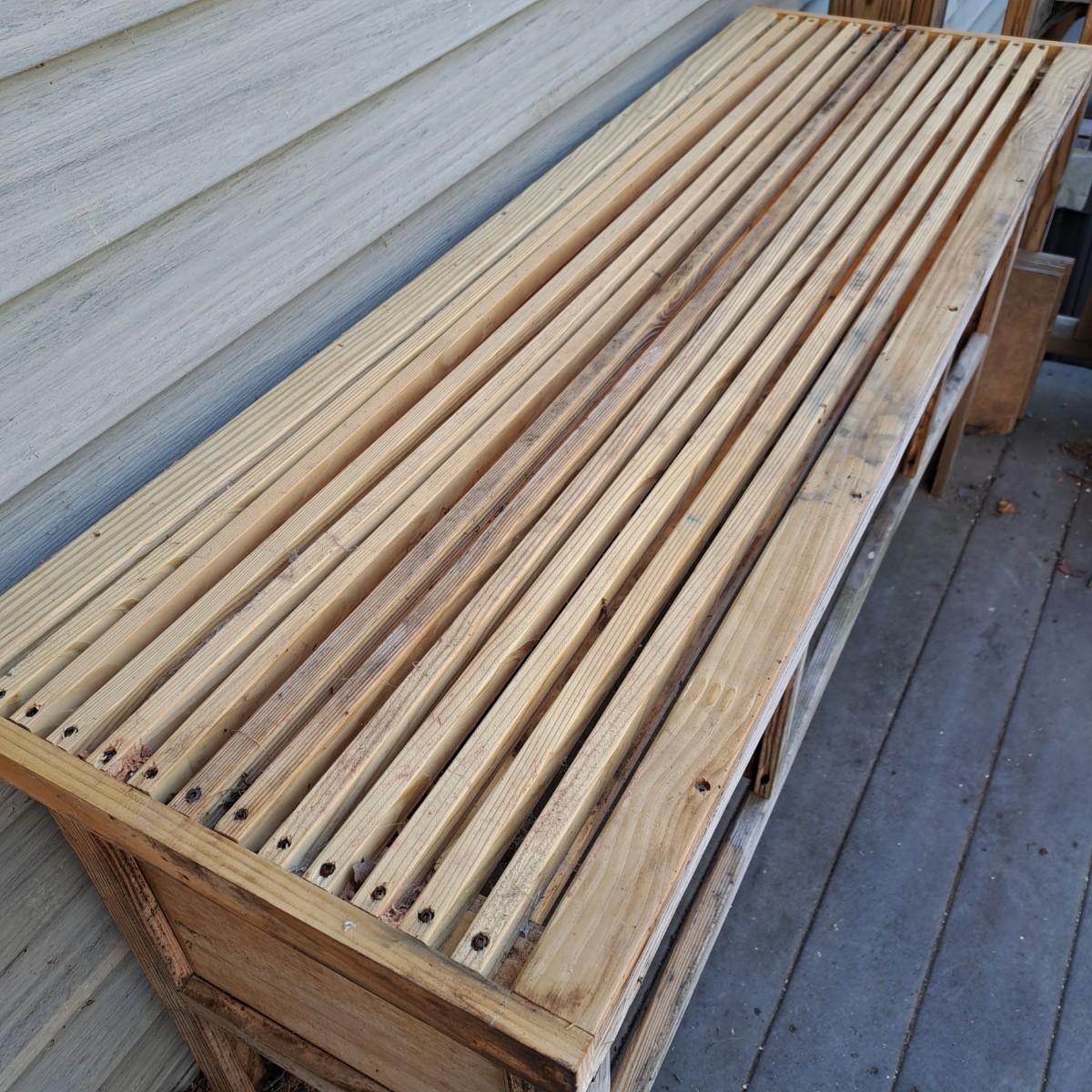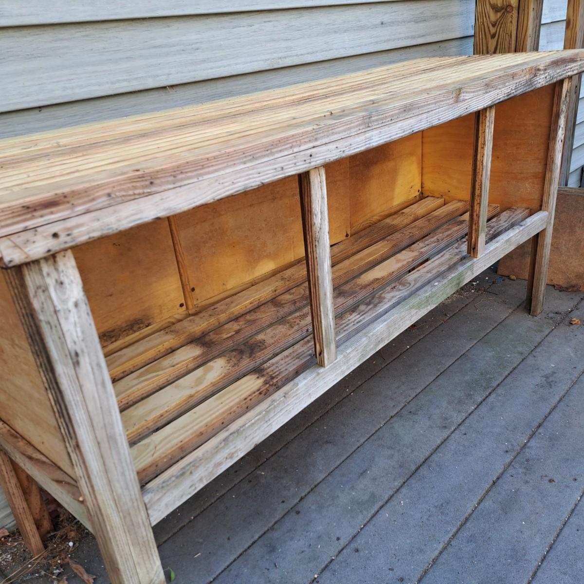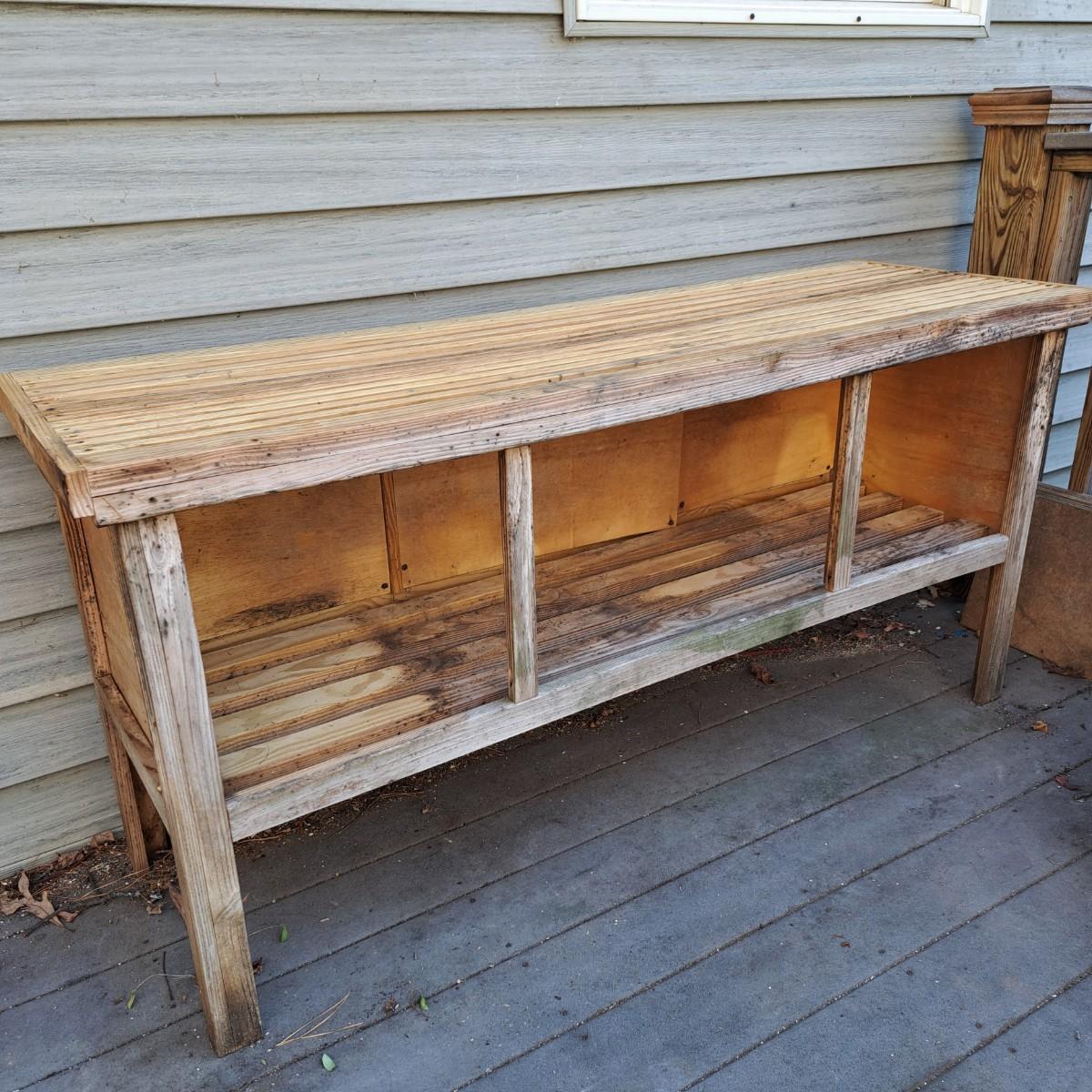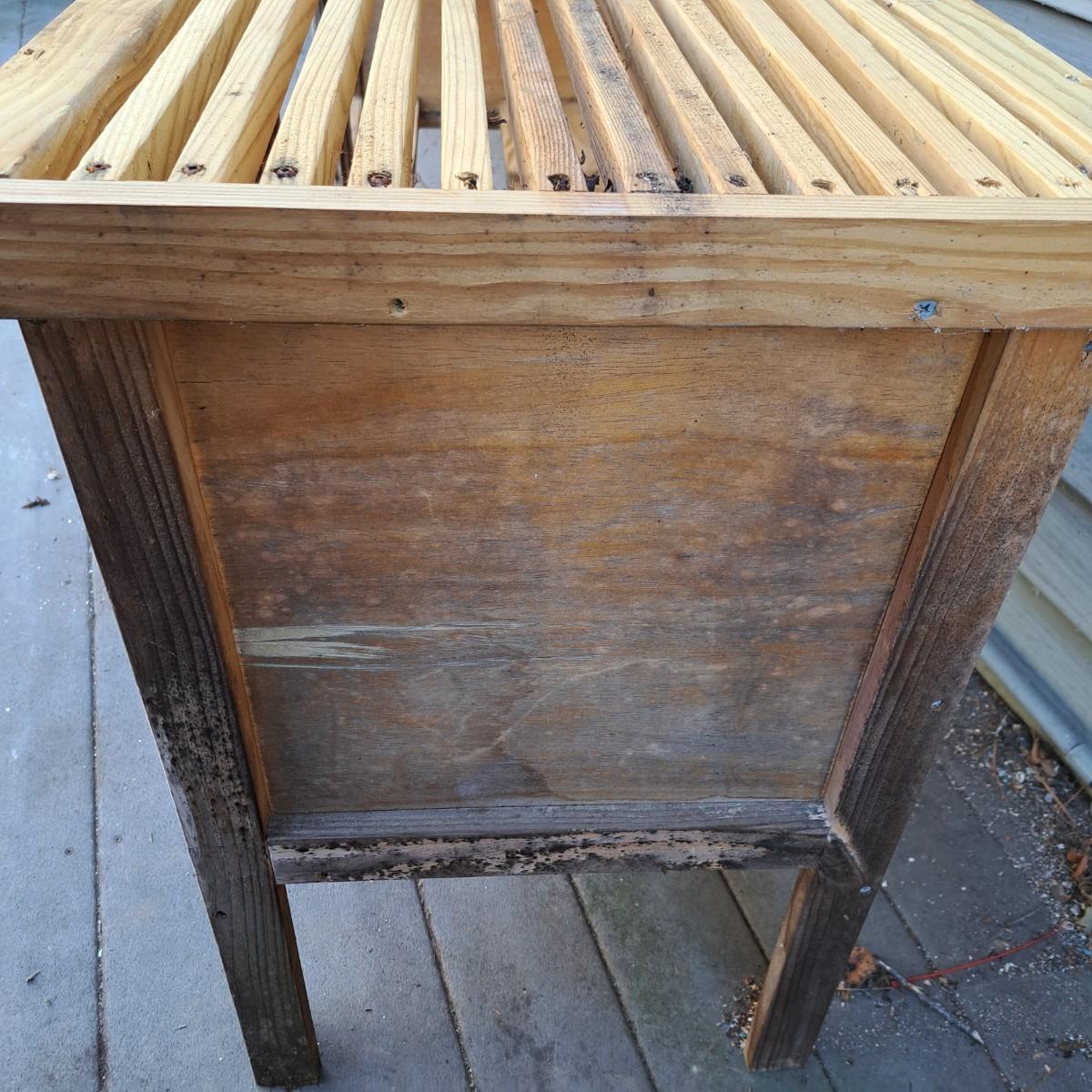 A very nice two-tier wooden potting table measures 62" x 20" x 30"H. Wood slats on top and bottom. Closed sides. Very sturdy; has a bit of mold splotches from past potting projects - easily removed. Center panel on back of table needs to be re-nailed as shown. Local pickup only. Table is quite heavy so be sure to bring extra help to move.