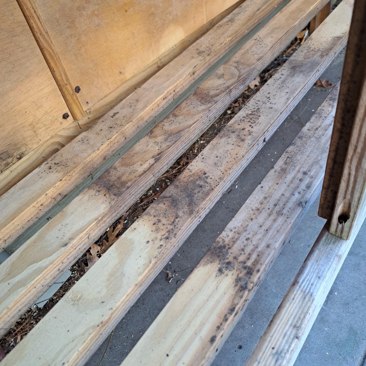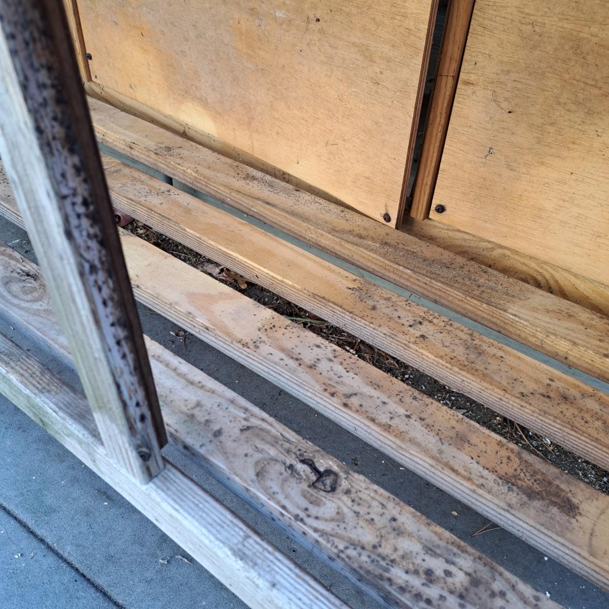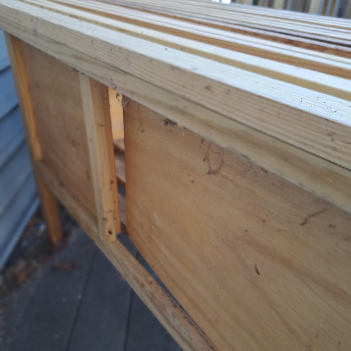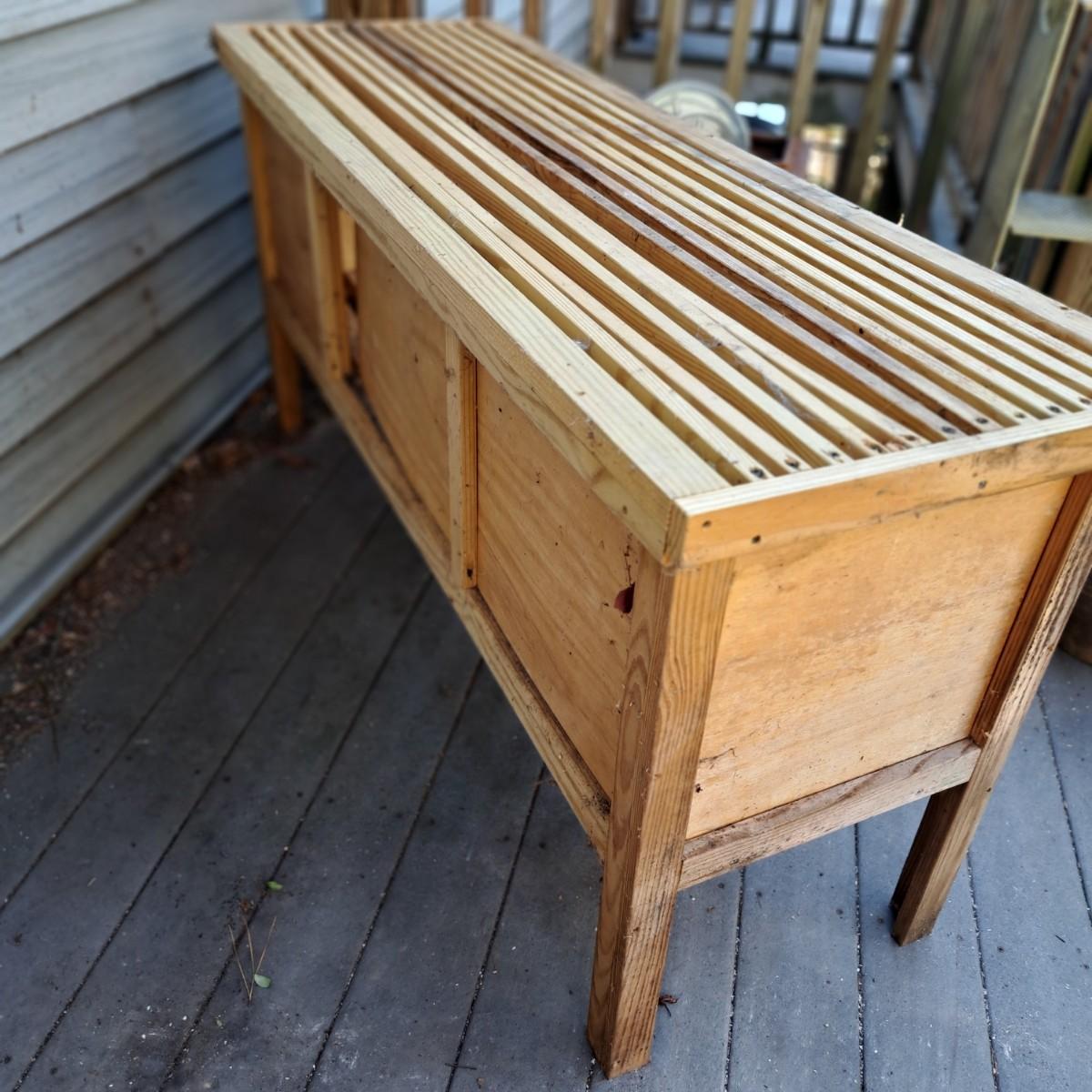 A very nice two-tier wooden potting table measures 62" x 20" x 30"H. Wood slats on top and bottom. Closed sides. Very sturdy; has a bit of mold splotches from past potting projects - easily removed. Center panel on back of table needs to be re-nailed as shown. Local pickup only. Table is quite heavy so be sure to bring extra help to move.