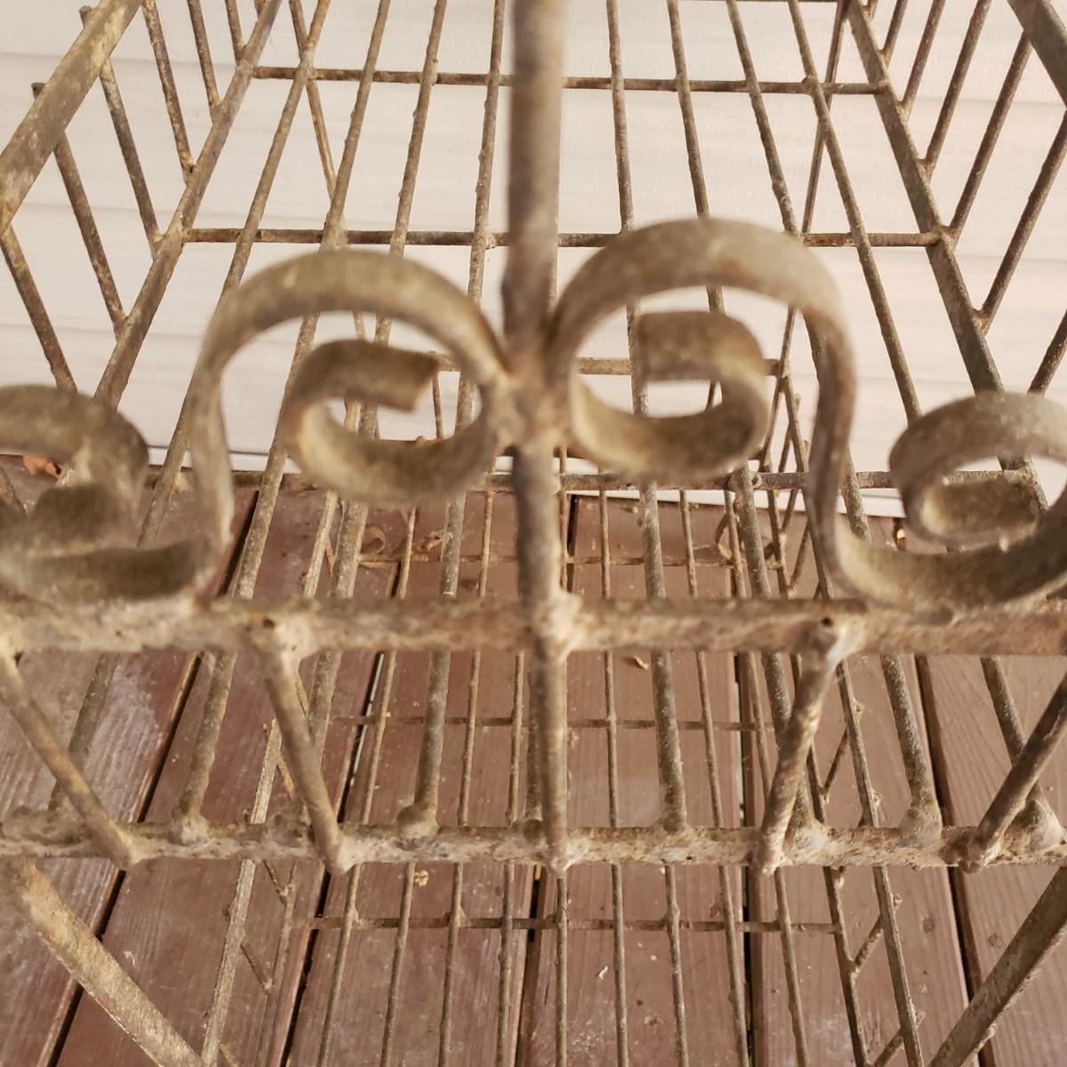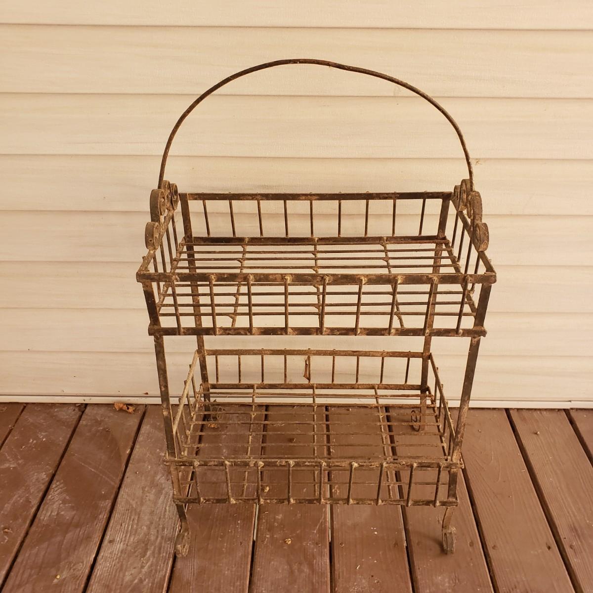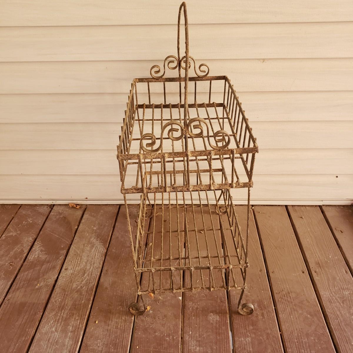 This is a two tiered, sturdy metal stand. It has an arched handle across the top for easy moving. Could be a plant stand inside or outside. Stand measures 20" x 12" x 24"H. Currently has the shabby chic look with chippy paint.