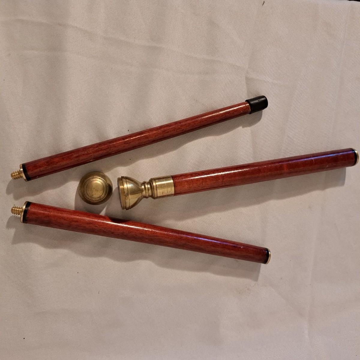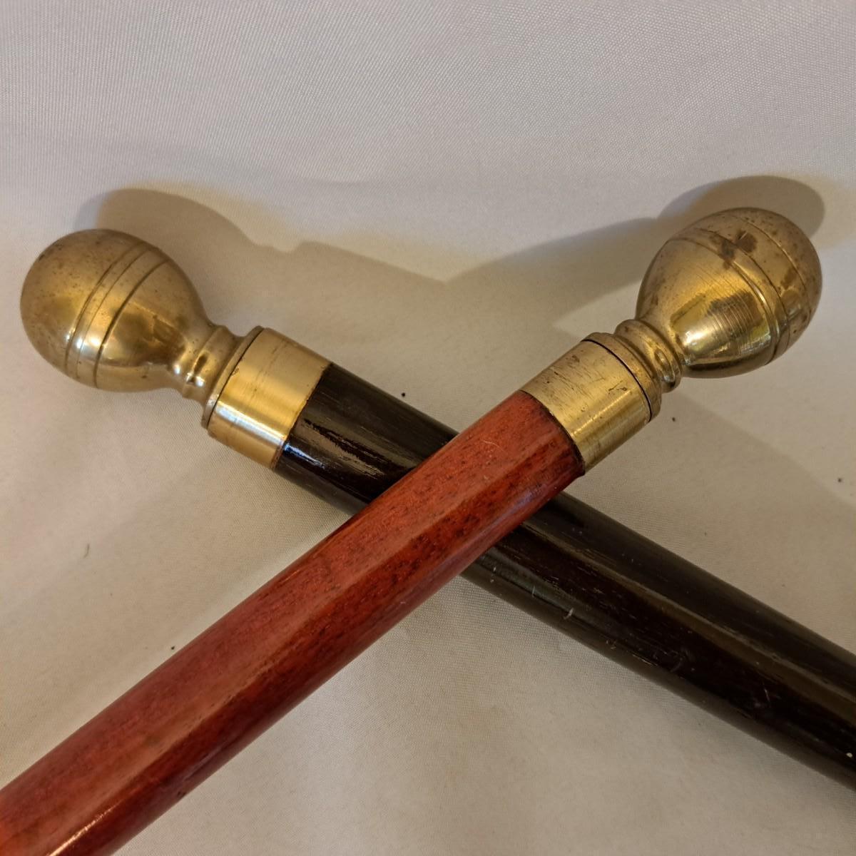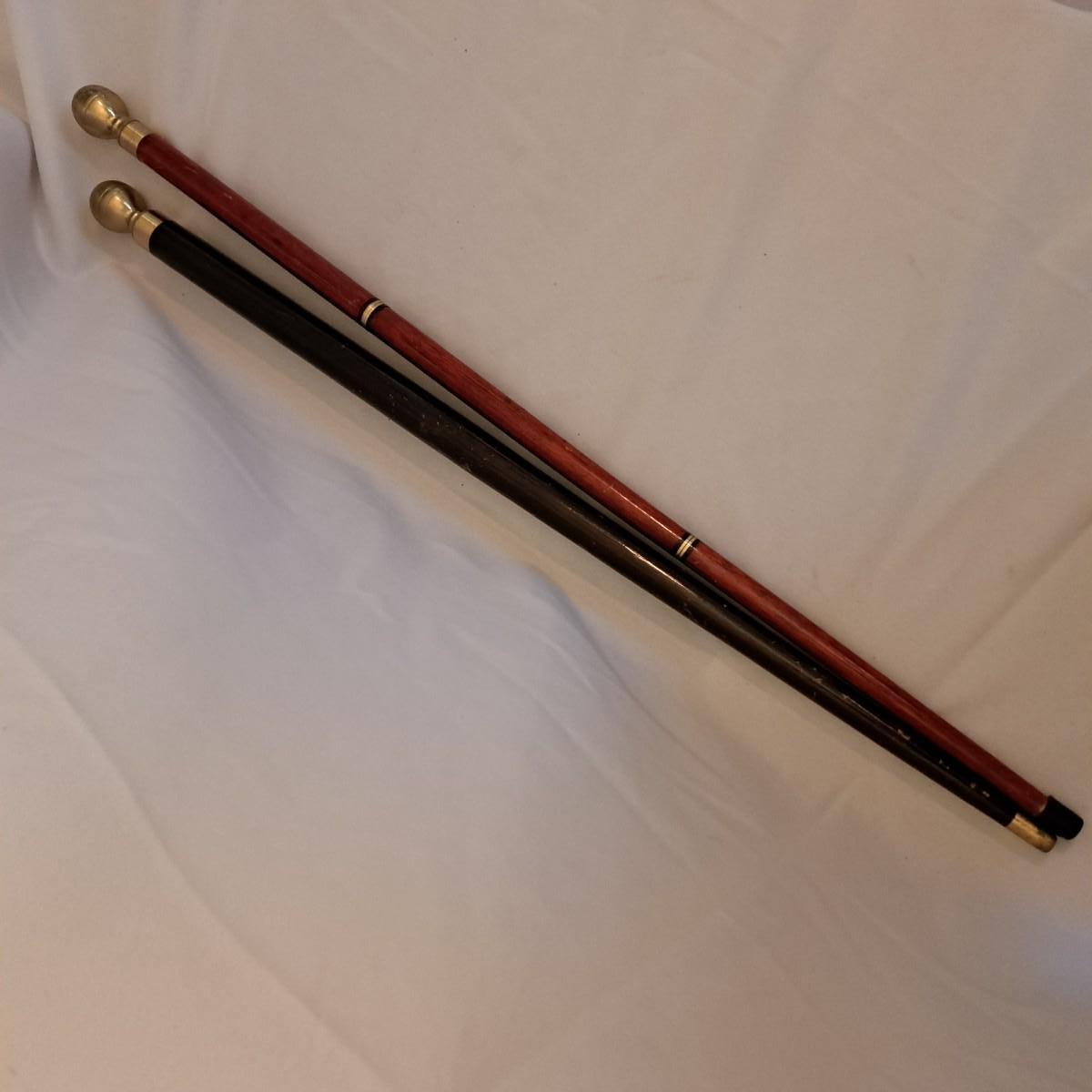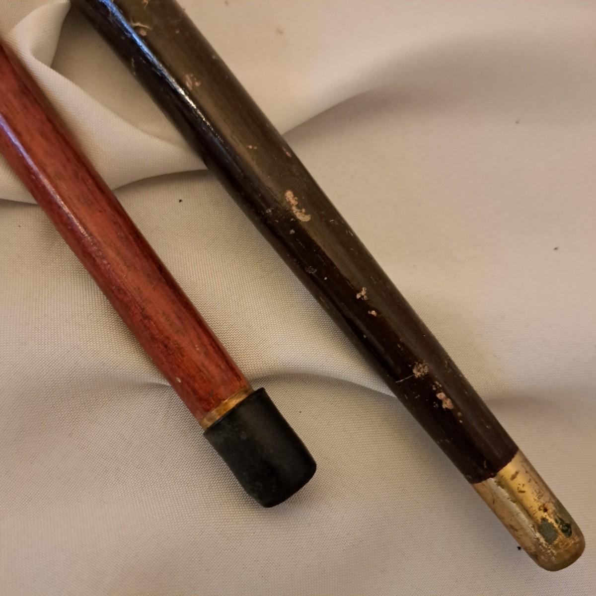 Two vintage wooden canes - the cherry finish cane, 35"H, unscrews into three separate pieces and has a brass knob that when unscrewed reveals a compass; however, the directional arrow has lifted away from the face. Could possibly be repaired. The dark wood cane, 33"H, also has a brass knob (*with a partial piece of cork on inside of knob) that when unscrewed reveals an empty compartment inside. Both have light surface scuffs and scratches consistent with age wear and use. Shipping available. Shipping can be costly. We suggest contacting our preferred local shipping provider, Postage Express, with dimensions and getting an estimate before bidding: (828) 255-9250 or shipping@postageexpressnc.com.