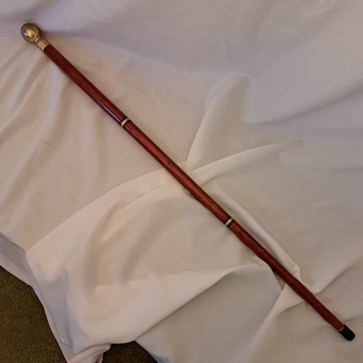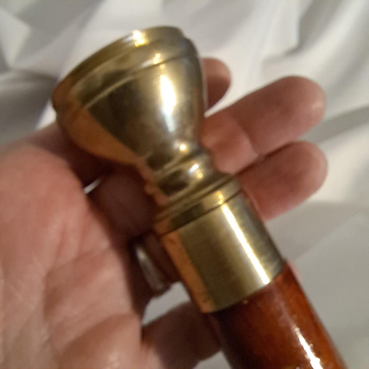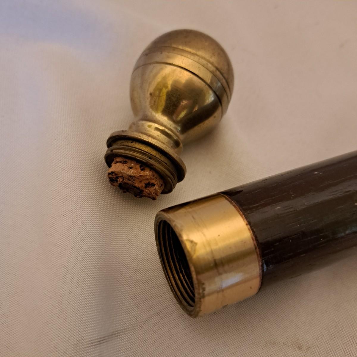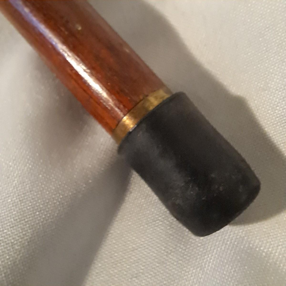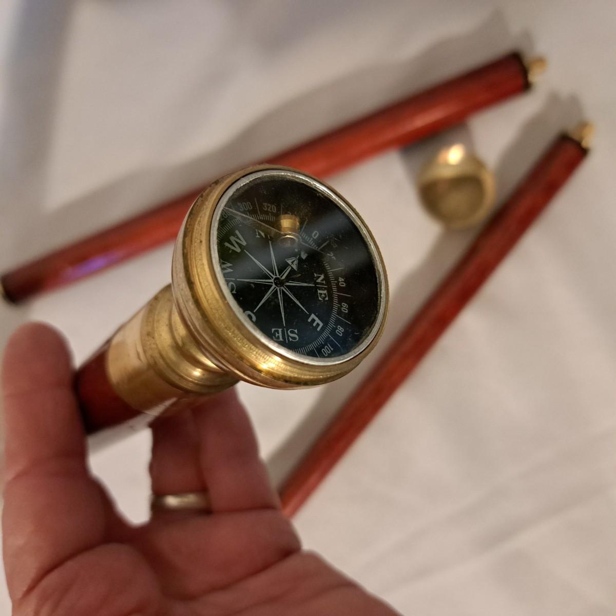 Two vintage wooden canes - the cherry finish cane, 35"H, unscrews into three separate pieces and has a brass knob that when unscrewed reveals a compass; however, the directional arrow has lifted away from the face. Could possibly be repaired. The dark wood cane, 33"H, also has a brass knob (*with a partial piece of cork on inside of knob) that when unscrewed reveals an empty compartment inside. Both have light surface scuffs and scratches consistent with age wear and use. Shipping available. Shipping can be costly. We suggest contacting our preferred local shipping provider, Postage Express, with dimensions and getting an estimate before bidding: (828) 255-9250 or shipping@postageexpressnc.com.