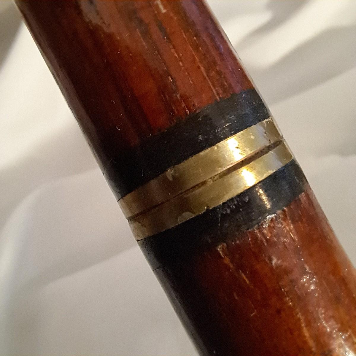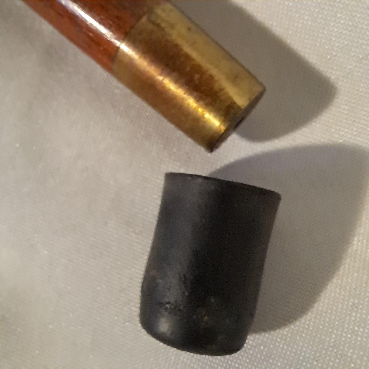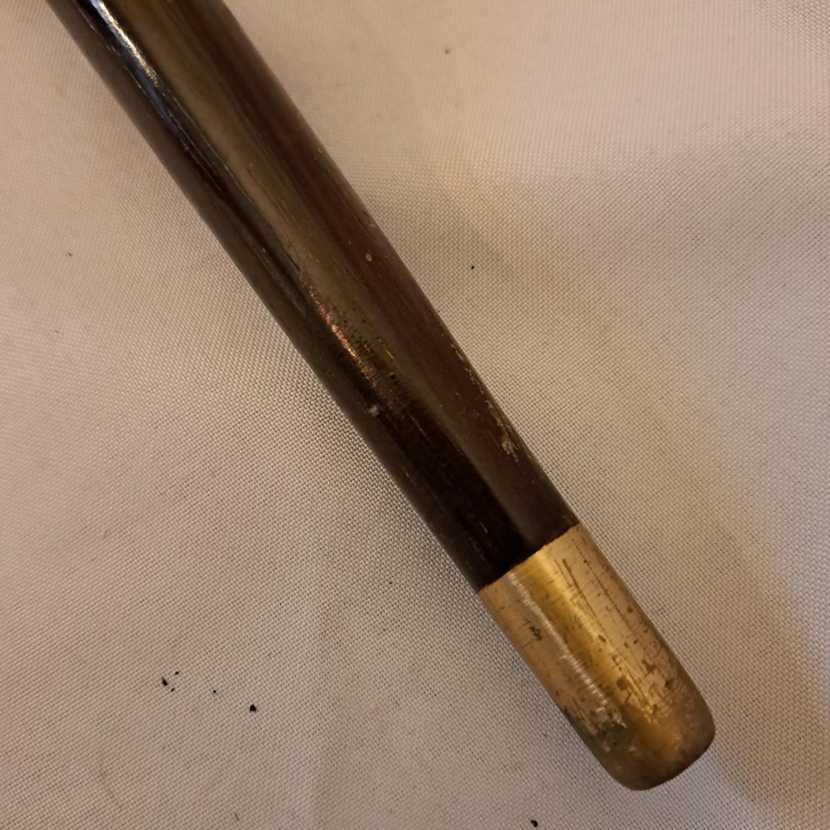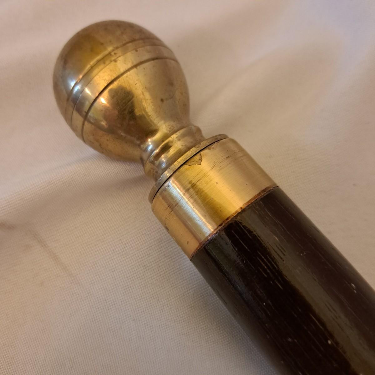 Two vintage wooden canes - the cherry finish cane, 35"H, unscrews into three separate pieces and has a brass knob that when unscrewed reveals a compass; however, the directional arrow has lifted away from the face. Could possibly be repaired. The dark wood cane, 33"H, also has a brass knob (*with a partial piece of cork on inside of knob) that when unscrewed reveals an empty compartment inside. Both have light surface scuffs and scratches consistent with age wear and use. Shipping available. Shipping can be costly. We suggest contacting our preferred local shipping provider, Postage Express, with dimensions and getting an estimate before bidding: (828) 255-9250 or shipping@postageexpressnc.com.