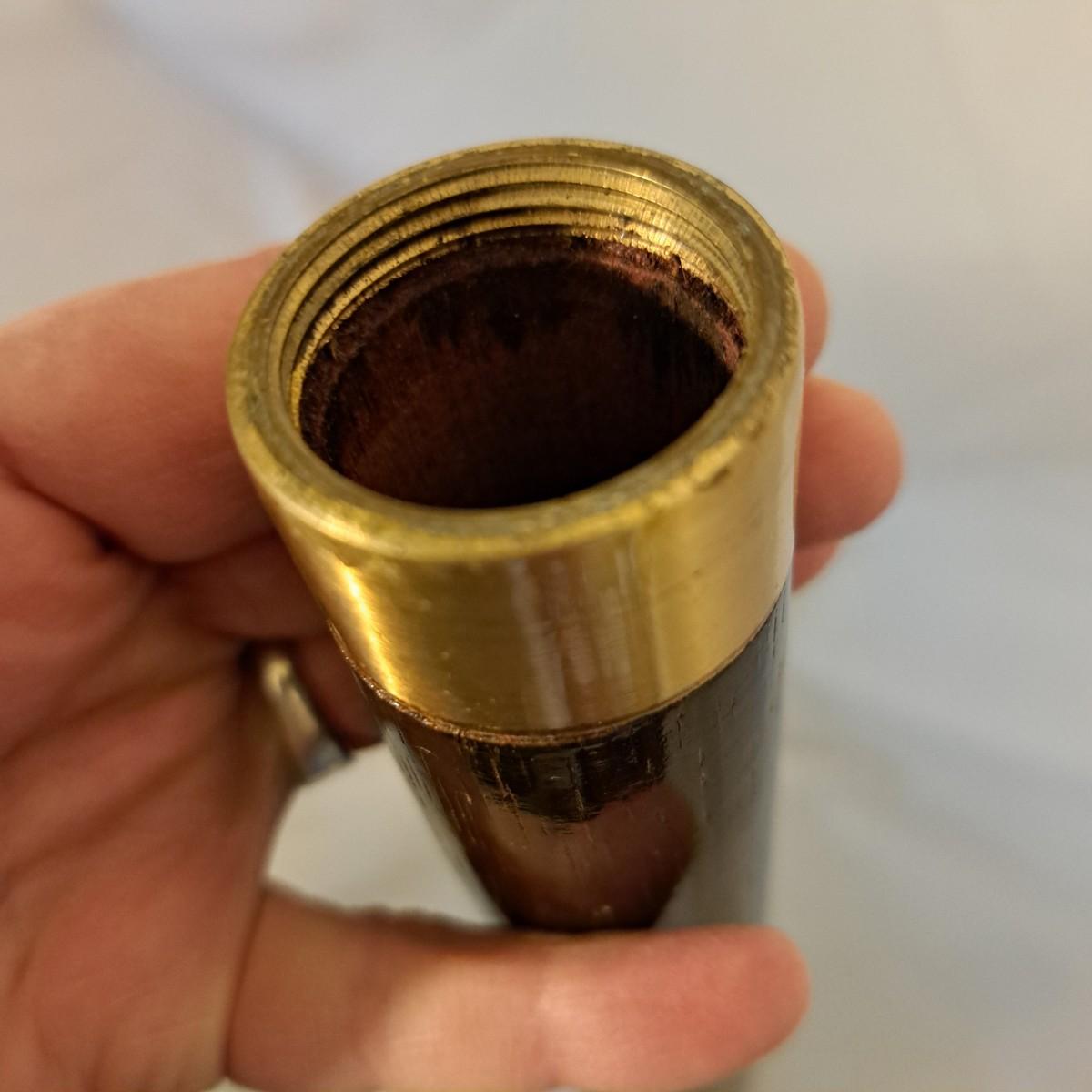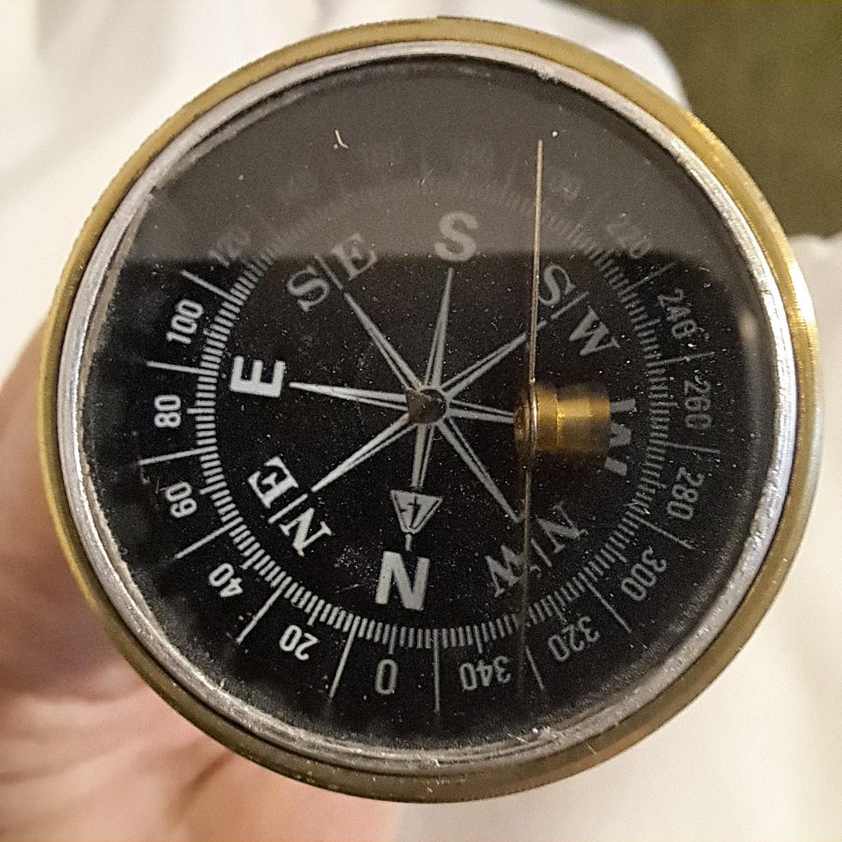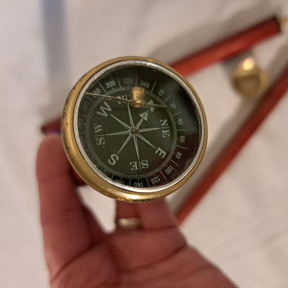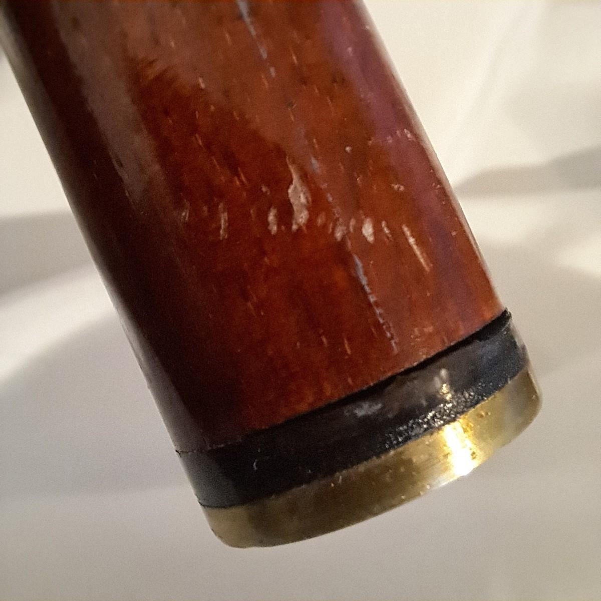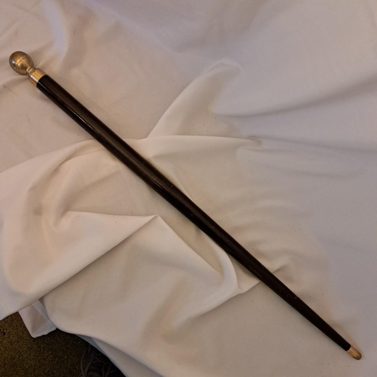 Two vintage wooden canes - the cherry finish cane, 35"H, unscrews into three separate pieces and has a brass knob that when unscrewed reveals a compass; however, the directional arrow has lifted away from the face. Could possibly be repaired. The dark wood cane, 33"H, also has a brass knob (*with a partial piece of cork on inside of knob) that when unscrewed reveals an empty compartment inside. Both have light surface scuffs and scratches consistent with age wear and use. Shipping available. Shipping can be costly. We suggest contacting our preferred local shipping provider, Postage Express, with dimensions and getting an estimate before bidding: (828) 255-9250 or shipping@postageexpressnc.com.