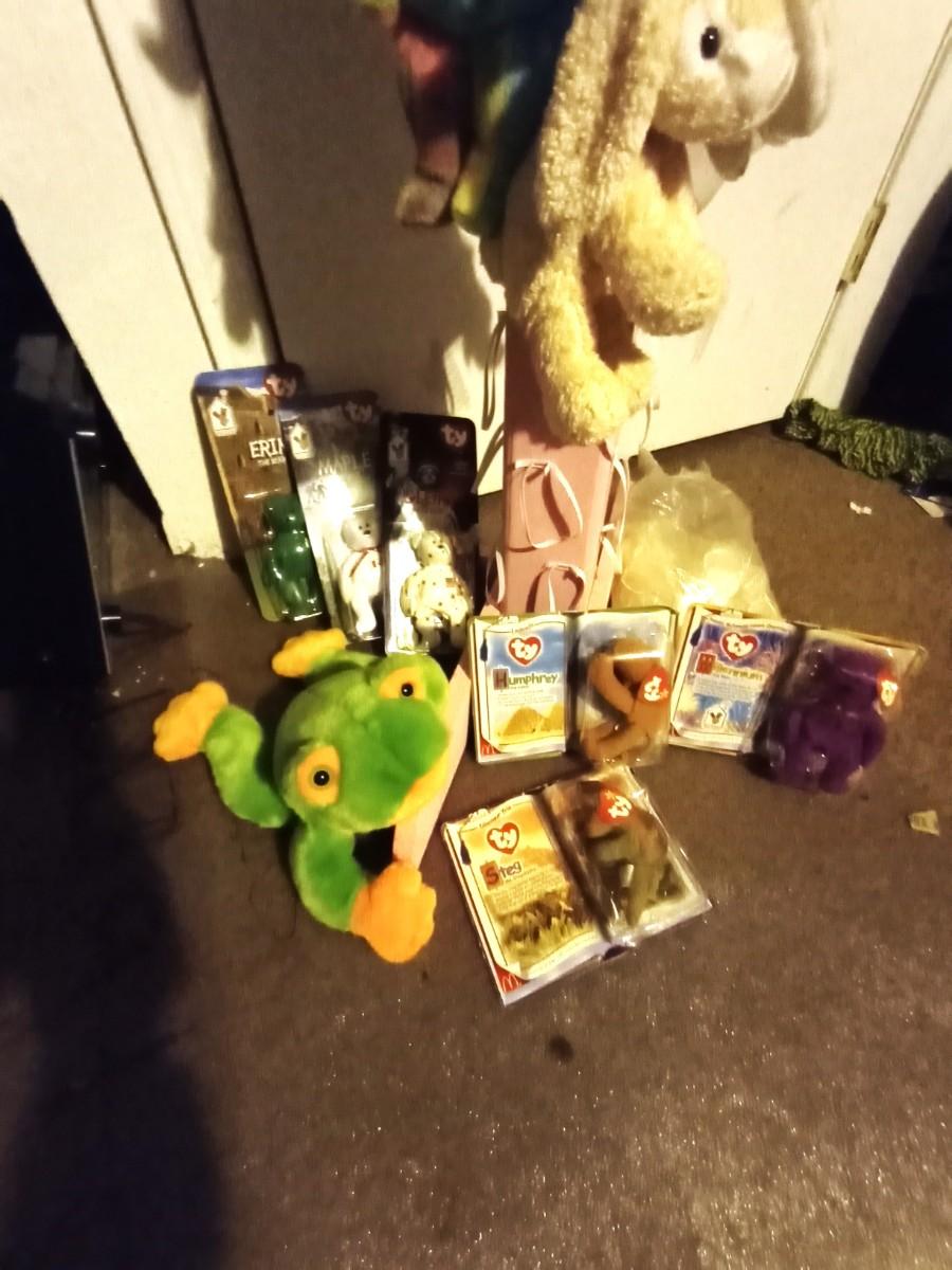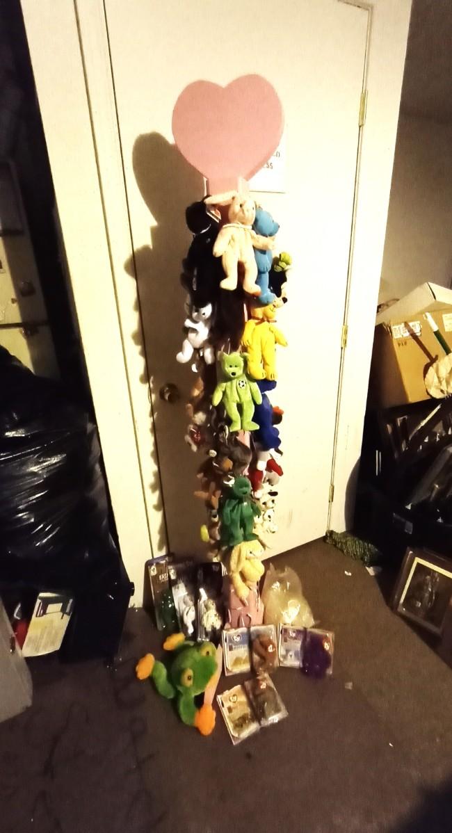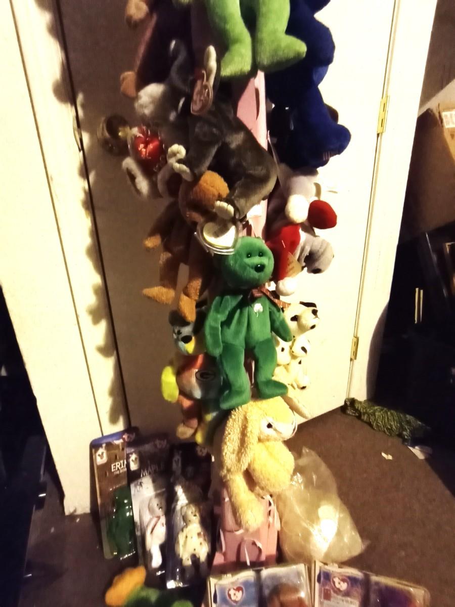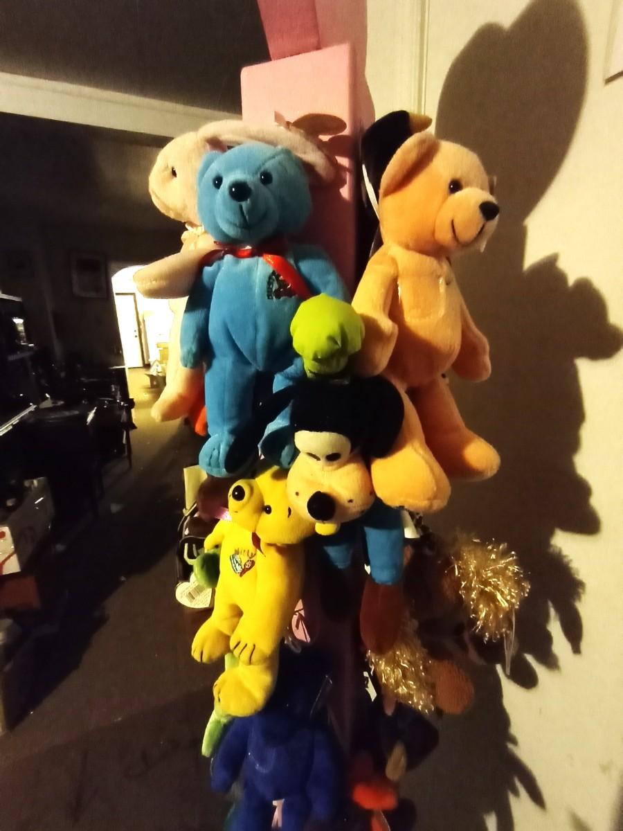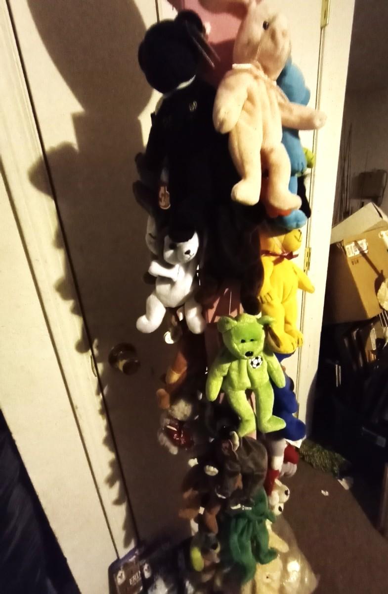 TY BEANIE BABIES HUNG ON WOODEN POLE STAND