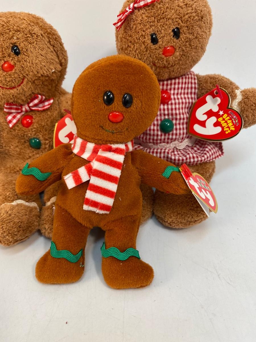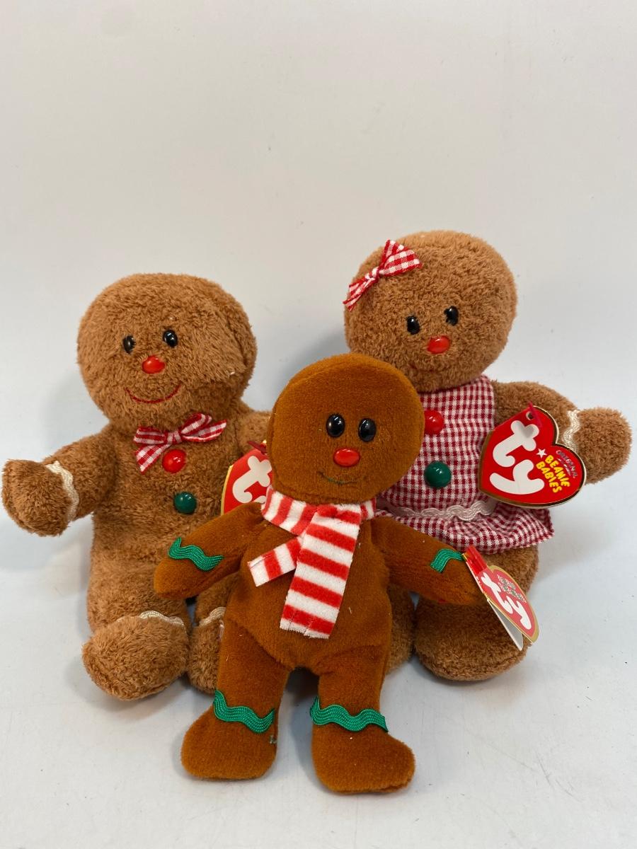 TY Beanie Baby Plush Gingerbread Family Stuffed Animal Holiday Decor. Man, woman, and baby. All have hang tags attached.