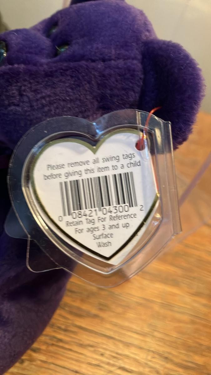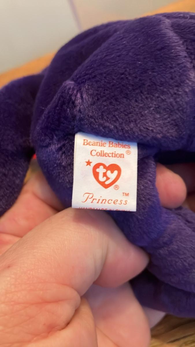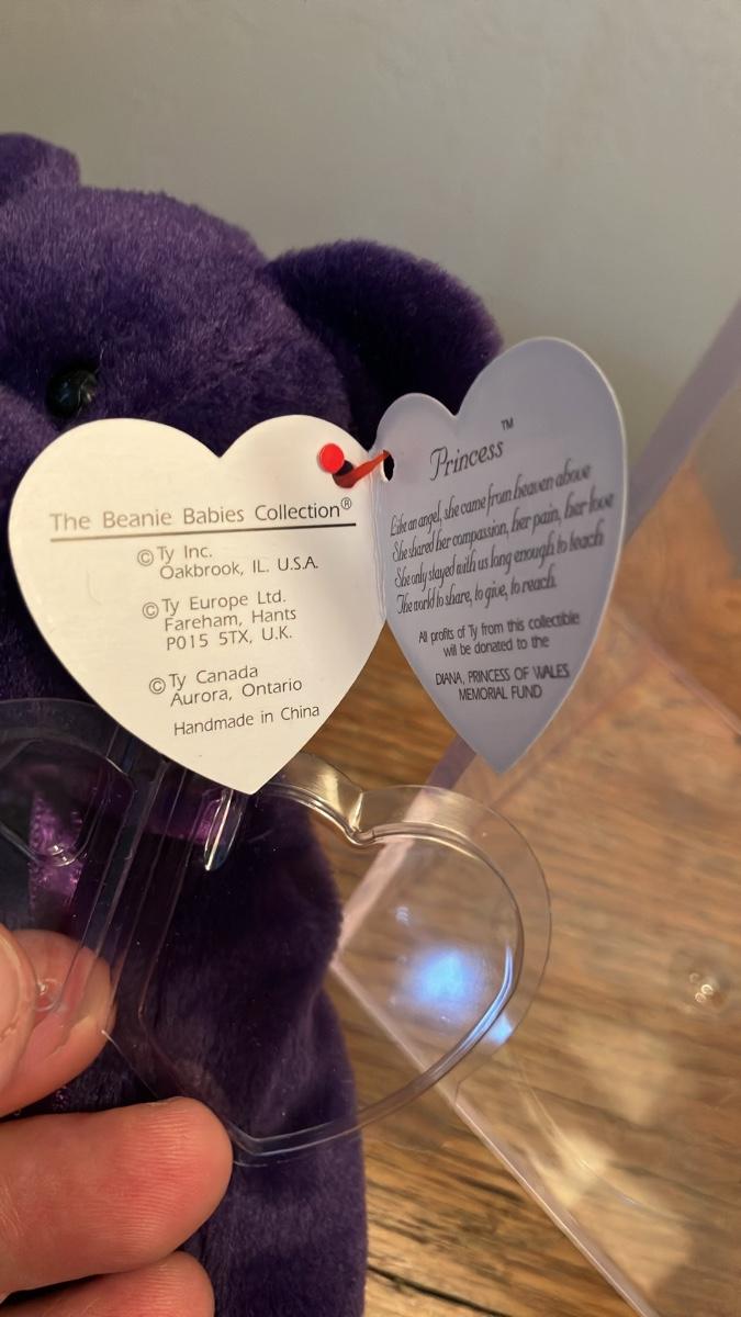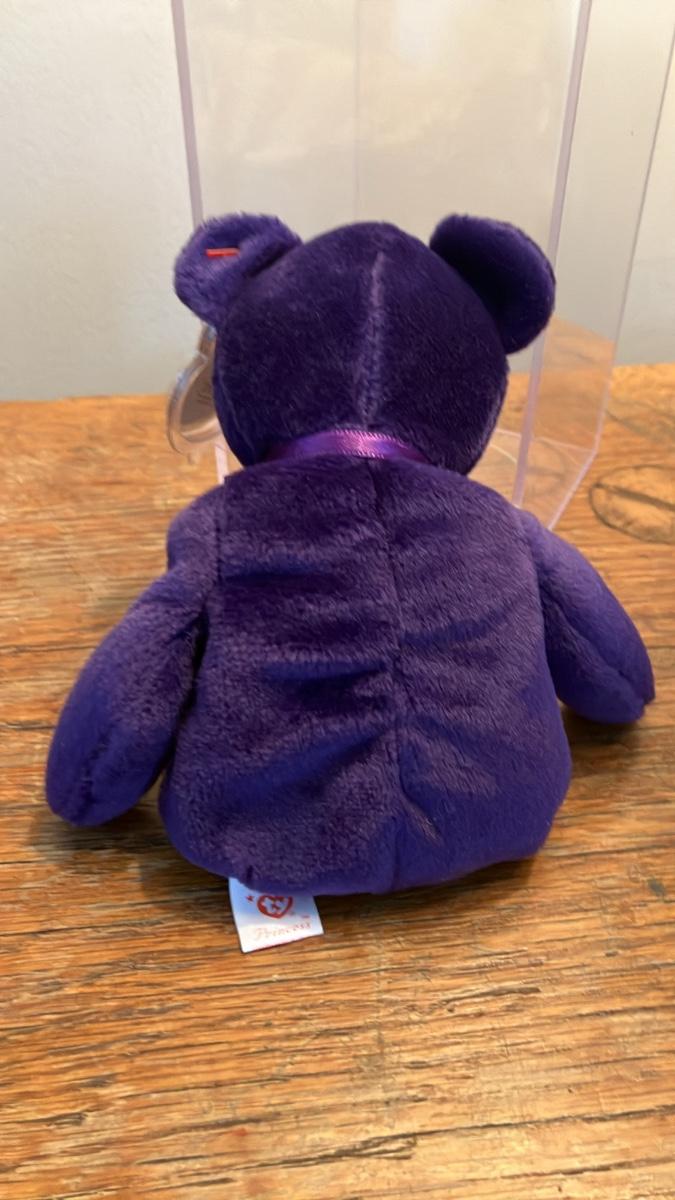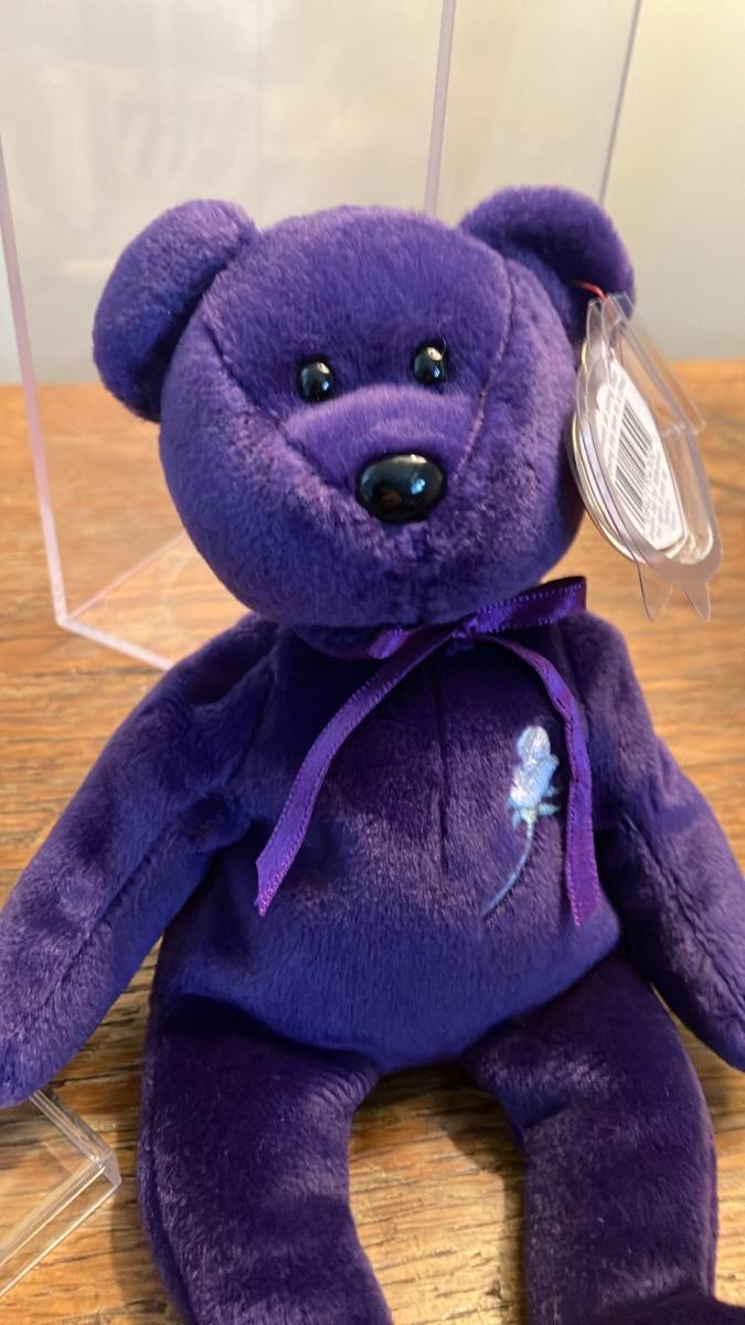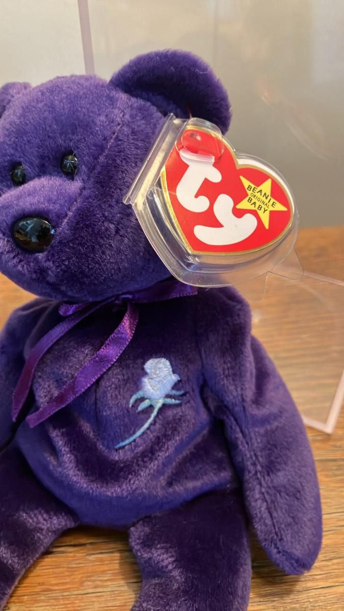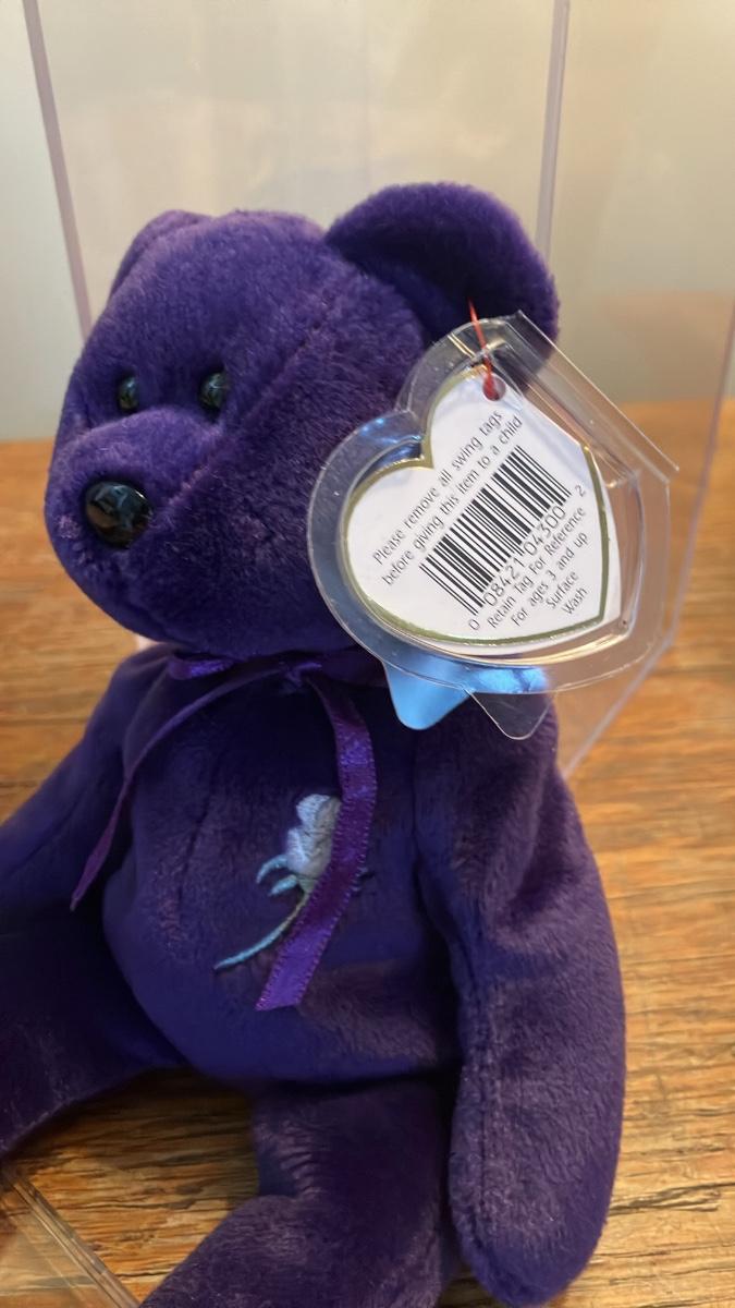 1997 Ty Beanie Baby "Princess" the Bear, the beloved purple teddy created in memory of Princess Diana. This collectible features the iconic deep purple plush fur, embroidered white rose on the chest, black button eyes, blue ribbon, and the heartfelt poem on the heart-shaped swing tag dedicated to Diana, Princess of Wales (proceeds originally supported the Princess of Wales Memorial Fund).