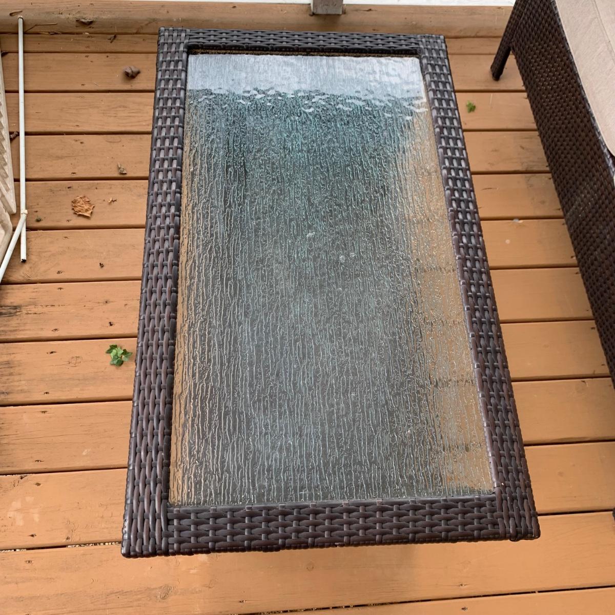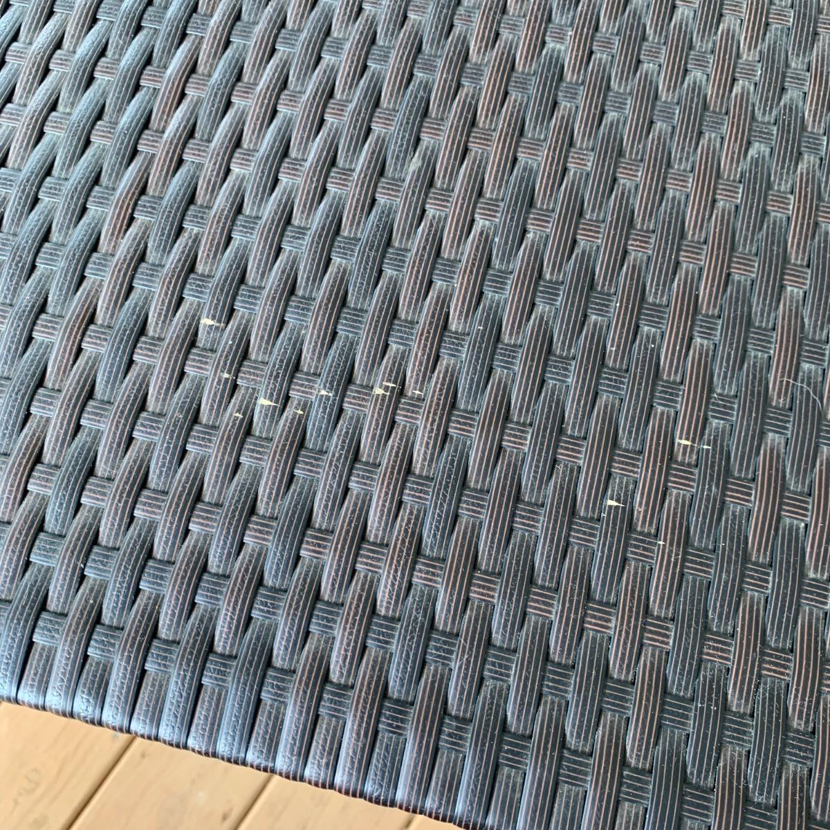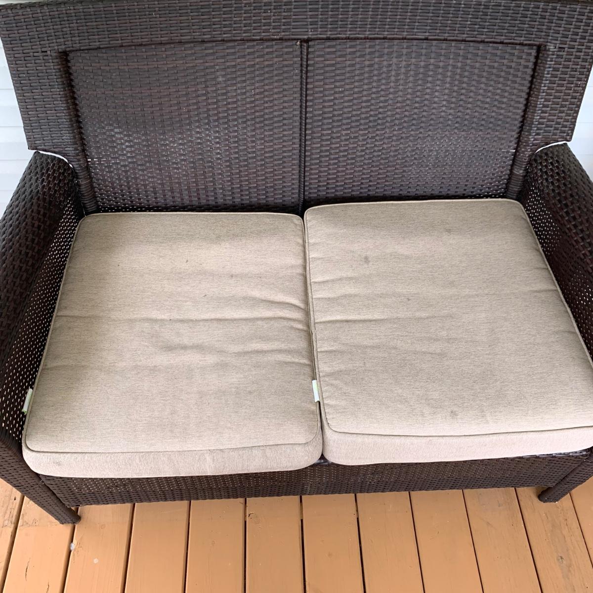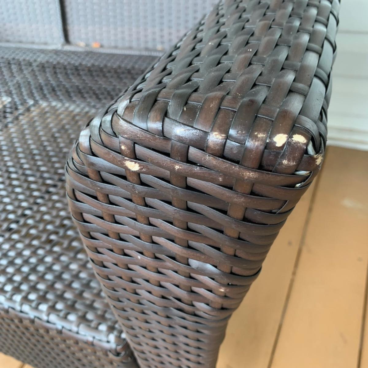 A gorgeous wicker-like patio set that includes a loveseat and glass top table. The cushions and pillows on the loveseat say “˜Ty Pennington Style’. The furniture base material has a dark brown wood appearance, but feels like plastic. The loveseat measures 58” x 29” x 36”H. The seat height including the cushion is 18.5”. There are some light stains on the cushions and some nicks in the “wicker”; see photos. The cushions can be flipped to hide the stains (which are possibly cleanable). A similarly styled folding patio table is included as well. It is 24”sq. x 28.5”H.