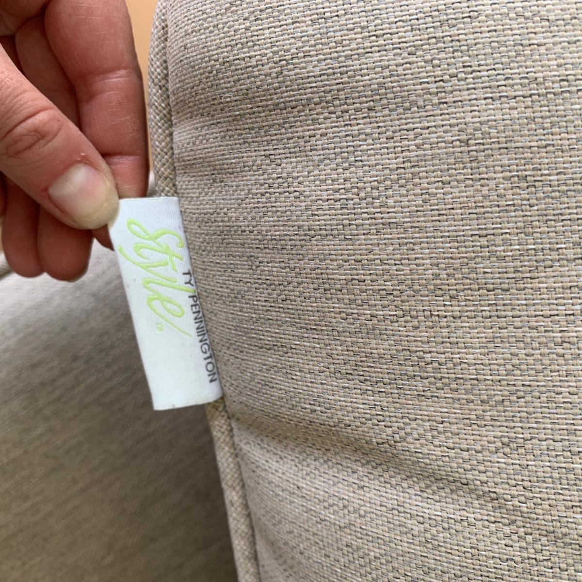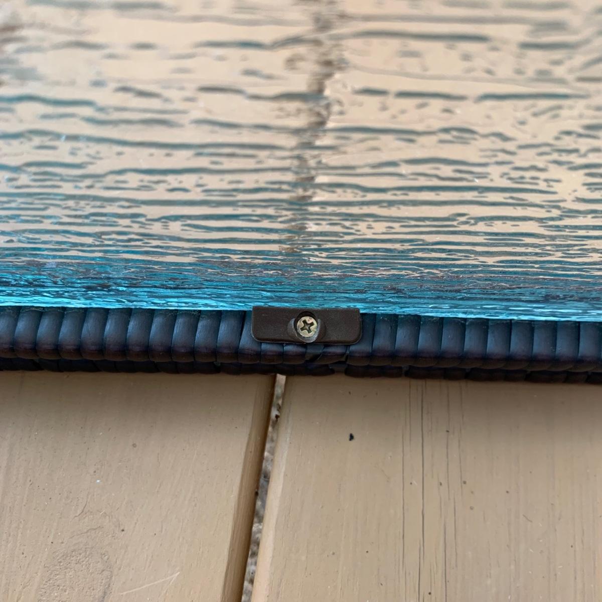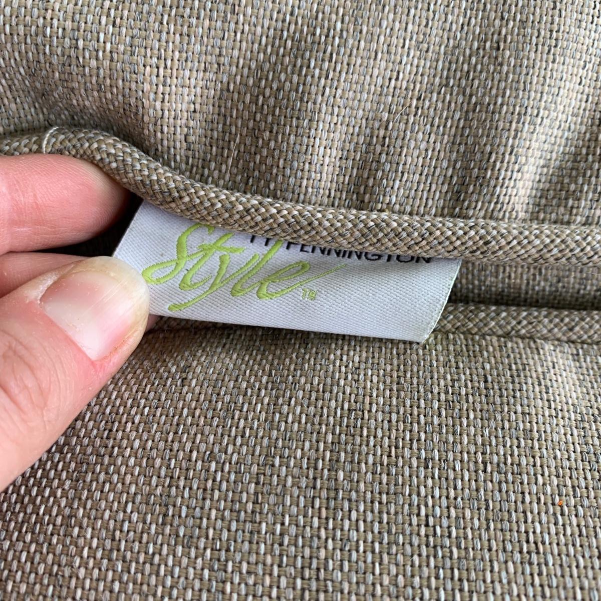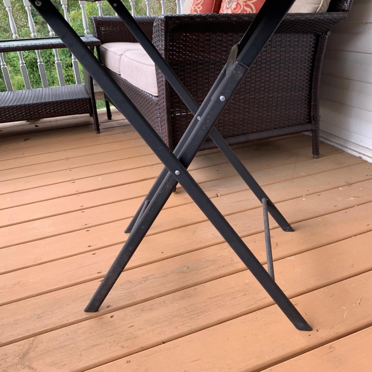 A gorgeous wicker-like patio set that includes a loveseat and glass top table. The cushions and pillows on the loveseat say “˜Ty Pennington Style’. The furniture base material has a dark brown wood appearance, but feels like plastic. The loveseat measures 58” x 29” x 36”H. The seat height including the cushion is 18.5”. There are some light stains on the cushions and some nicks in the “wicker”; see photos. The cushions can be flipped to hide the stains (which are possibly cleanable). A similarly styled folding patio table is included as well. It is 24”sq. x 28.5”H.