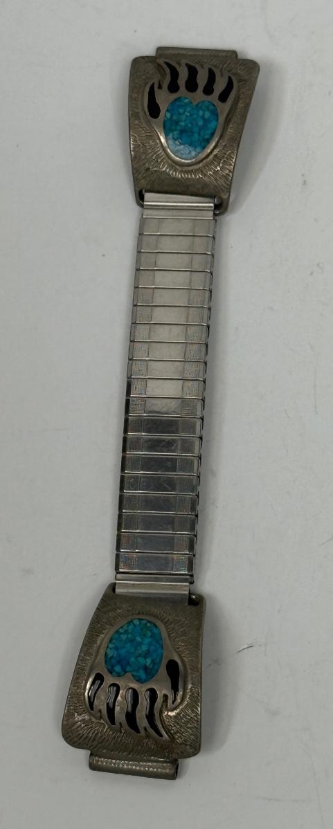 Collar portion of the band has a raised Bear Paw with black claws and turquoise paws. No silver marks. Good condition.