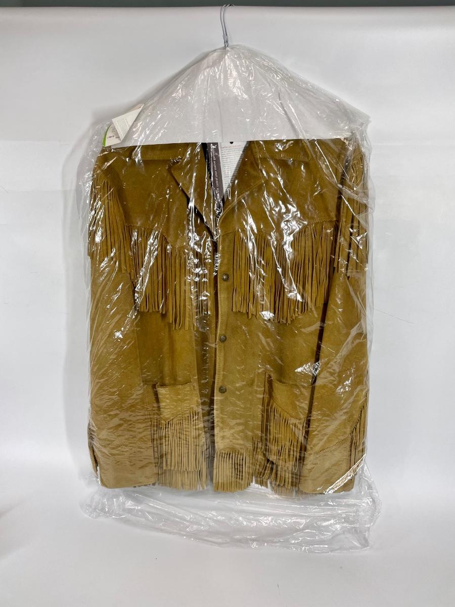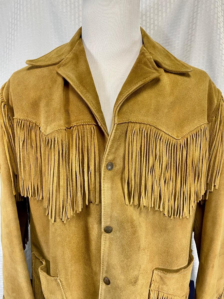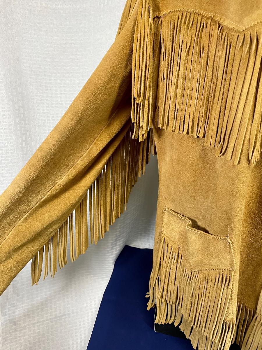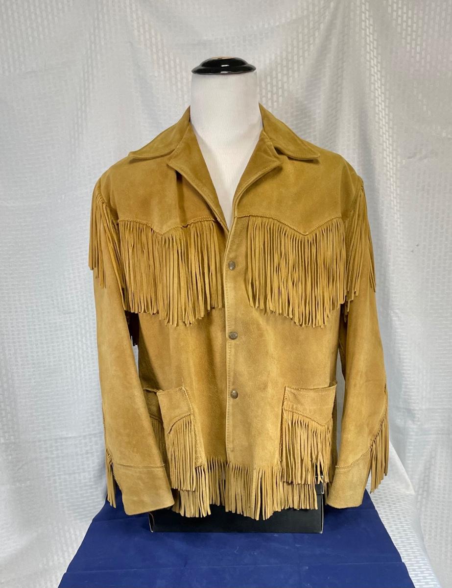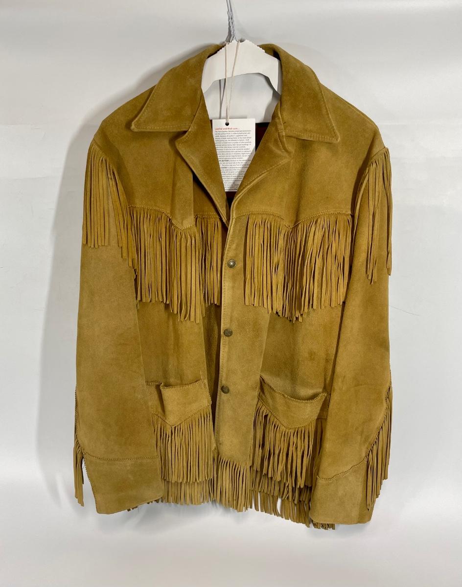 Similar to one worn by Jake Dalton in Once Upon a Time in Hollywood. Amazing, beautiful soft leather vintage Fringe buckskin jacket by Trego's Westwear in Woodward, Oklahoma. A few marks and dings, etc, typical wear for soft tanned leather. Fully lined. Label indicates size 46.