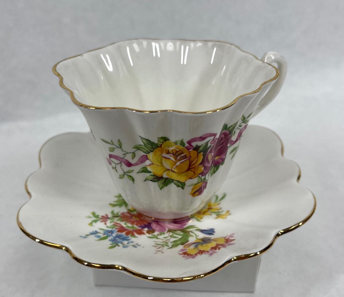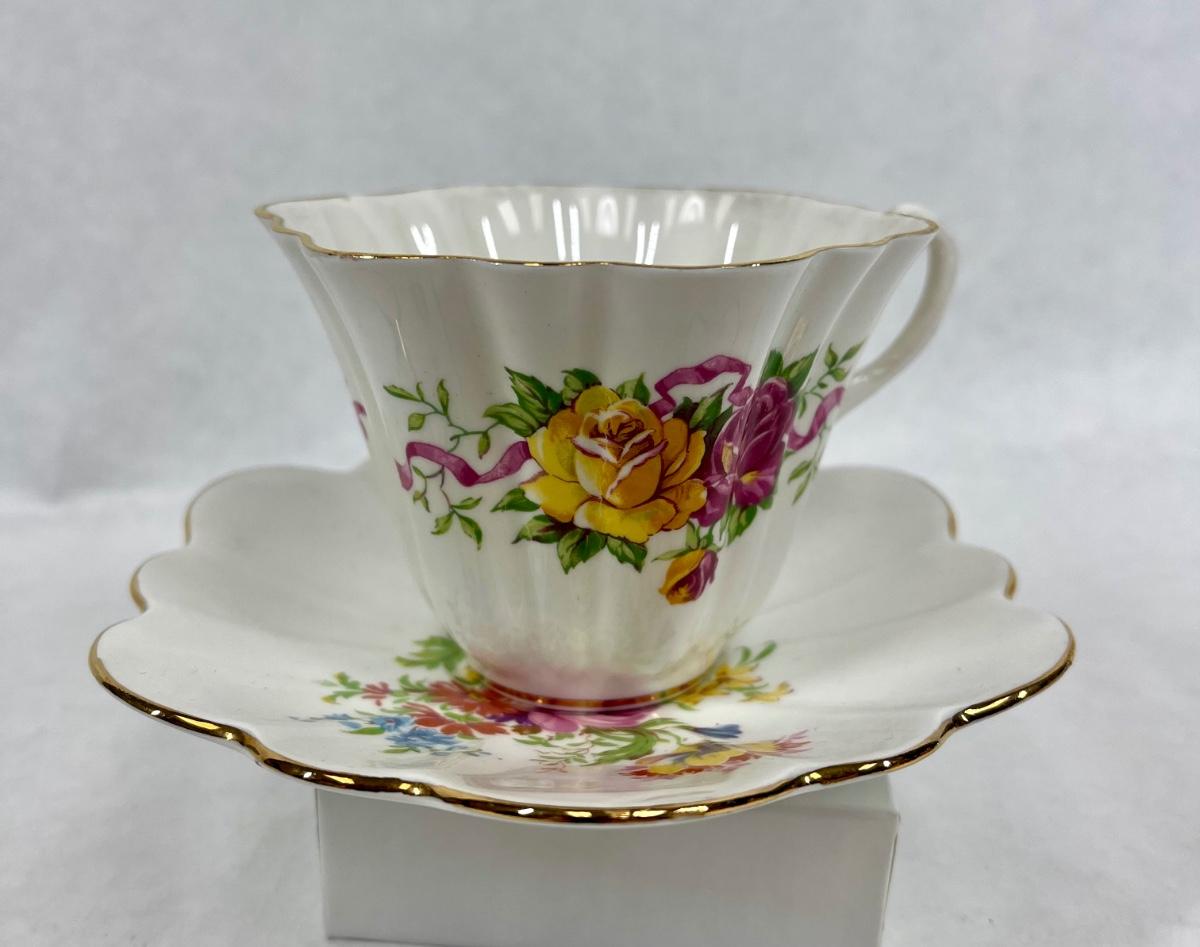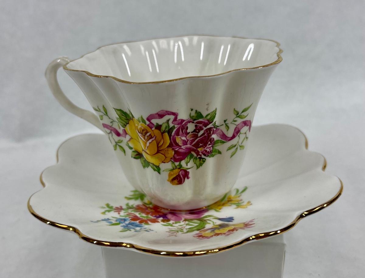 Vintage bone china Tea cup & Saucer Made in England - roses pink yellow scalloped cup