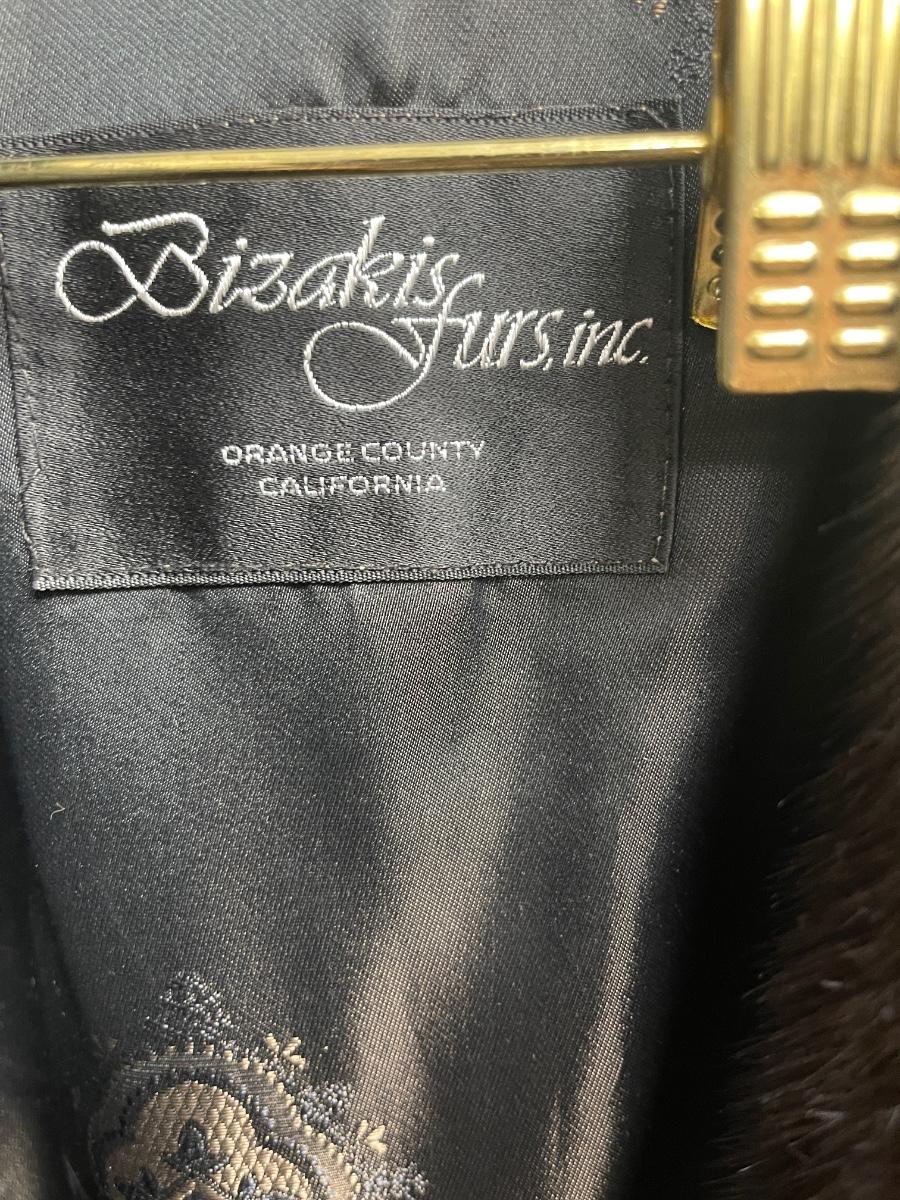 Made by Bizakis Furs, Inc Orange County California.. Old and stored inside its lown bag in closet for at least 20 years, but in very good condition. Our mannequin is a size 8, so we are guessing a size 10/12.
