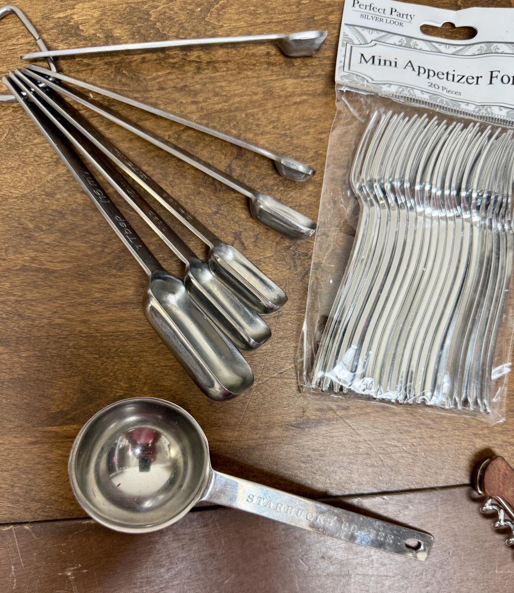 Misc Kitchen Lot - measuring spoons, wine opener, tablecloth weights