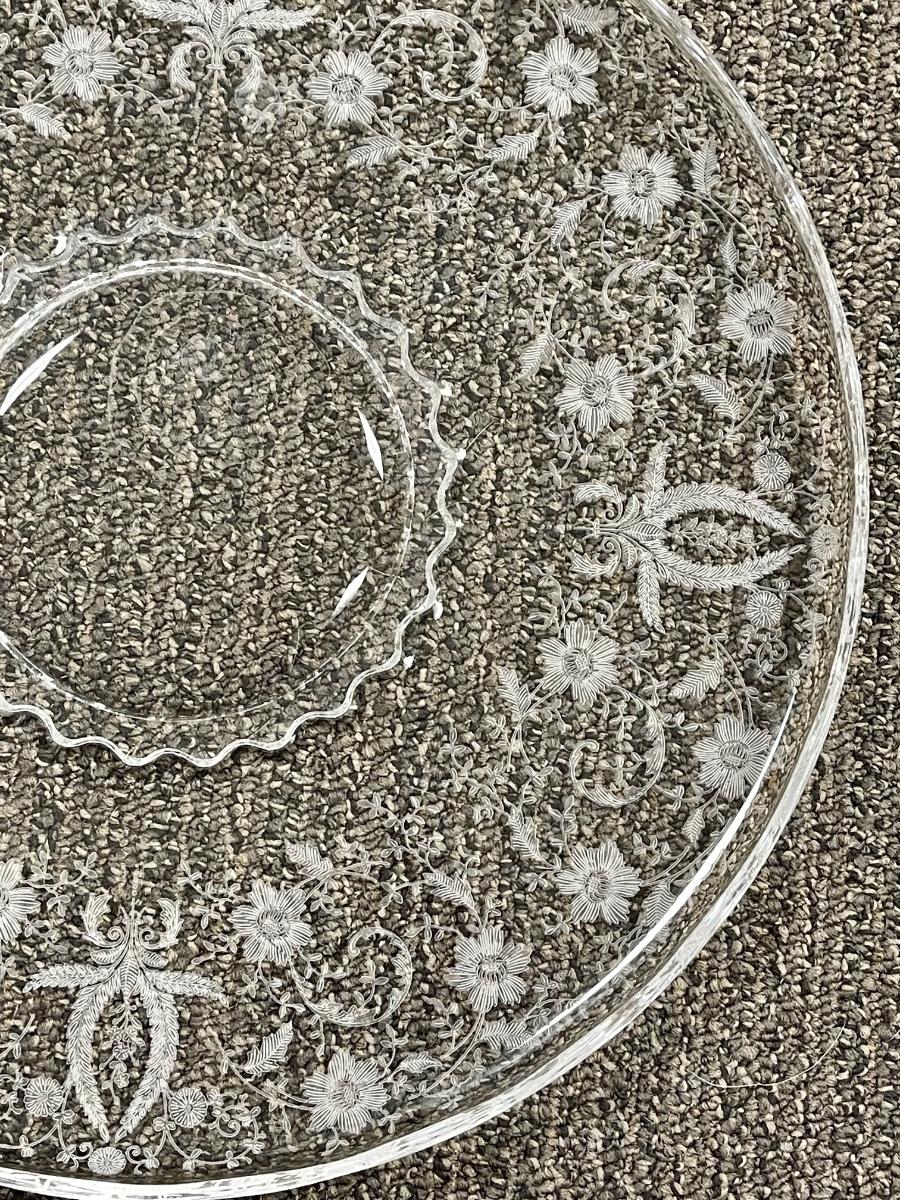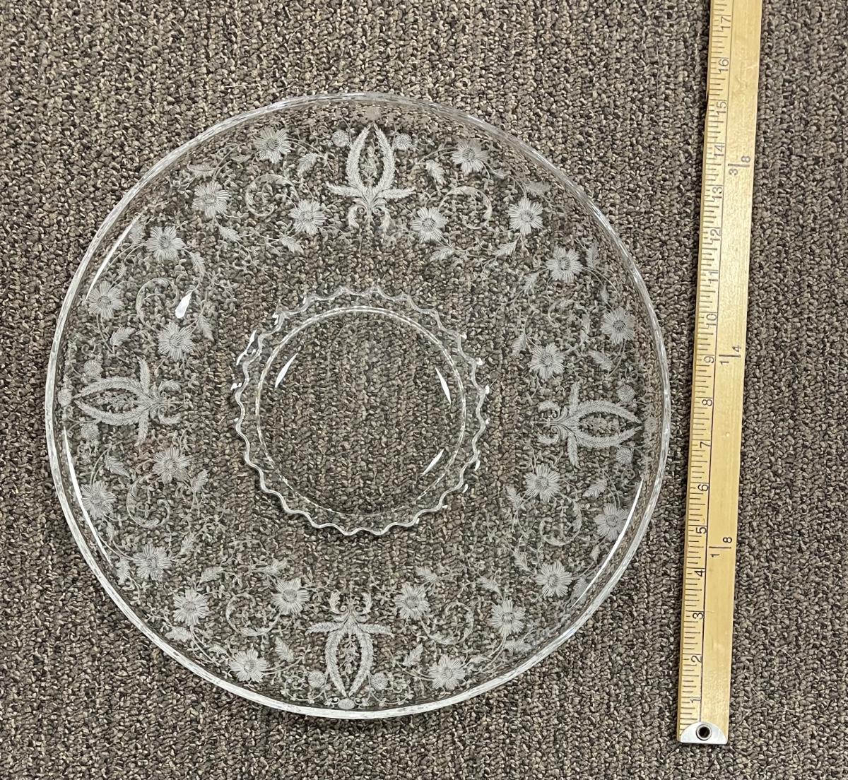 Large Frosted Glass Floral Pattern Platter Plate. About 18" size.