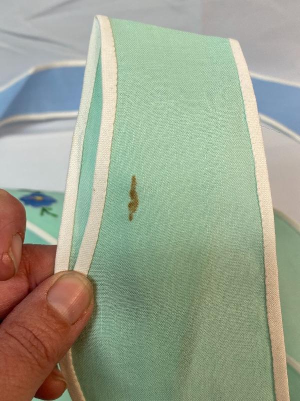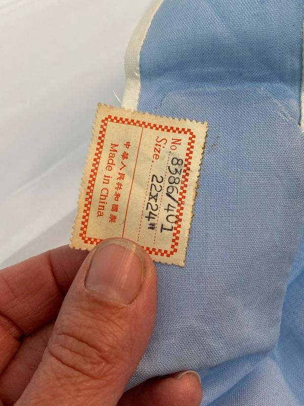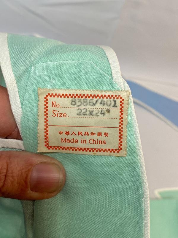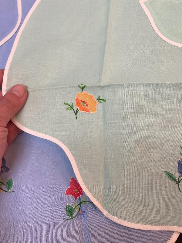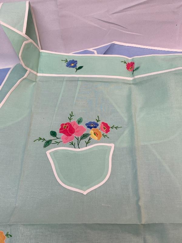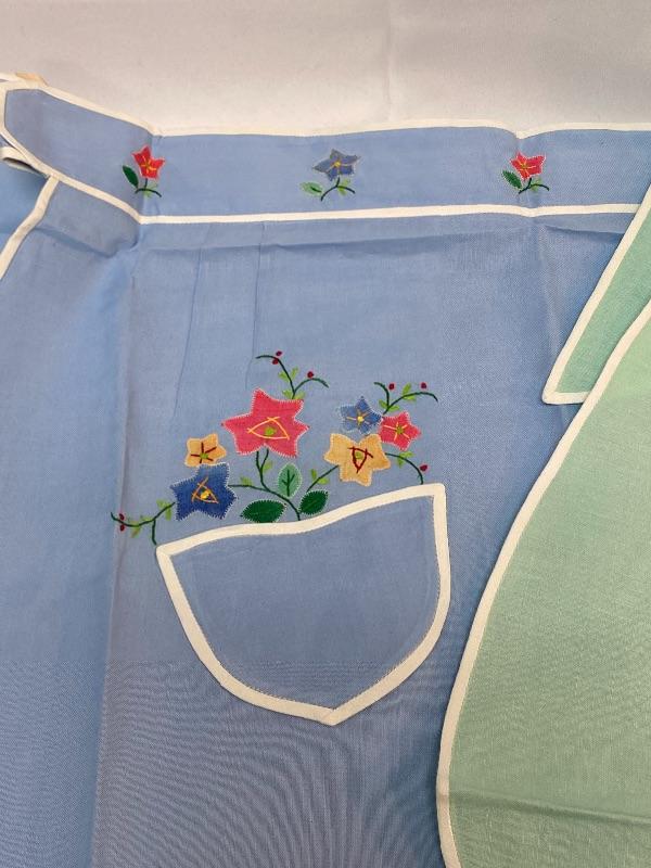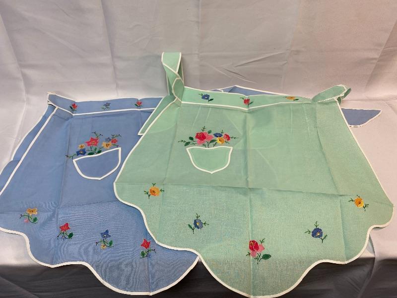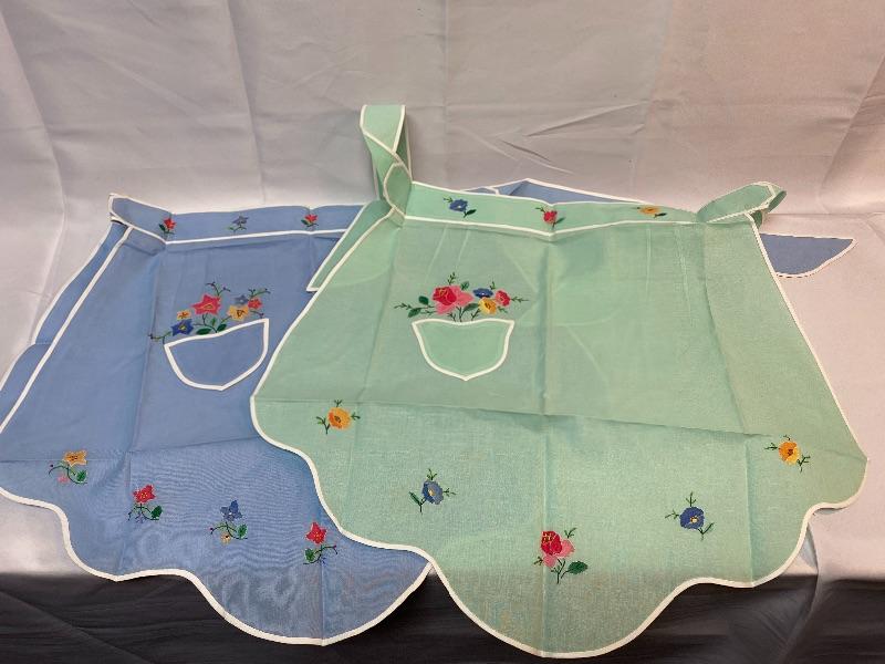 Vintage embroidered half aprons. Soft blue and green colored aprons with bright flowers embroidered. Scallop edge hem, single pocket, tie waist. Made in China. They look unused, previous owner folded them up and put them away. Creases from folding are very stiff. There is a spot on the tie of green apron. Original tags are attached to both.