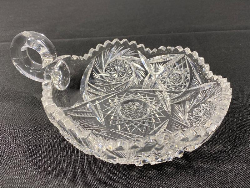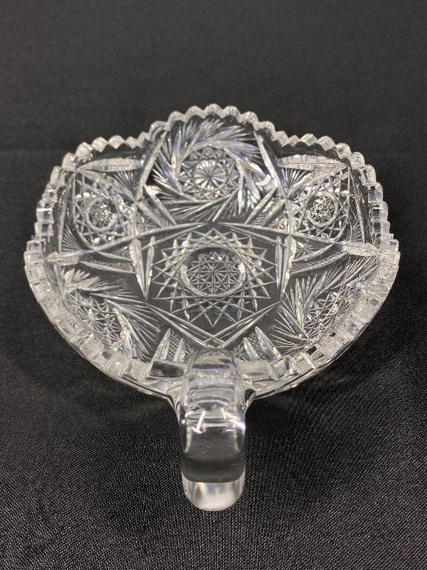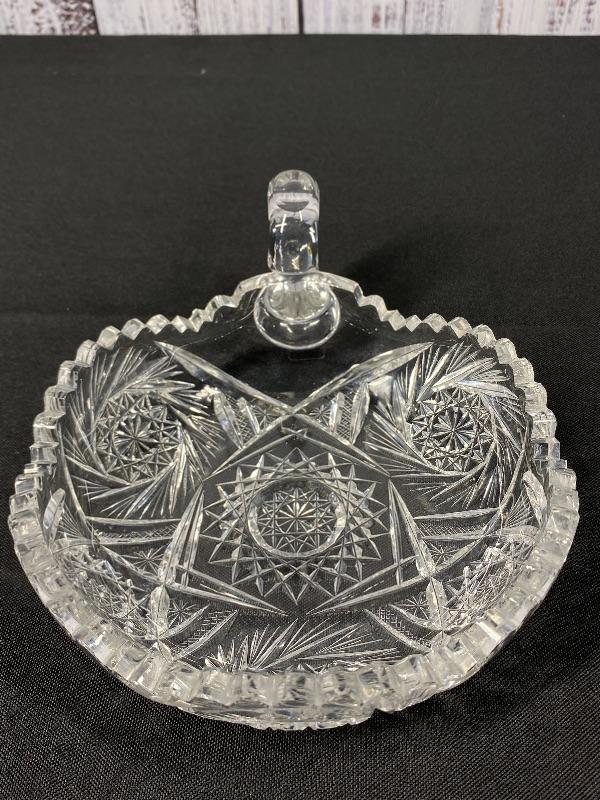 Vintage cut crystal nappy. Single handled shallow bowl. glass cut in a whirled star pattern. Sawtooth edge does have a small chip. About 8" from edge to handle edge. #24-30015