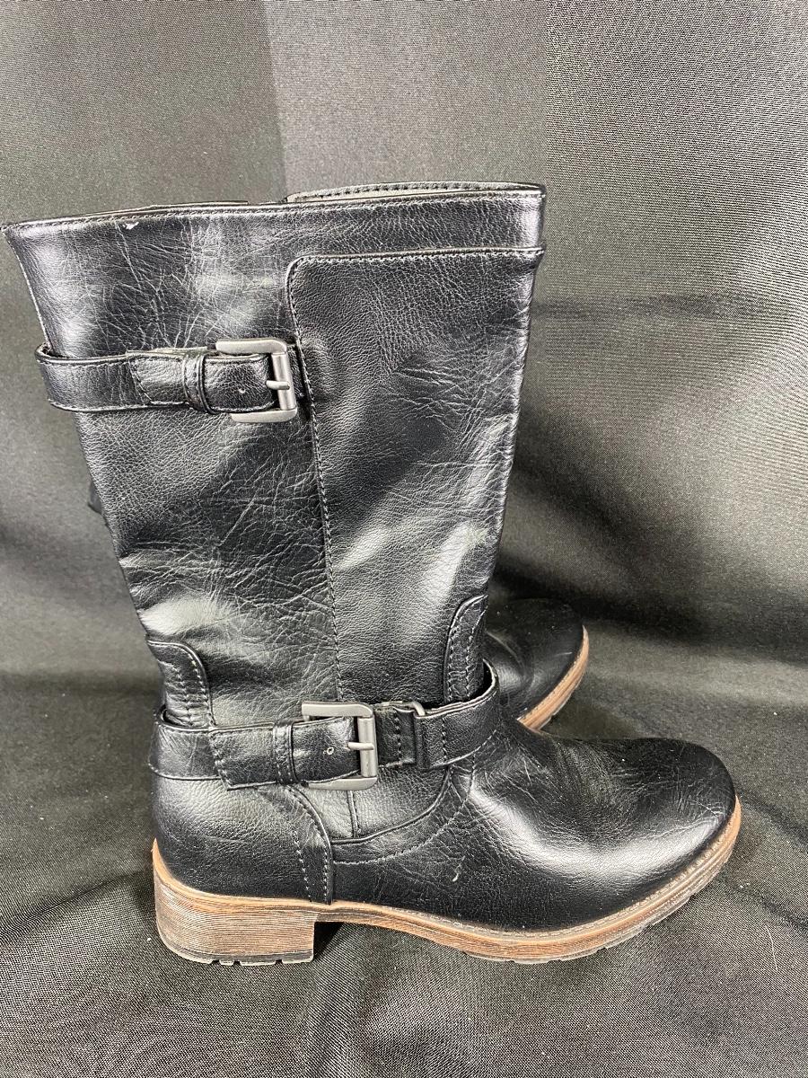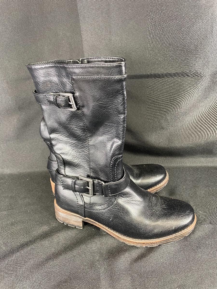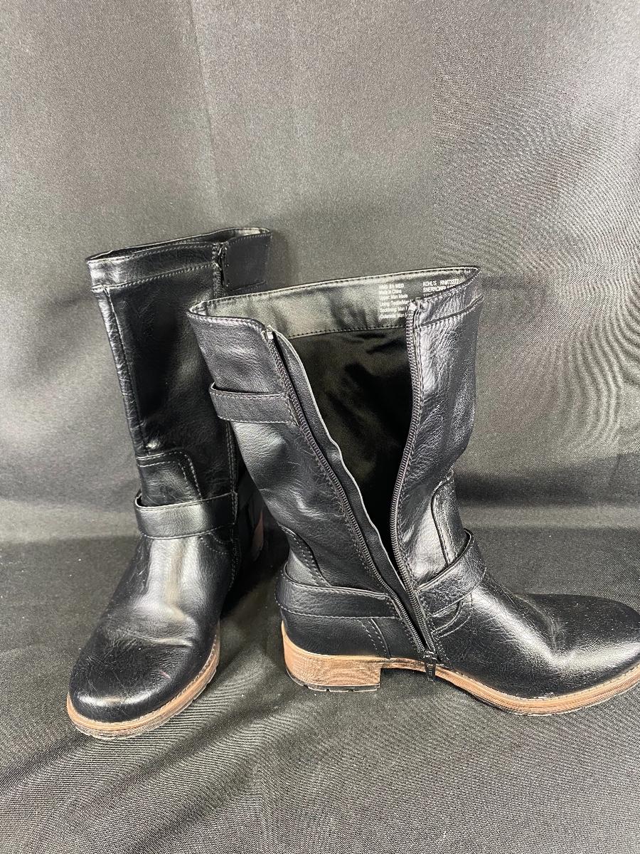 Woman's black faux leather motorcycle boots. Side zip for easy on/off. Previously worn condition. Size 8.5M. From Kohl's by Sonoma Lifestyle.