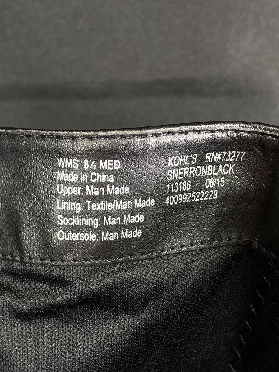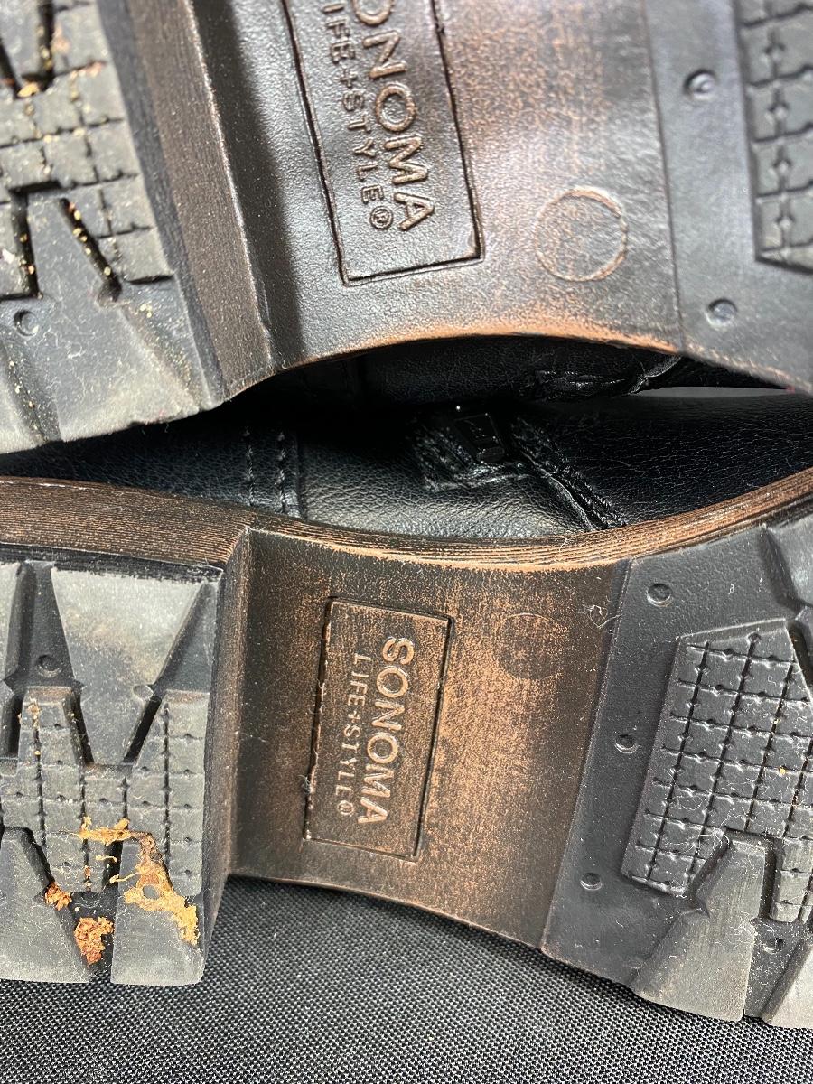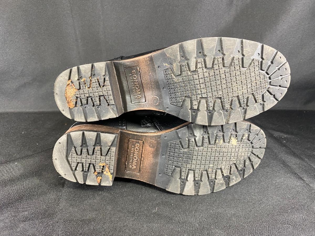Woman's black faux leather motorcycle boots. Side zip for easy on/off. Previously worn condition. Size 8.5M. From Kohl's by Sonoma Lifestyle.