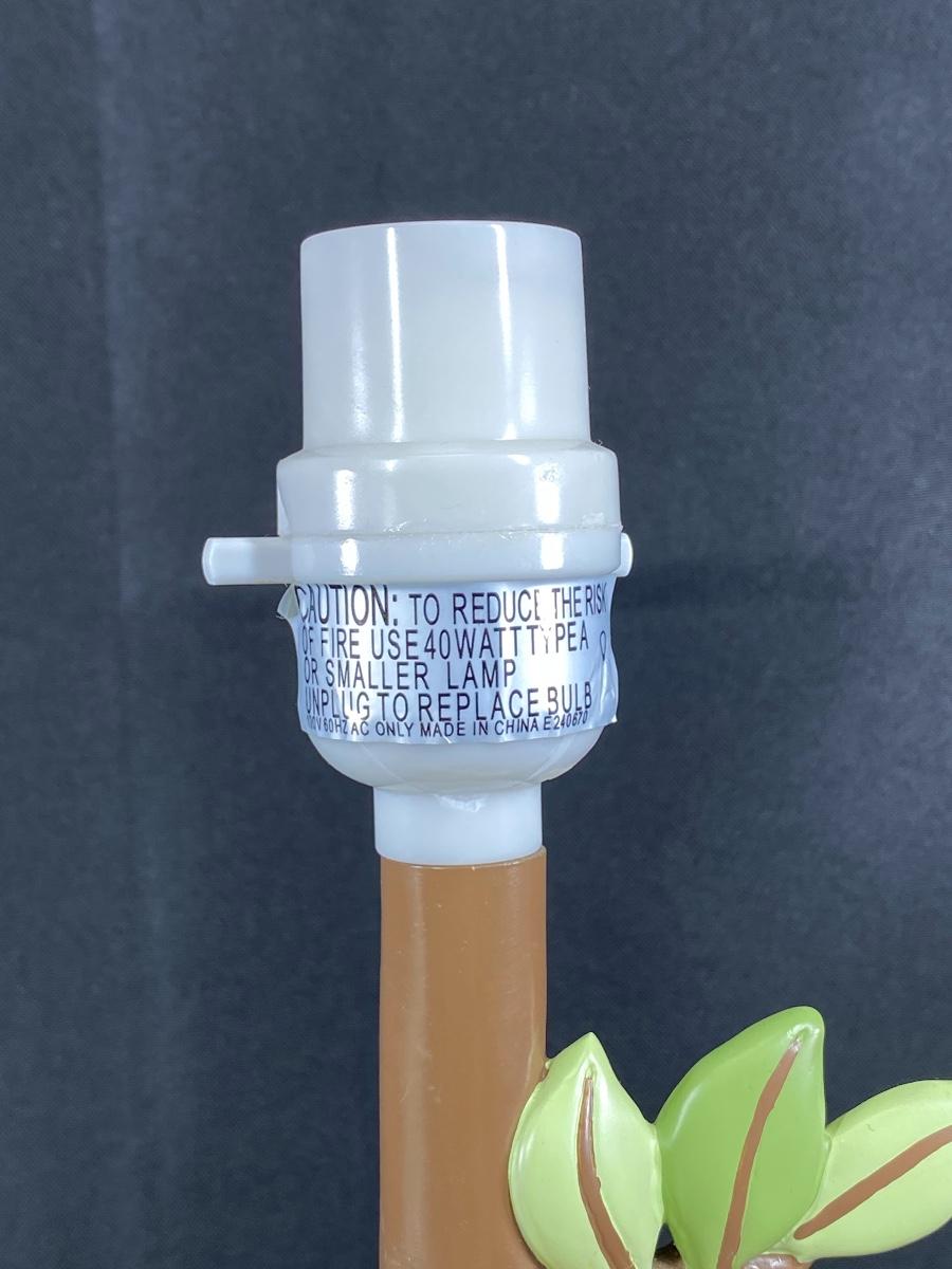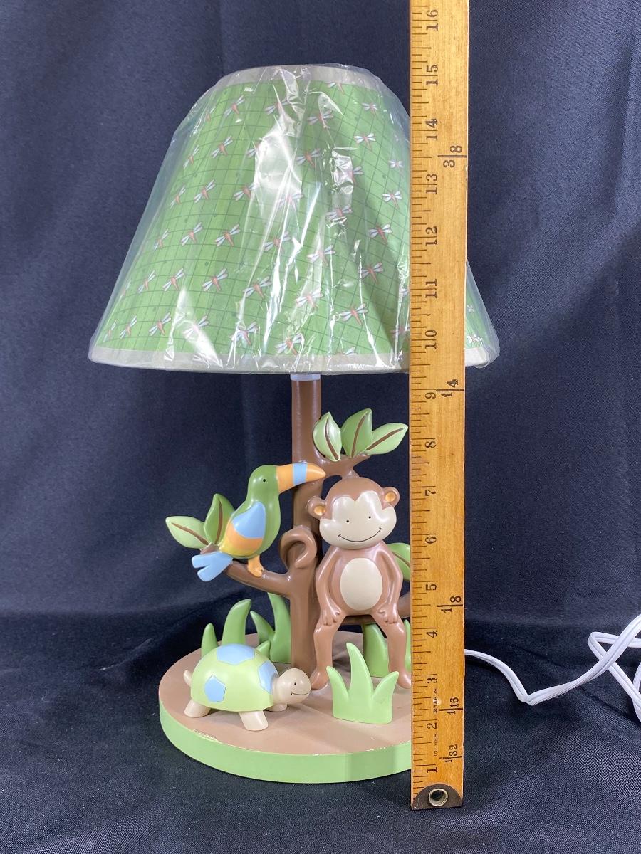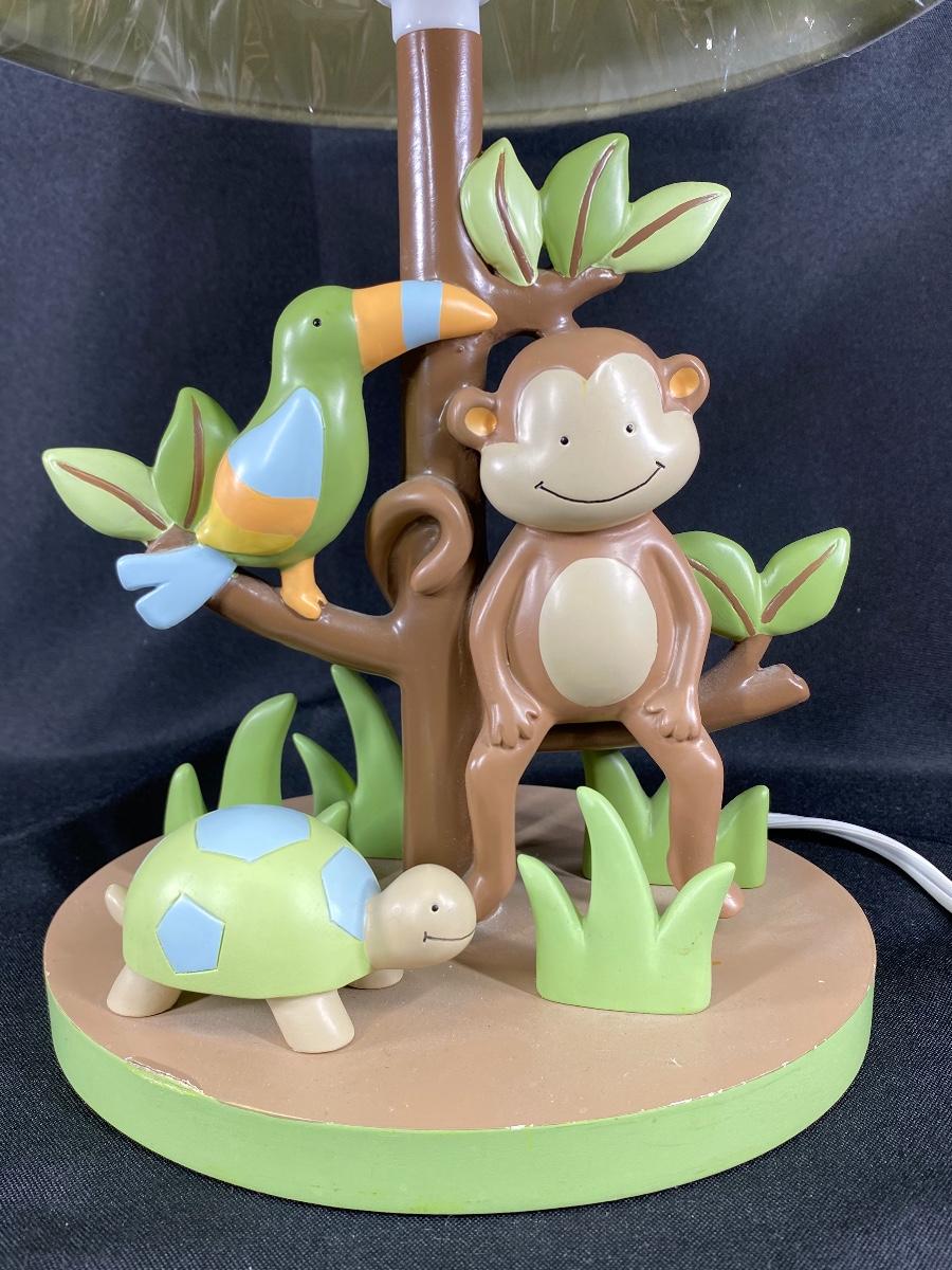 Jungle themed table lamp for a nursery or child's room. Shade is still in plastic. Push button on/off at the bulb. The prongs on plug are a little bent and there is a small scuff to the edge.