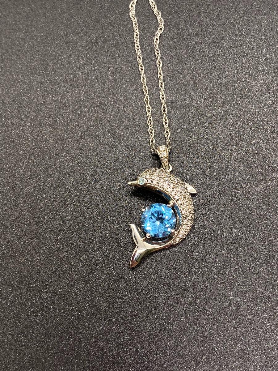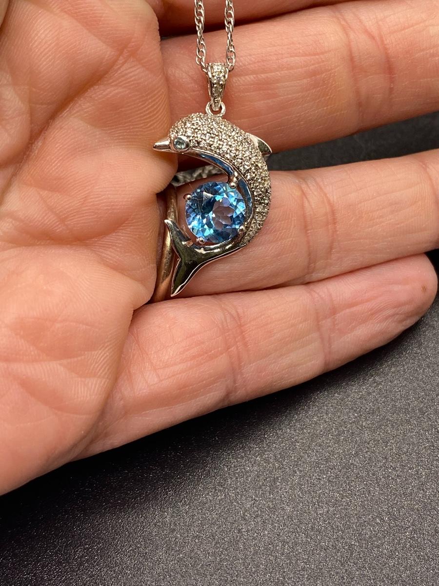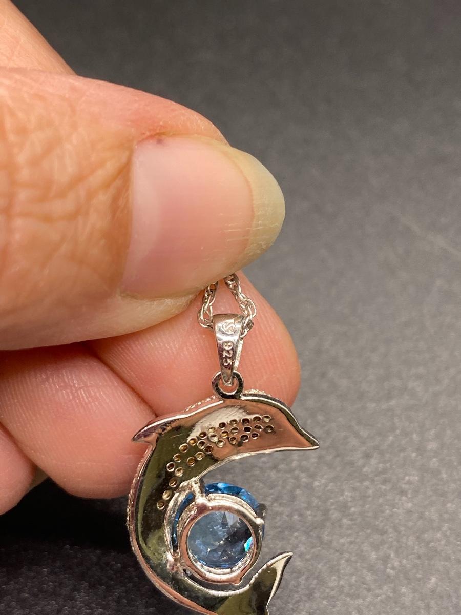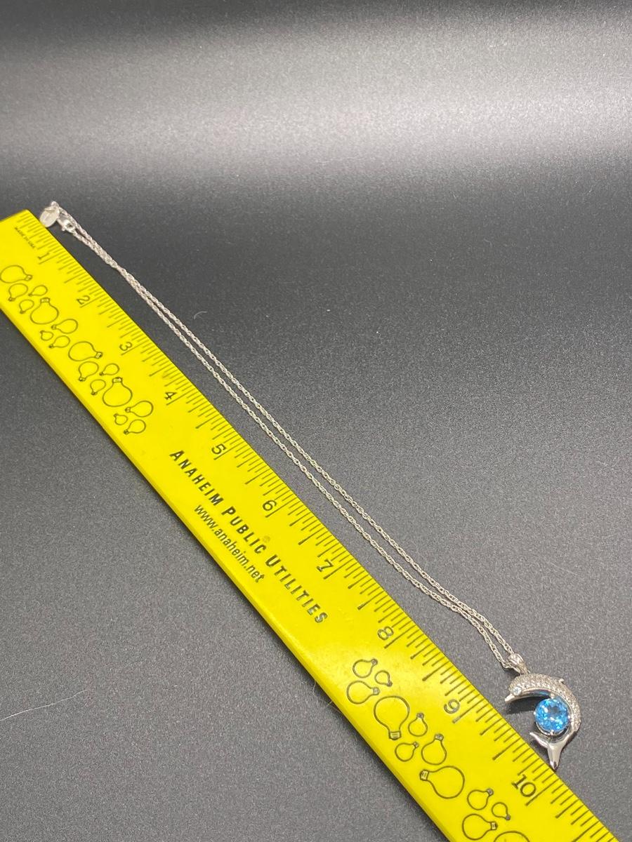 Sterling silver dolphin pendant necklace. CZ covered dolphin with a bright blue gemstone accent. About a 9" chain, charm is about 1" size.