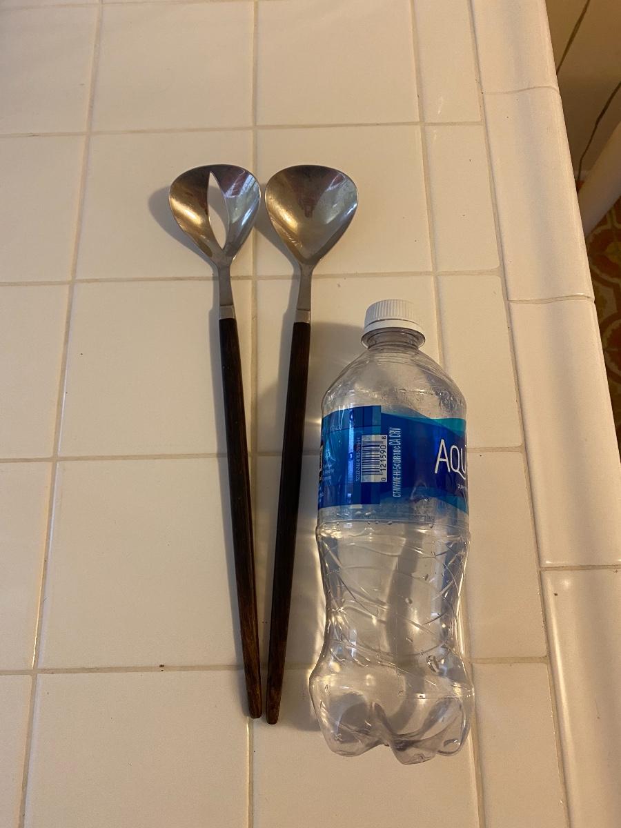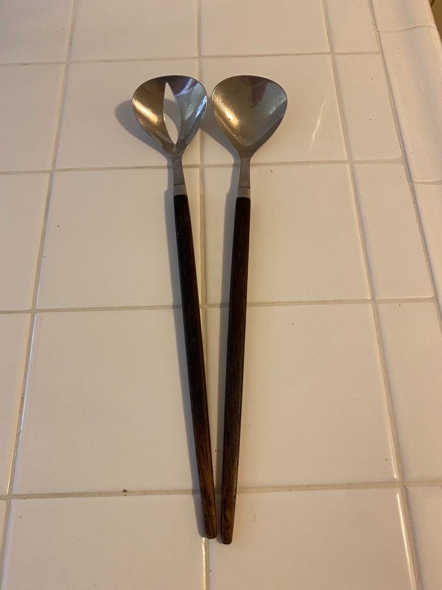 Vintage Mid Century Modern Wood Handle Salad Tongs. Wood is a little dry, more at the ends. Over 12" length. They are marked on the back but can not make out the name.