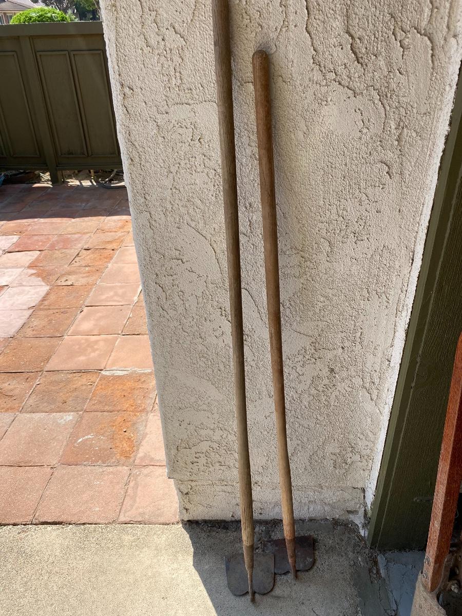 Pair of gardening hoes with two different sized handles, there is some use to the gardening tools.