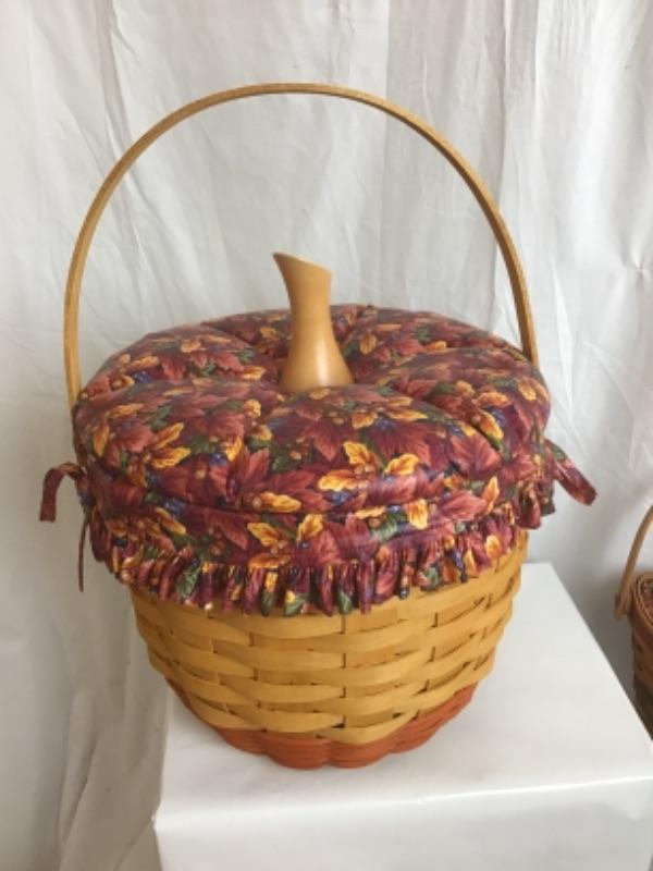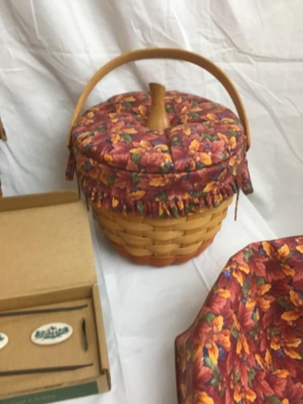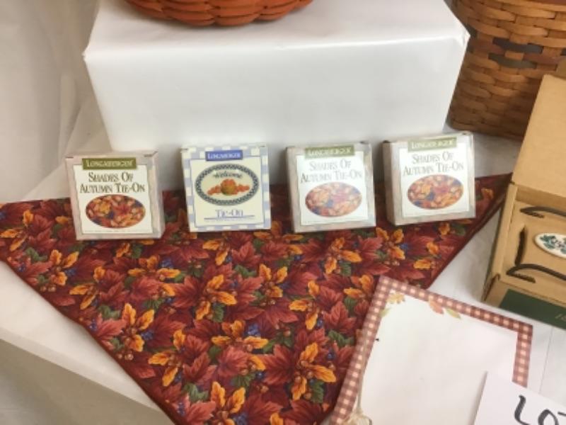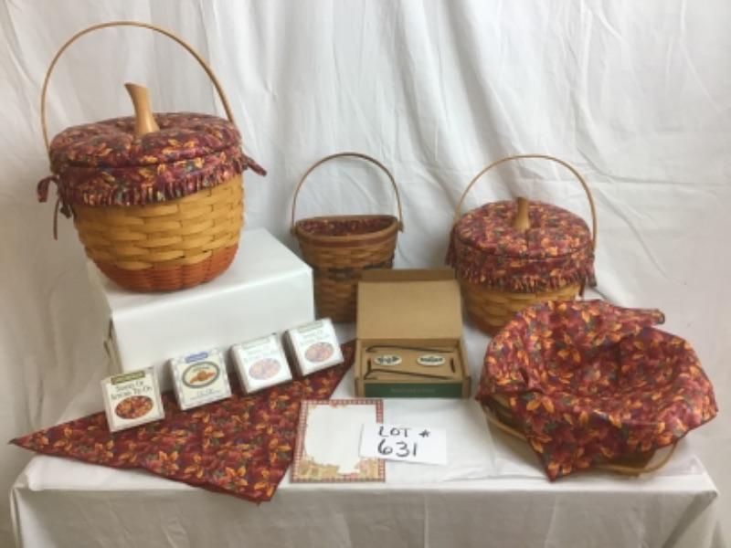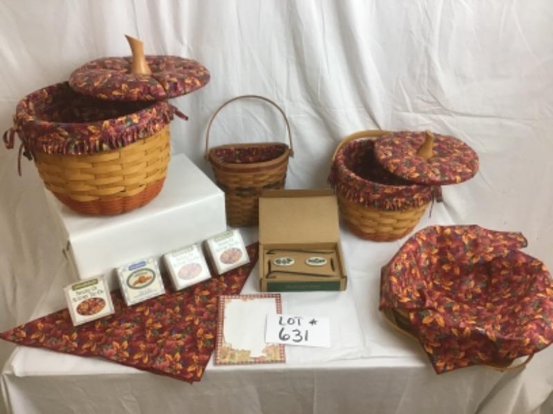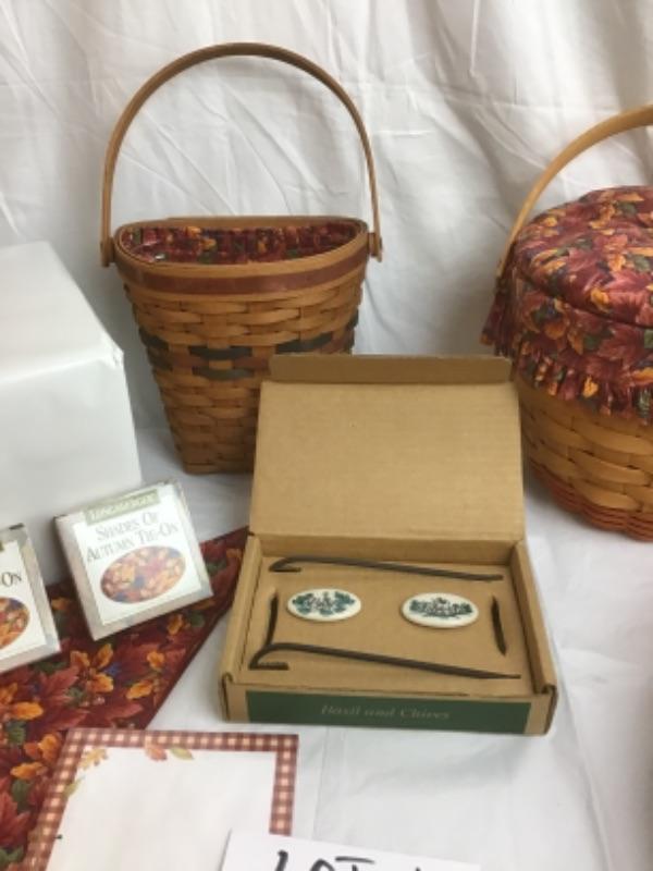 This lot has 4 Baskets, 2 have fabric covered lids, all have plastic liners, 3 have fabric liners as well. 4 Tie Ons, basil/chives porcelain tags