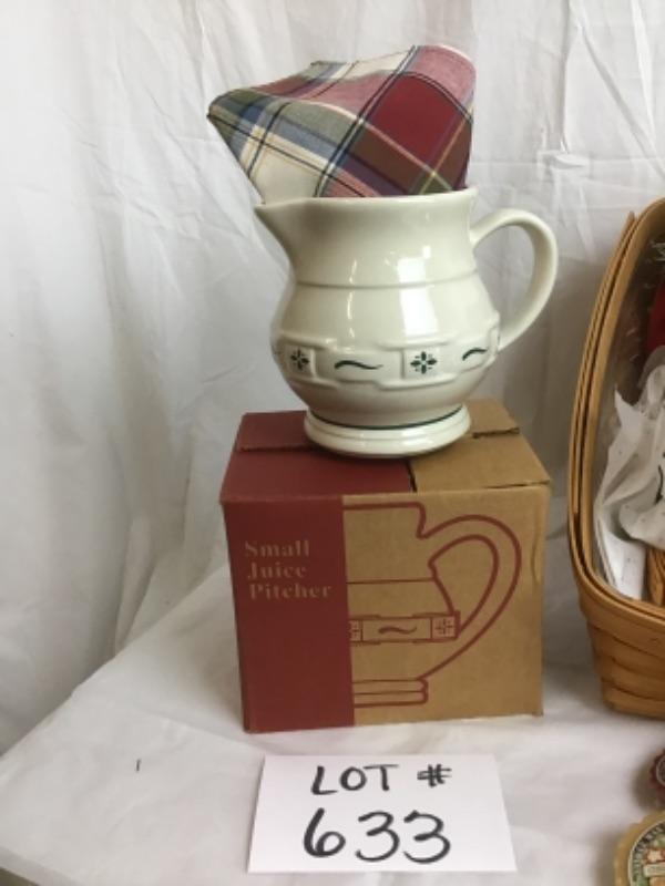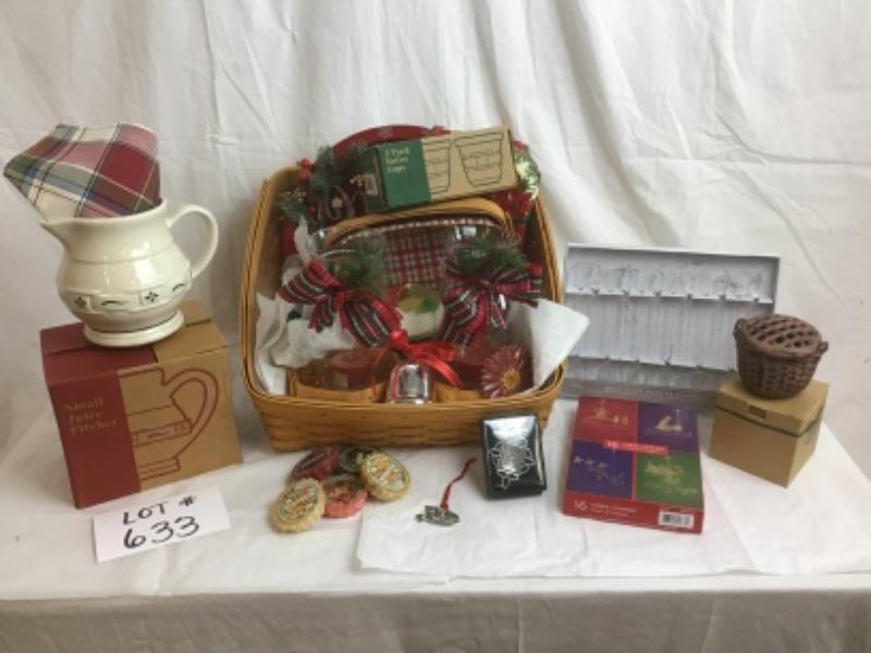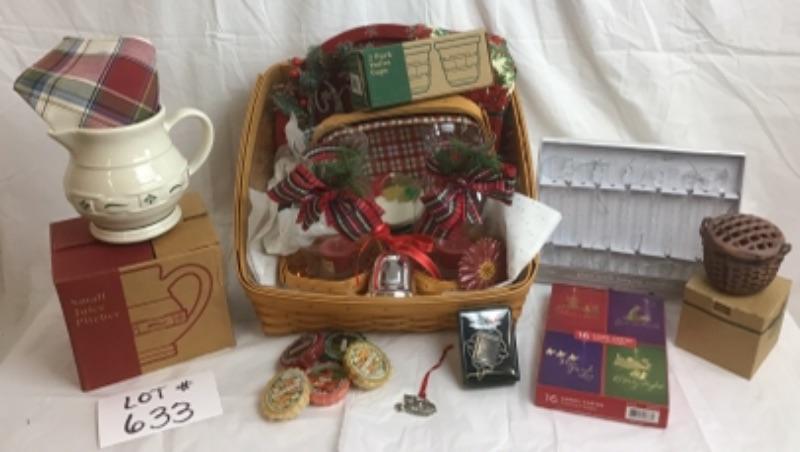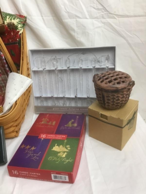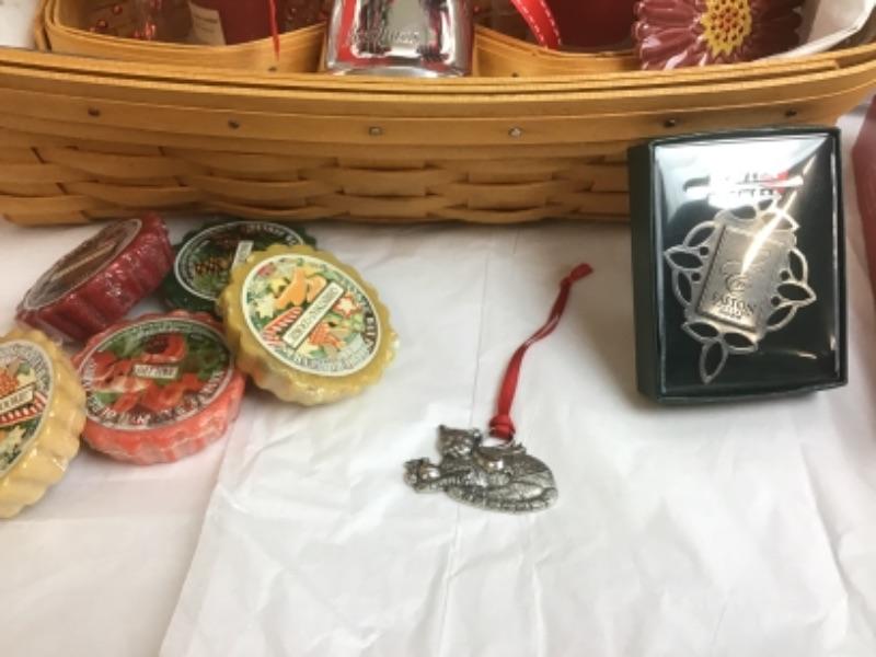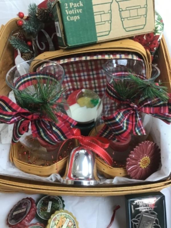 In here we have 2 Longaberger Baskets, (1 larger to hold the items & 1 smaller within to hold inner items ) 2 Longaberger Votives, 2 Decorative Globes, Christmas Serving Tray, Tea Towels, Longaberger Small Juice Pitcher, Blooming Basket Cache, Glass Icicle Hanging Ornaments, Christmas Cards, Yankee Potpourri Tart, Candle, & Salisbury Pewter Ornament