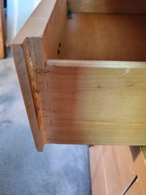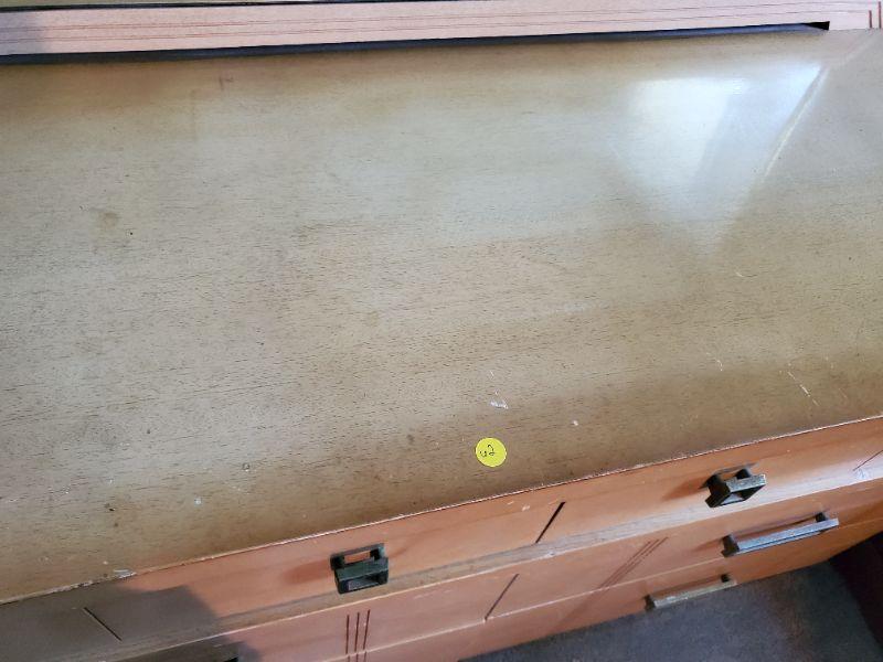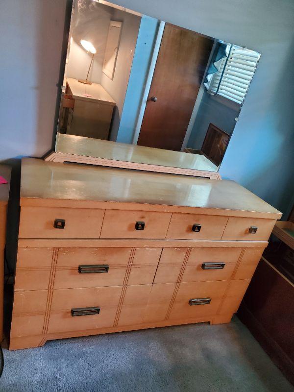 Blond wood dresser with mirror. Wear noted. Heavy, bring help to move.