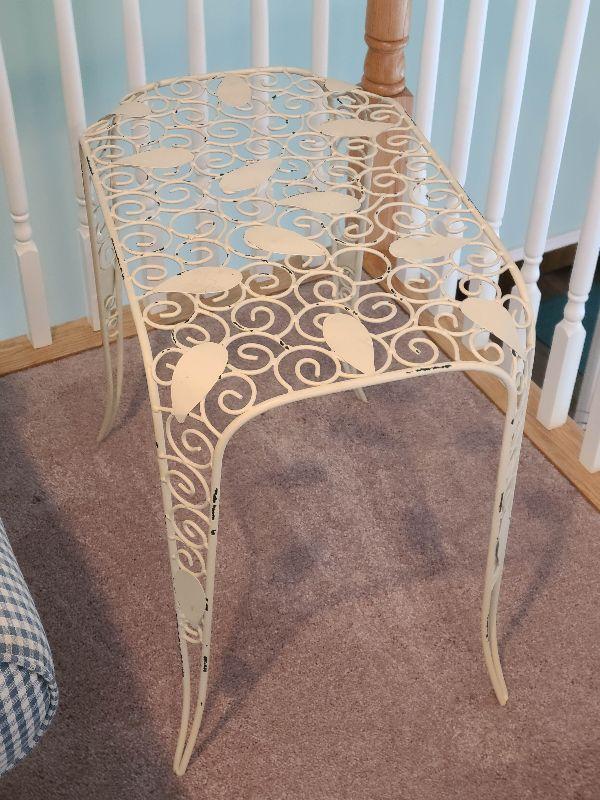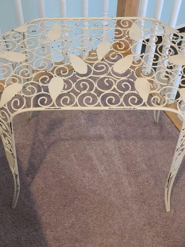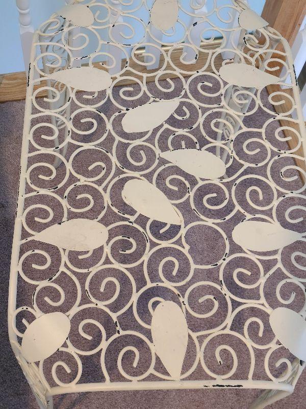 Metal Vine Table. Was used inside but would be perfect inside or out. Please see pictures for contents of the lot, condition of the lot, and any measurements of the item. This is not a heavy wrought iron table, more of a decorative side table. Thank you for looking and happy bidding!