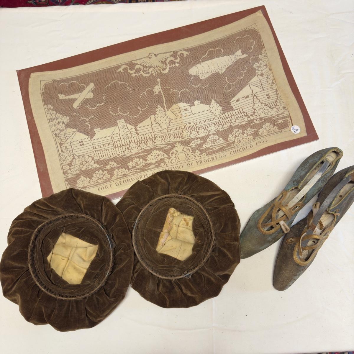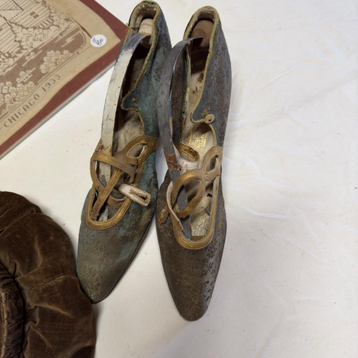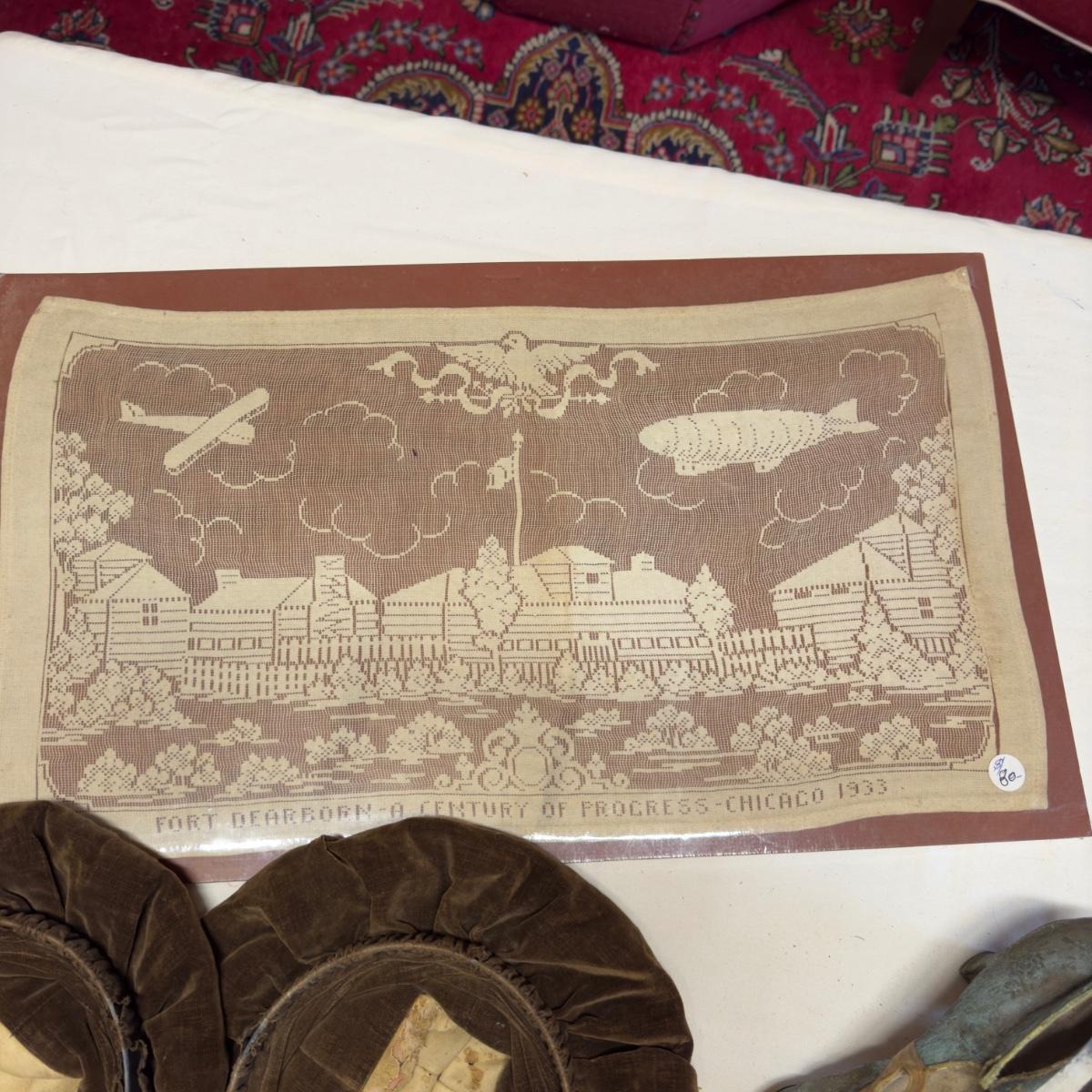 U1087 Antique Ladies Shoes, 1933 Lace Dresser Scarf Chicago Worlds Fair Souvenir
