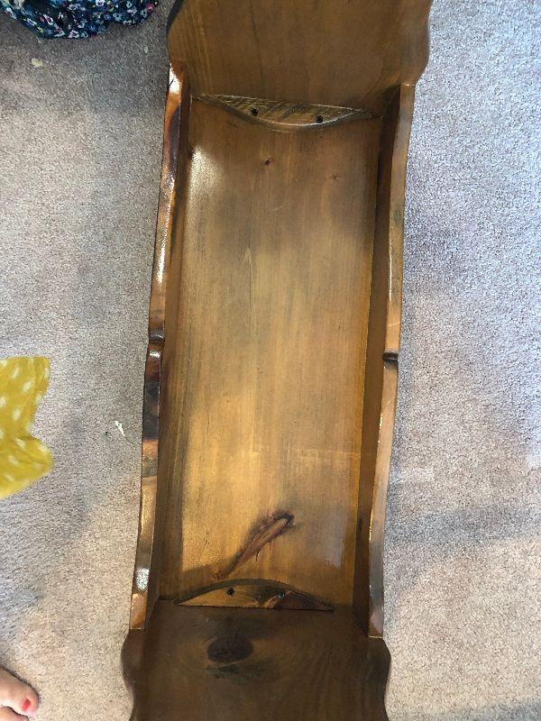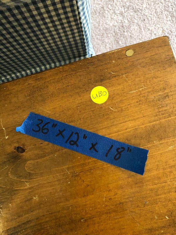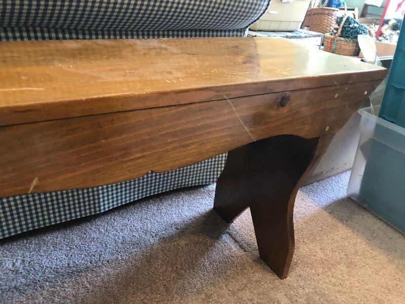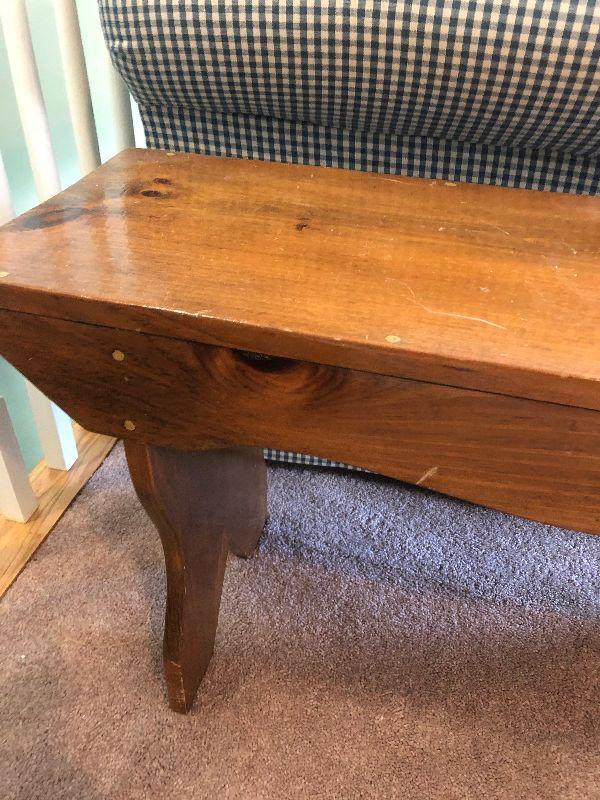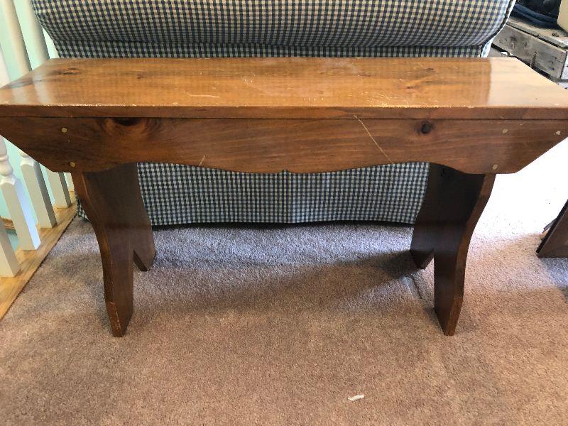 Small sized wood bench, you can see this fit perfectly next to the couch. Can be used anywhere in the home. Please see pictures for contents of the lot, condition of the lot, and any measurements of the item. Thank you for looking and happy bidding!
