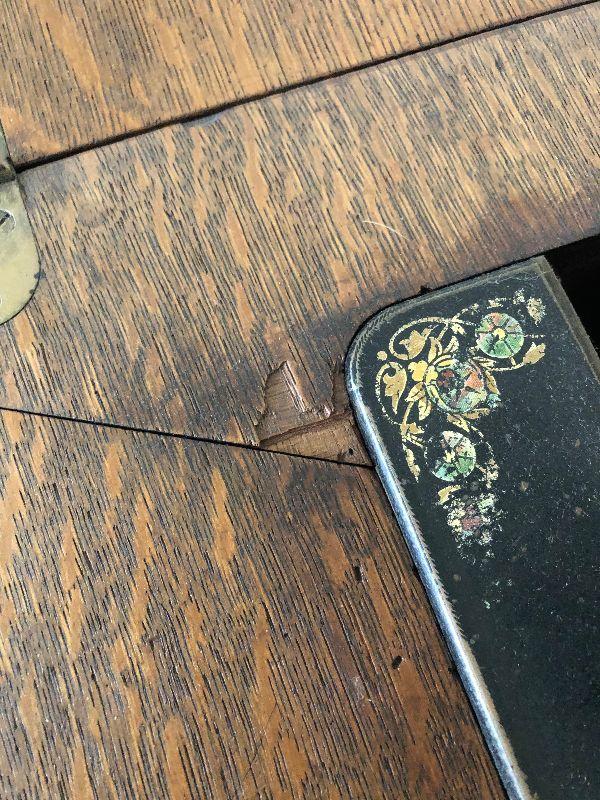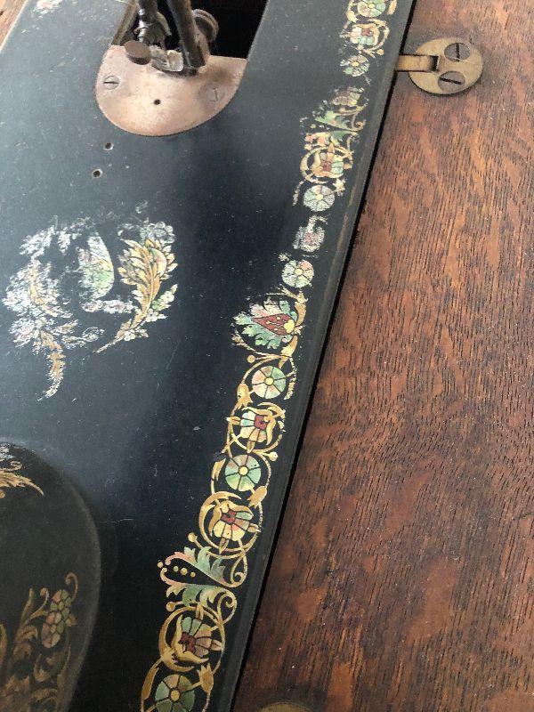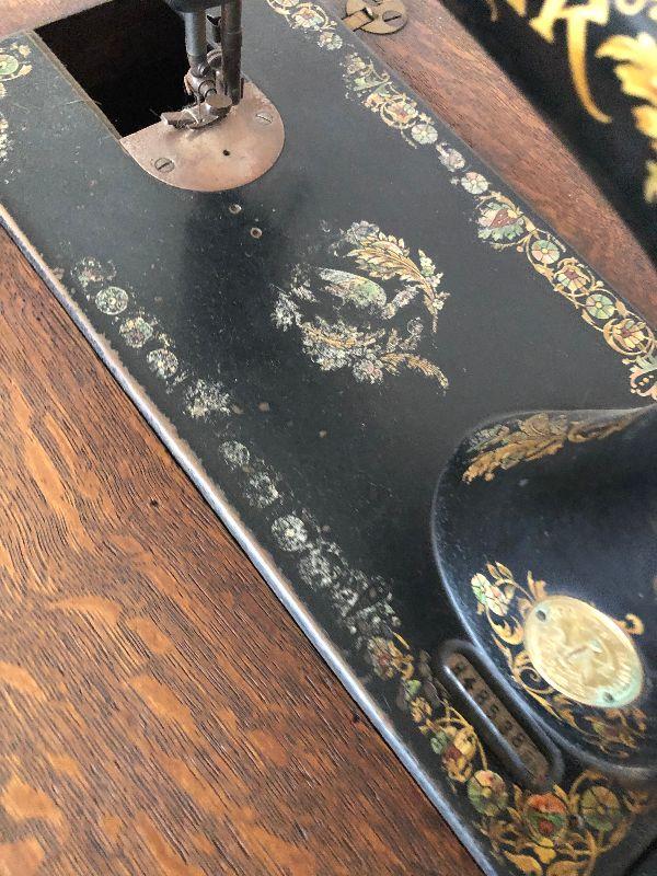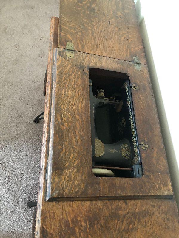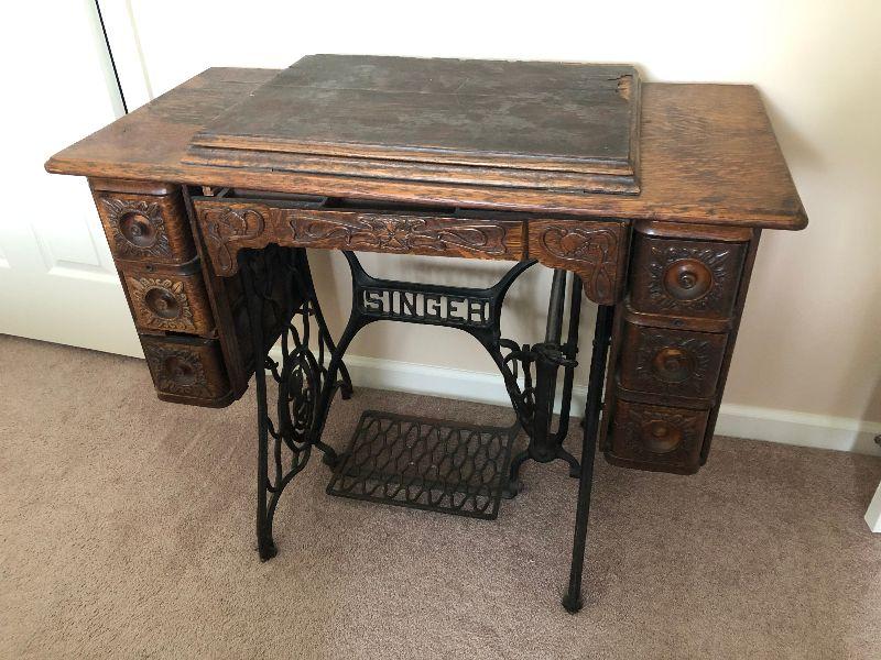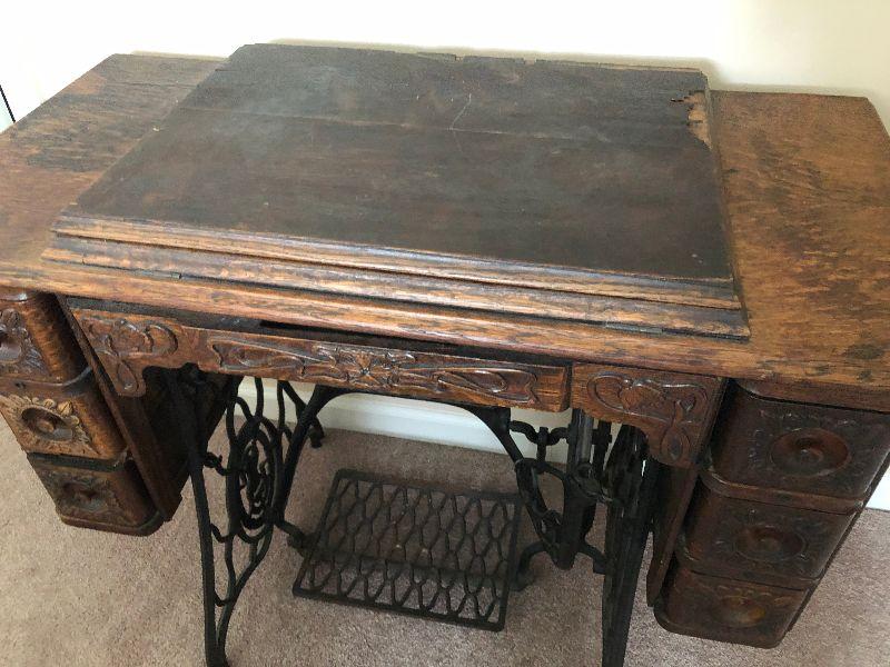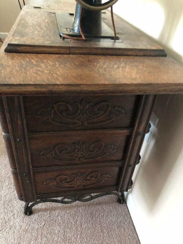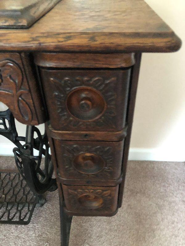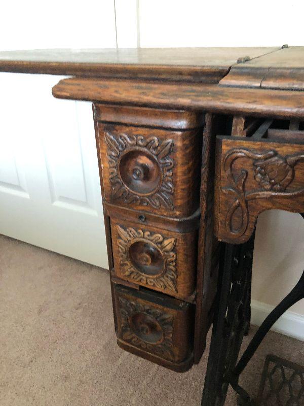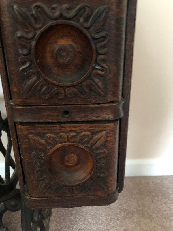 This is a beautiful sewing machine table! The drawers alone are worth it, it is hard to find the drawers with the scrolled woodwork designs on the side. Each drawer is a piece of art. Hard to find these in this condition. Does show wear, but it should for its age! Please bring a truck and someone to help you move! Great find. Please see pictures for contents of the lot, condition of the lot, and any measurements of the item. Thank you for looking and happy bidding!
