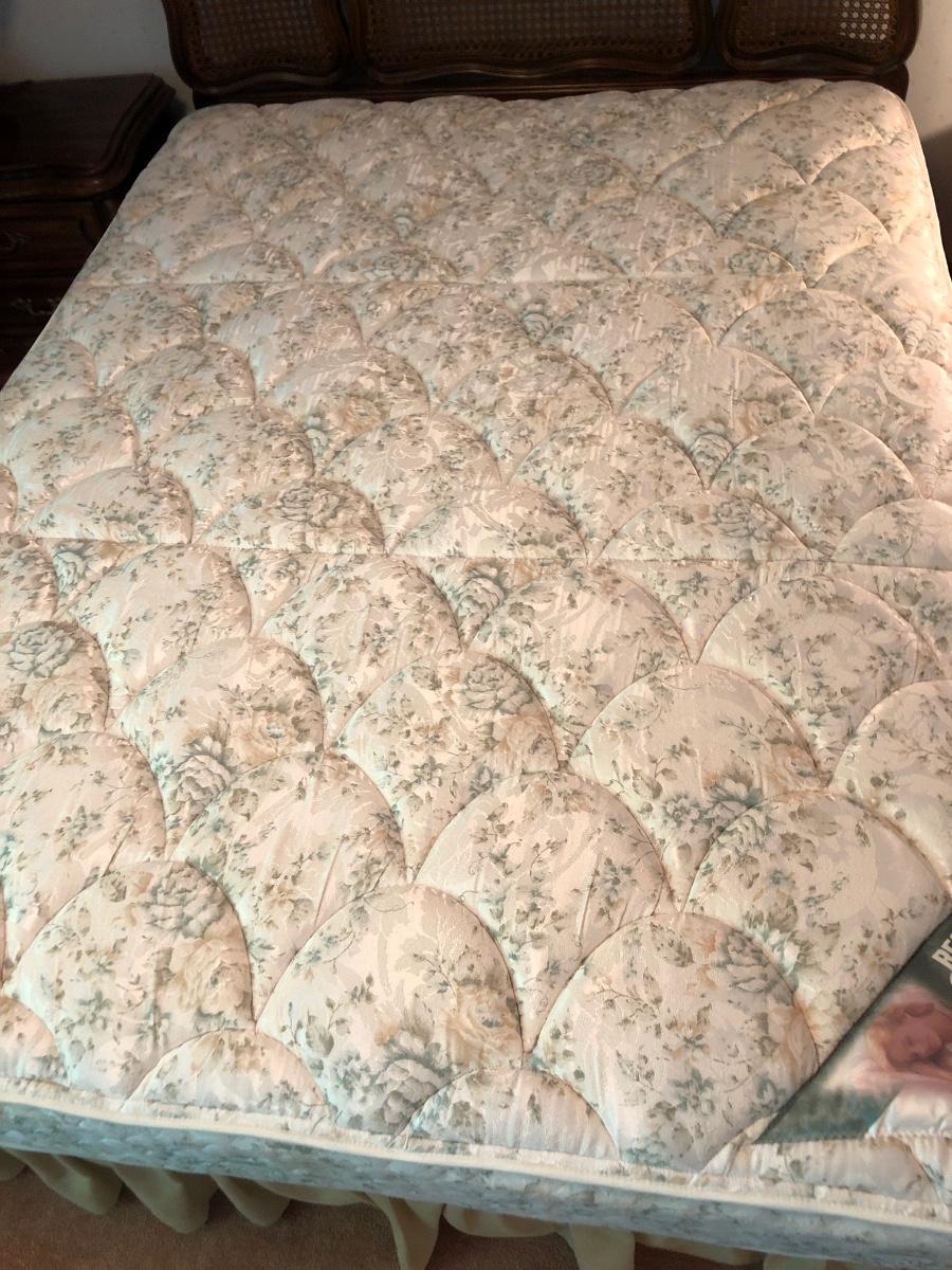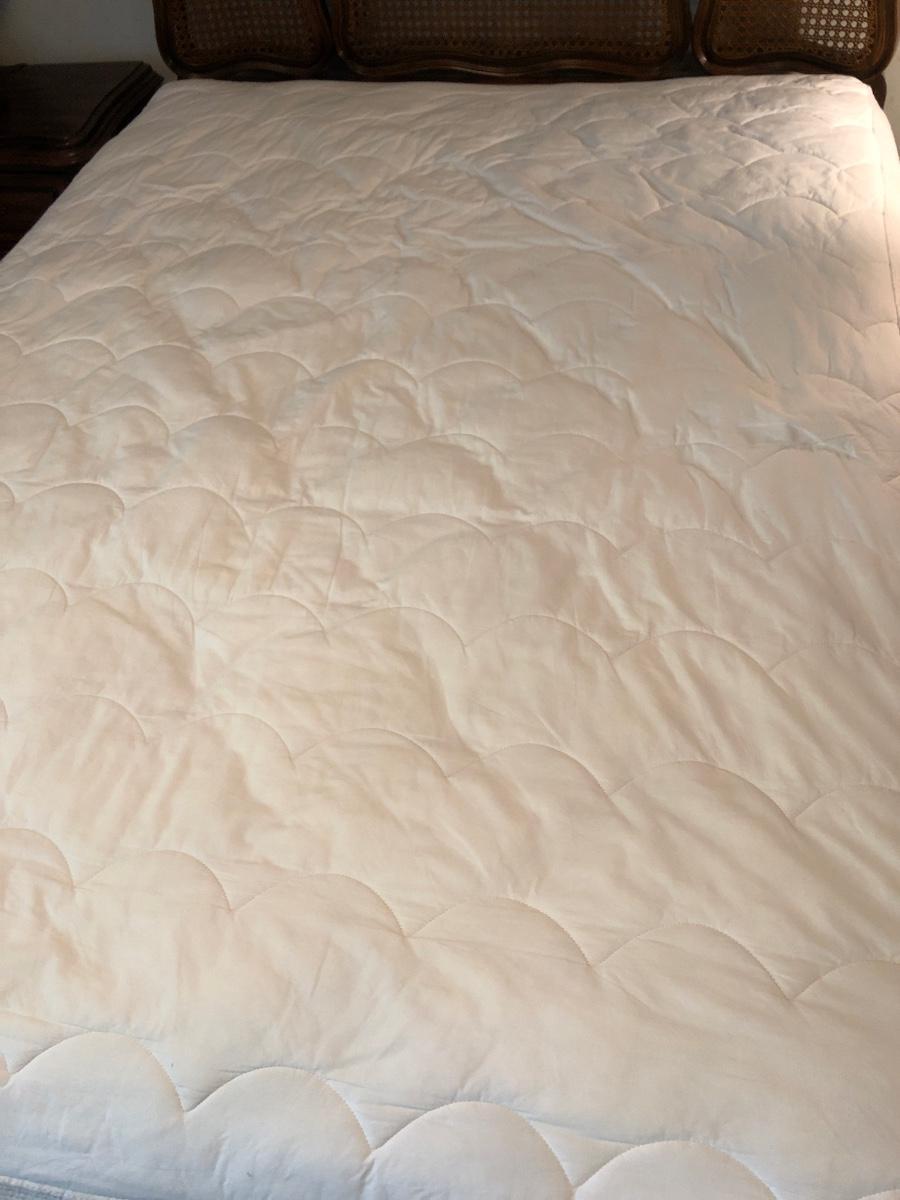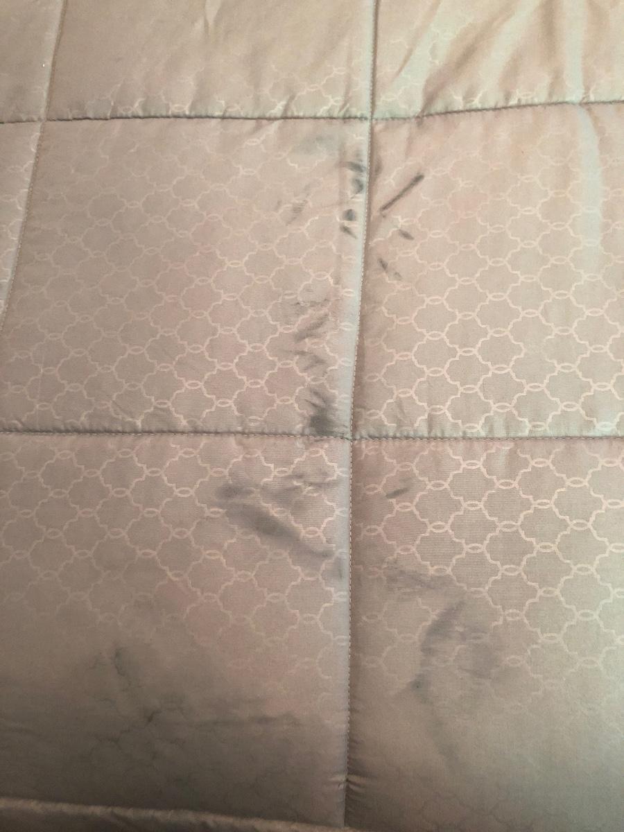 Beautiful! No visible stains on mattress, mattress pad, or duvet. Small stain on blue comforter & small pillows.See pics.