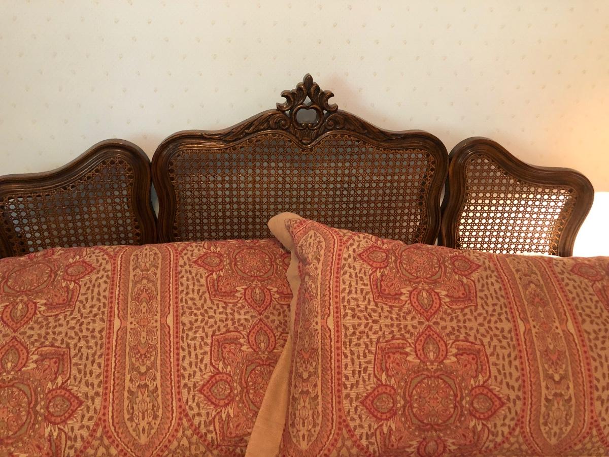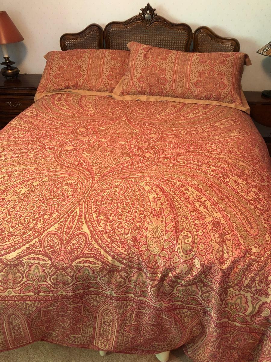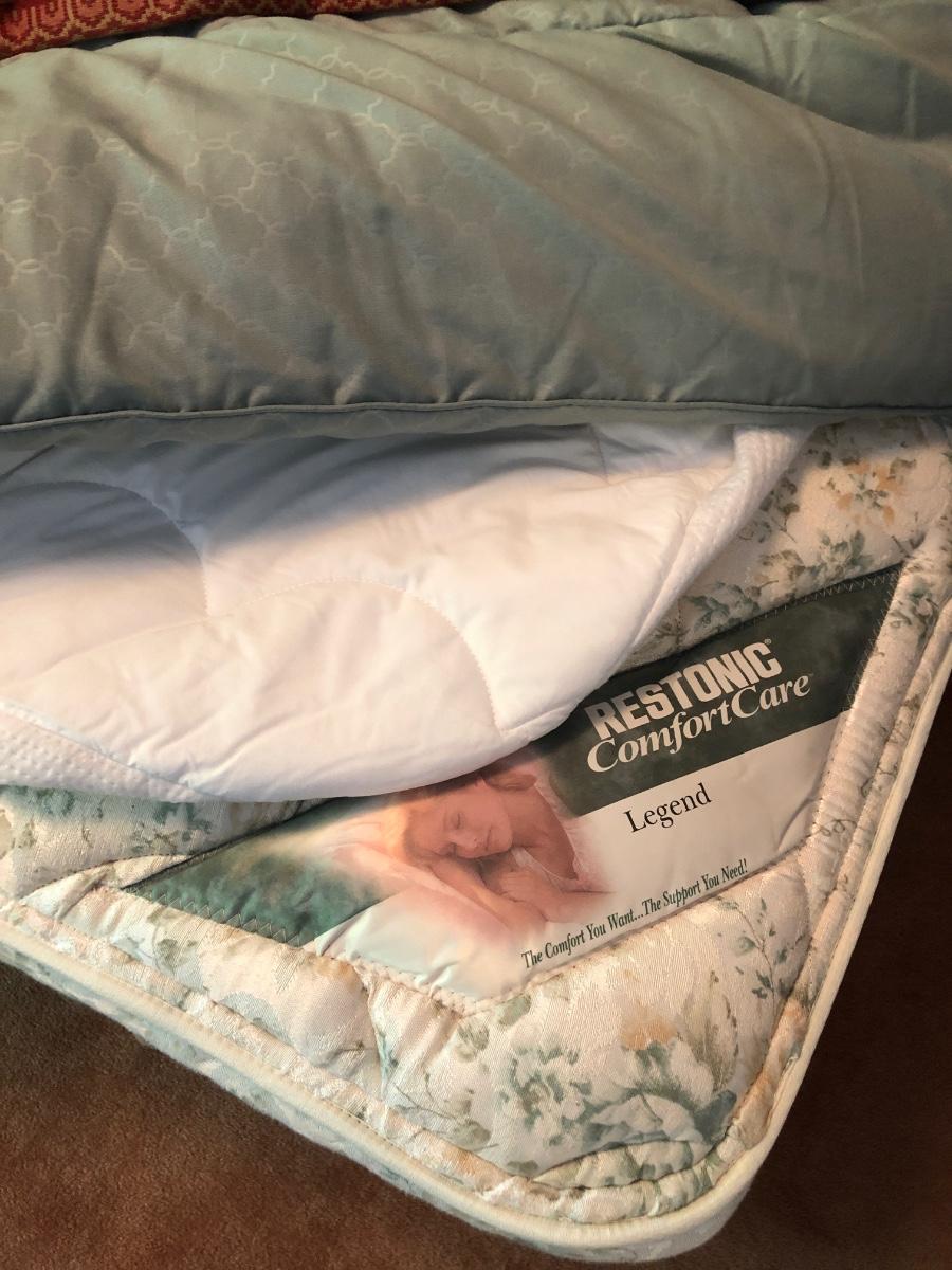 Beautiful! No visible stains on mattress, mattress pad, or duvet. Small stain on blue comforter & small pillows.See pics.