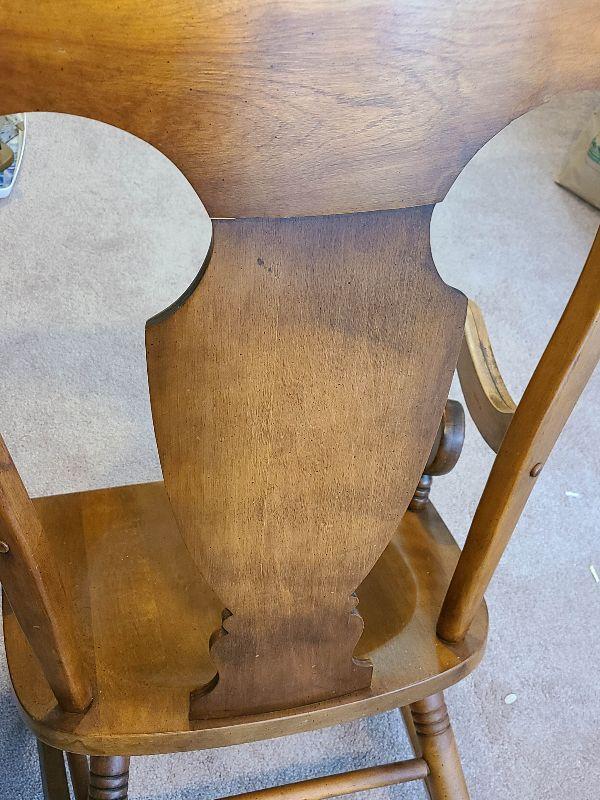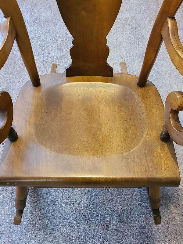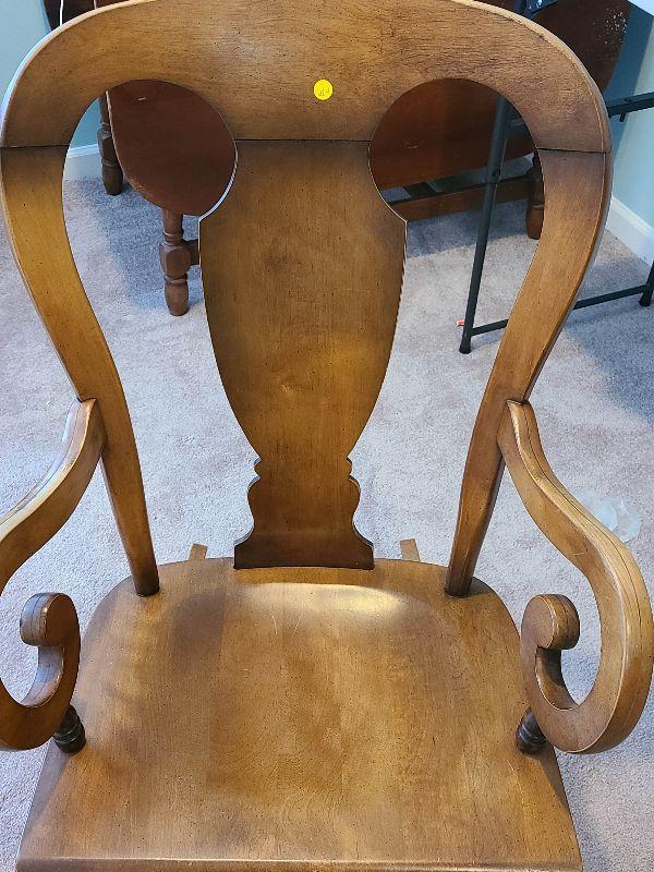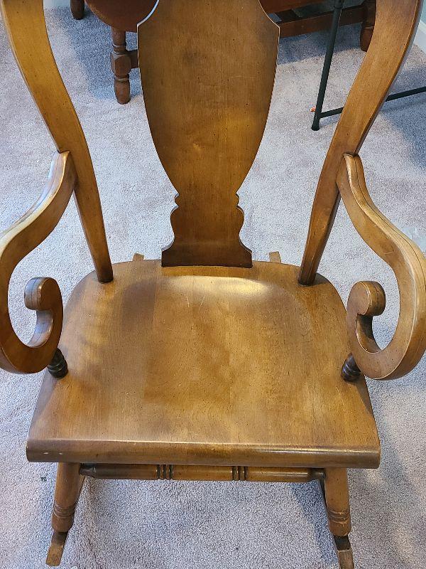 Vintage Full Size Rocking Chair. This is solid and has great bones. Please see pictures for contents of the lot, condition of the lot, and any measurements of the item. Thank you for looking and happy bidding!