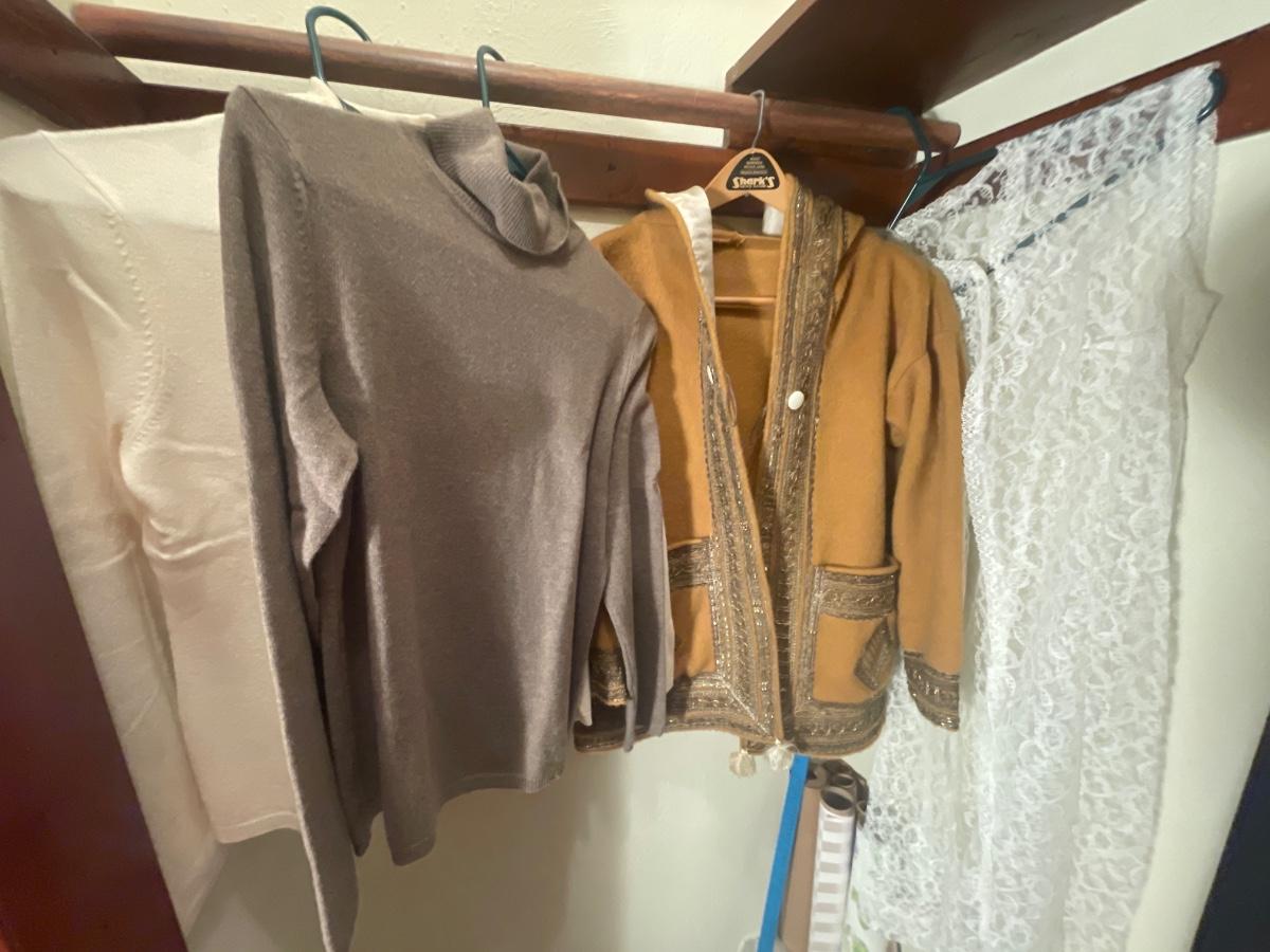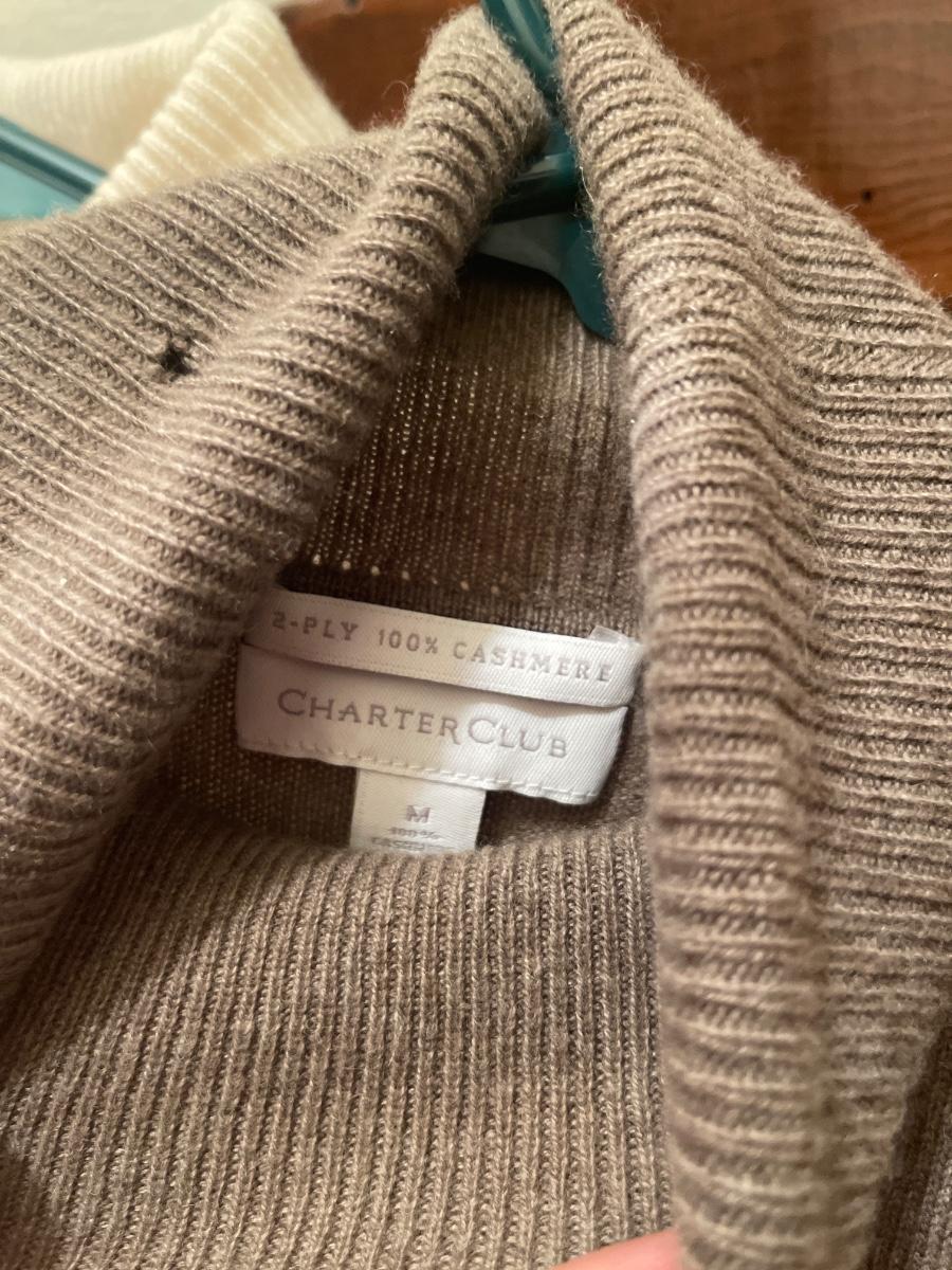 Two cashmere sweaters, one has a small hole in the turtleneck.