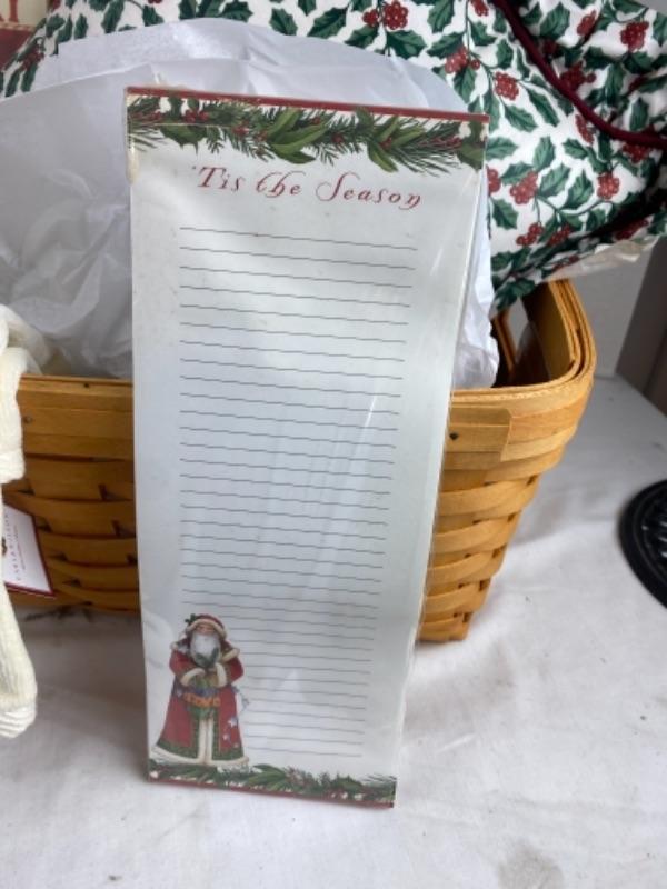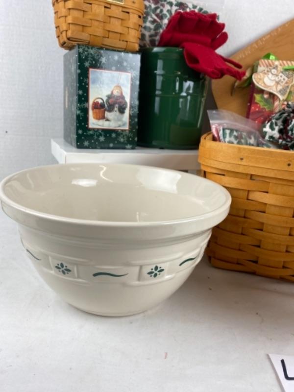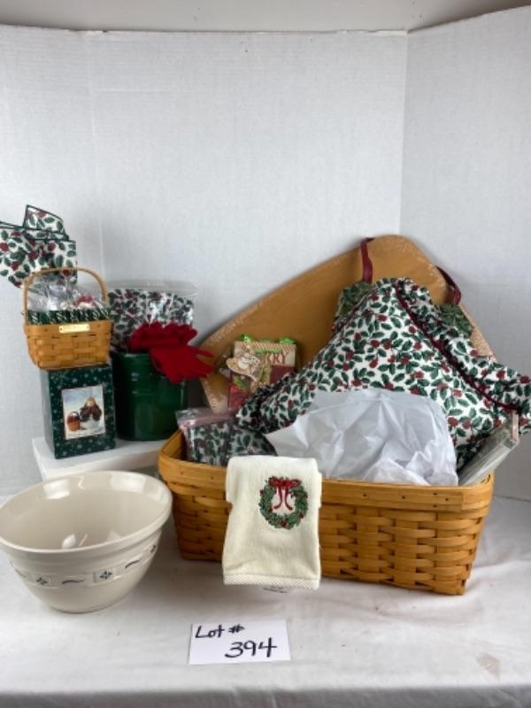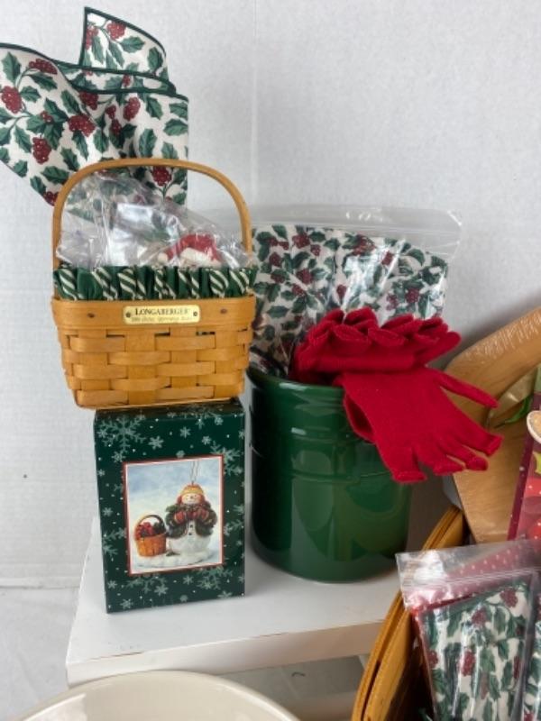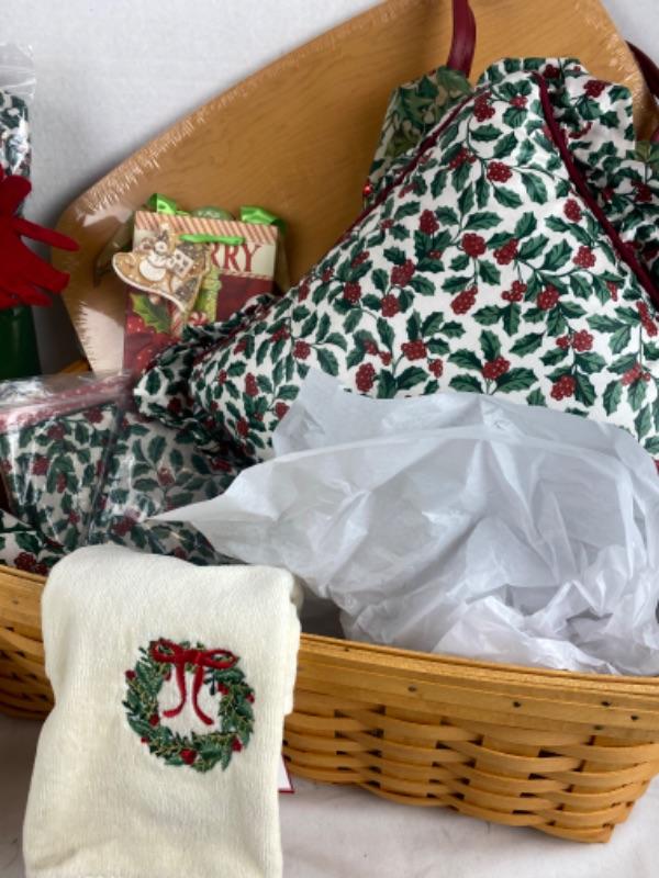 Longaberger large storage solutions basket with land comes with protective plastic insert measures 21 inches long by 16 1/2 inches wide by 8 inches deep comes with ornament holly tree skirt napkins, mixing bowl, large crack, dish towels, no pen