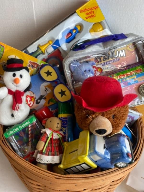 Longaberger Corn Basket with lid and protective insert full of children’s toys