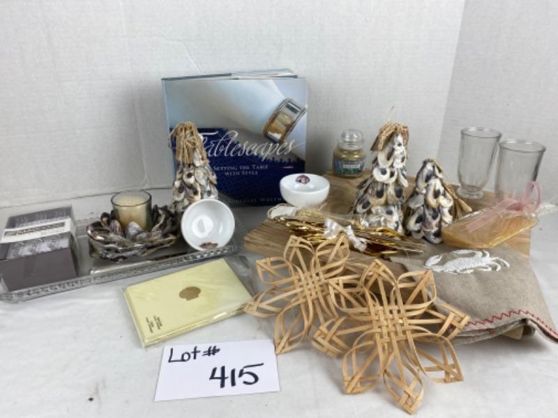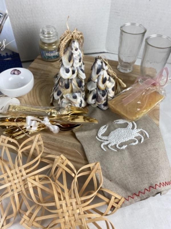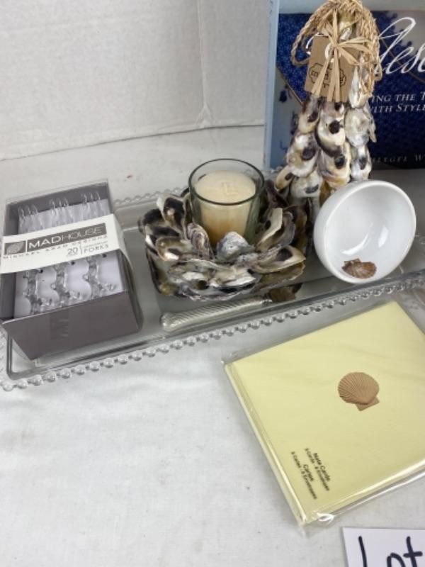 Mad house Michael Aram forks, oyster shell votive and miniature trees, wooden cheeseboard with dish towel, table scapes setting the table with style book, snowflake Ornaments, no cards with Shell motif