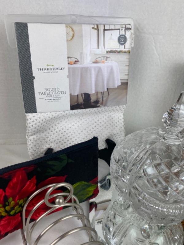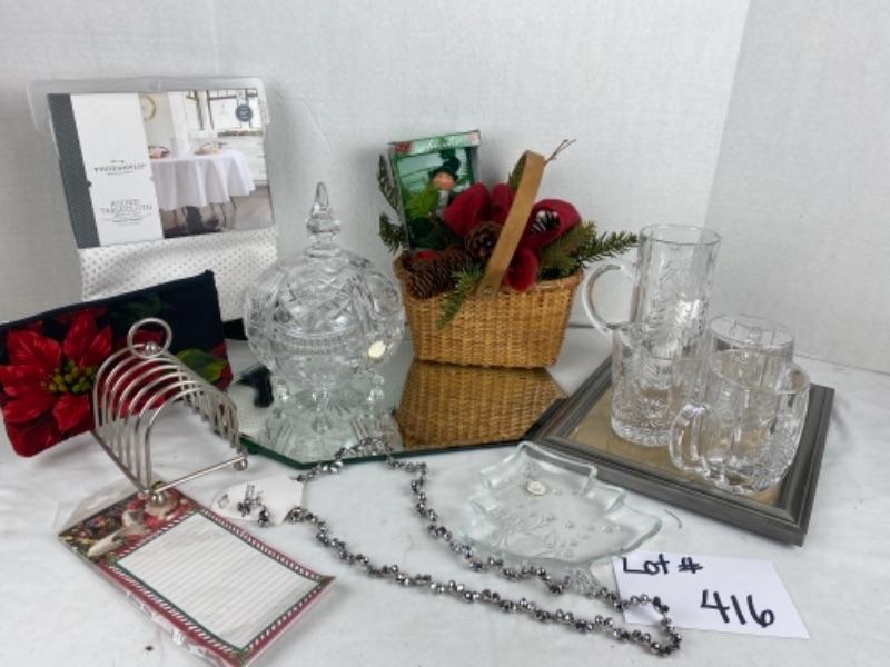 Glass covered dish to glass mugs with Christmas tree, one tall Christmas mug with Christmas tree, one gift basket with Anna Lee doll, round tablecloth by threshold, poinsettia zipper purse, no pad, silver necklace with matching earrings,
