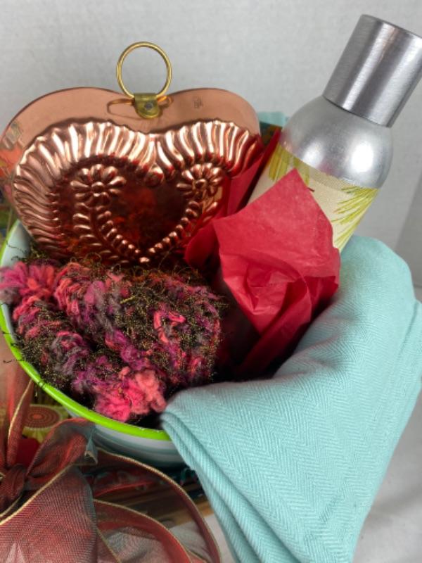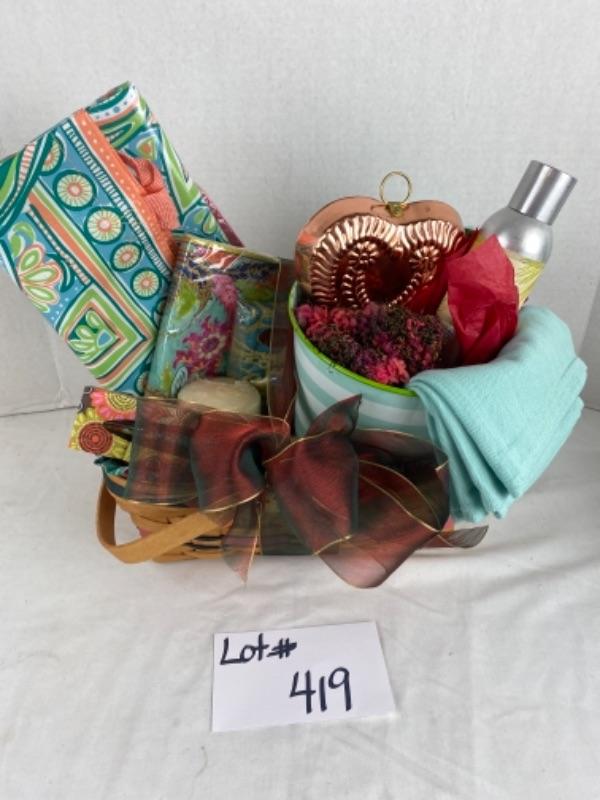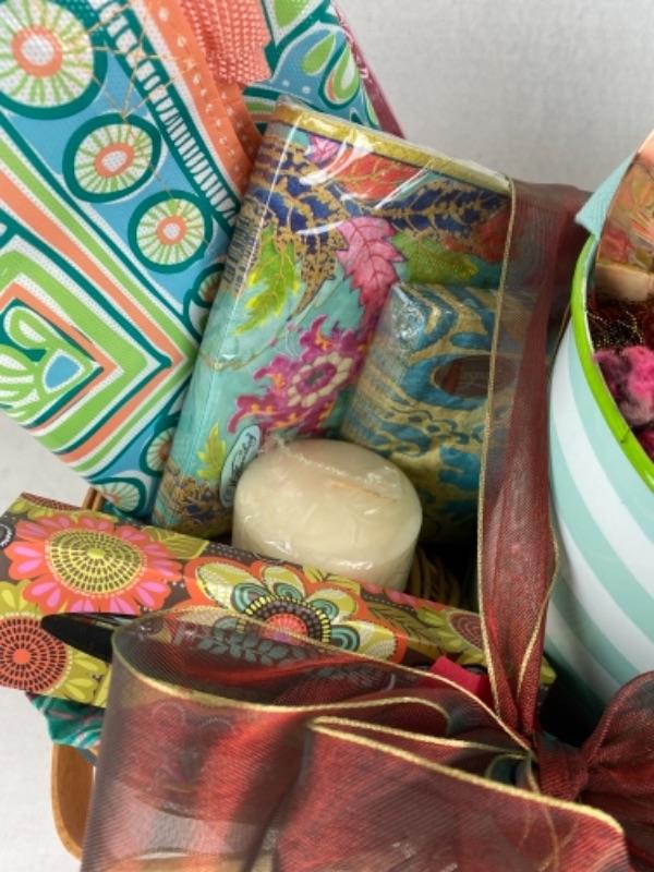 Longaberger copper gift basket with spray , tea towels, soaps, candles, napkins , totes , scarf , Vera Bradley pen and more