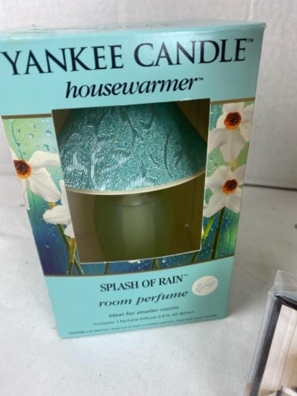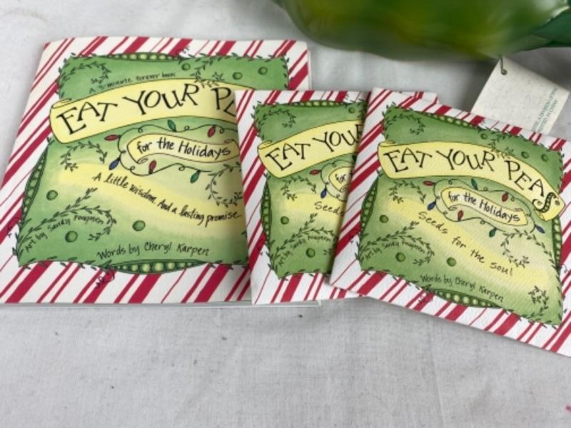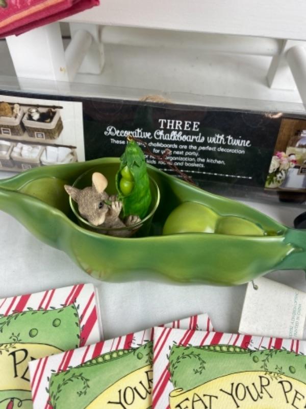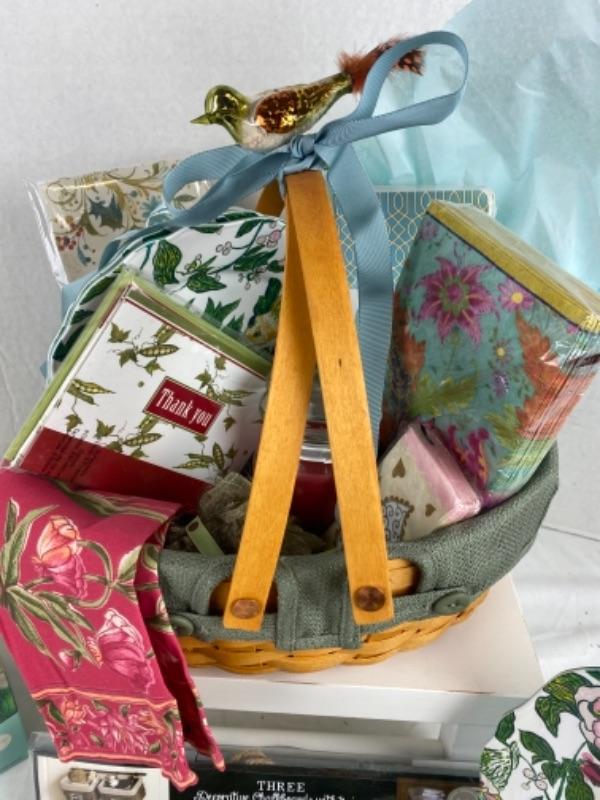 Longaberger Gift basket with eat your peas for the holidays packets, opal house melamine set of four salad plates napkins journals, Yankee candle house warmer, and much more