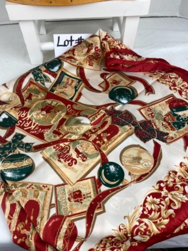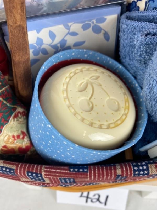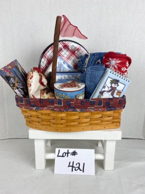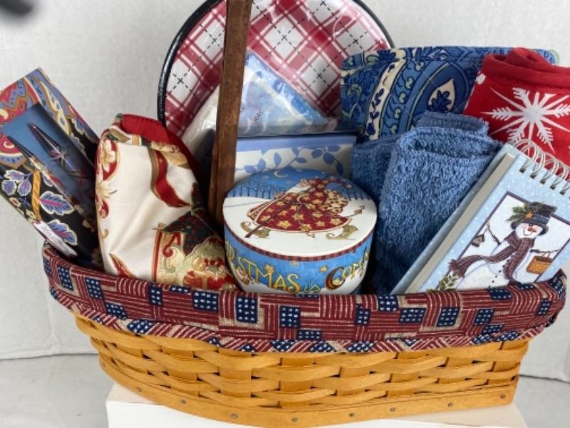 Longaberger boat basket filled with Vera Bradley ink pen , silk Christmas scarf, paper products, Christmas soap by Mary Inglebritt, note pan wash clause oven mitts by April Cornell
