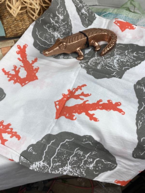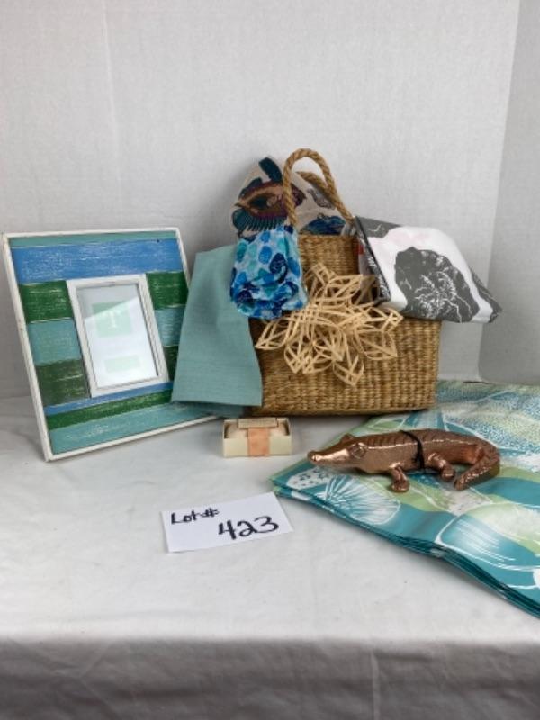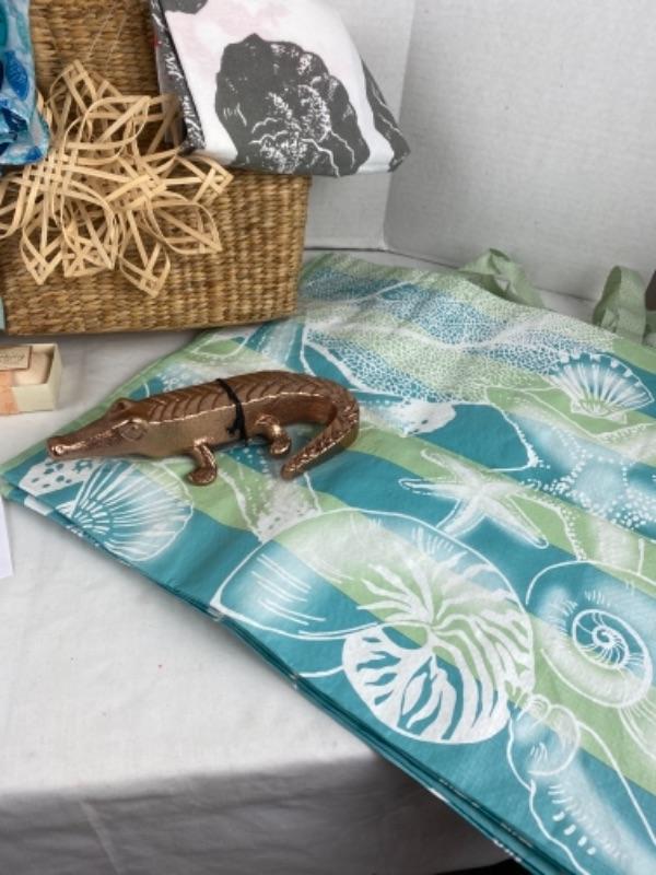 Beach theme gift basket with ornaments Decorative alligator in copper color, several shell totes, twos company frame, Tea towel , scarf, and much more
