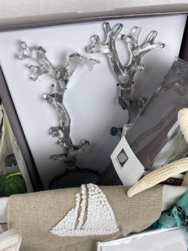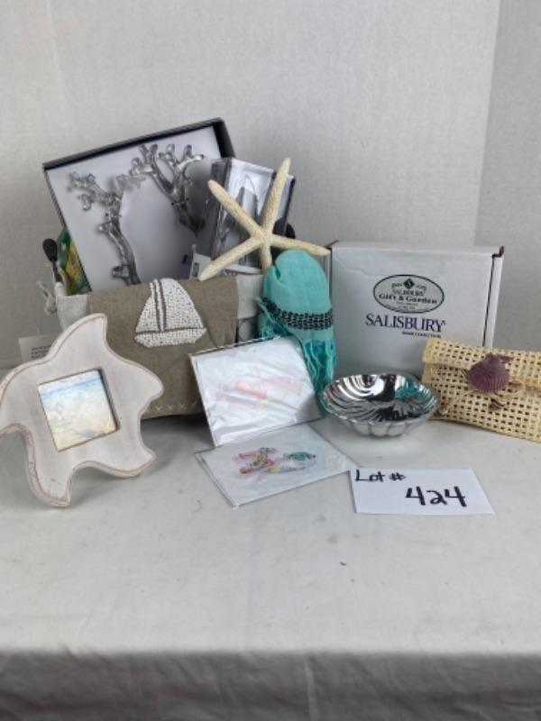 A shore thing wired gift basket lot with coral salad servers Salisbury pewter shell ““ note cards, tea towels, scarf, candles, frame,